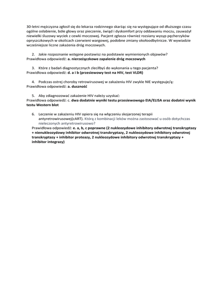 30-letni mężczyzna zgłosił się do lekarza rodzinnego skarżąc się na występujące od dłuższego czasu ogólne osłabienie, bóle głowy oraz pieczenie, świąd i dyskomfort przy oddawaniu moczu, zauważył niewielki śluzowy wyciek z cewki moczowej. Pacjent zgłasza również rozsiany wysyp pęcherzyków opryszczkowych w okolicach czerwieni wargowej, podobne zmiany okołoodbytnicze. W wywiadzie wcześniejsze liczne zakażenia dróg moczowych. 2. Jakie rozpoznanie wstępne postawisz na podstawie wymienionych objawów? Prawidłowa odpowiedź: a. nierzeżączkowe zapalenie dróg moczowych 3. Które z badań diagnostycznych zleciłbyś do wykonania u tego pacjenta? Prawidłowa odpowiedź: d. a i b (przesiewowy test na HIV, test VLDR) 4. Podczas ostrej choroby retrowirusowej w zakażeniu HIV zwykle NIE występuje/ą: Prawidłowa odpowiedź: a. duszność 5. Aby zdiagnozować zakażenie HIV należy uzyskać: Prawidłowa odpowiedź: c. dwa dodatnie wyniki testu przesiewowego EIA/ELISA oraz dodatni wynik testu Western blot 6. Leczenie w zakażeniu HIV opiera się na włączeniu skojarzonej terapii antyretrowirusowej(cART). Którą z kombinacji leków można zastosować u osób dotychczas nieleczonych antyretrowirusowo? Prawidłowa odpowiedź: e. a, b, c poprawne (2 nukleozydowe inhibitory odwrotnej transkryptazy + nienukleozydowy inhibitor odwrotnej transkryptazy, 2 nukleozydowe inhibitory odwrotnej transkryptazy + inhibitor proteazy, 2 nukleozydowe inhibitory odwrotnej transkryptazy + inhibitor integrazy)
