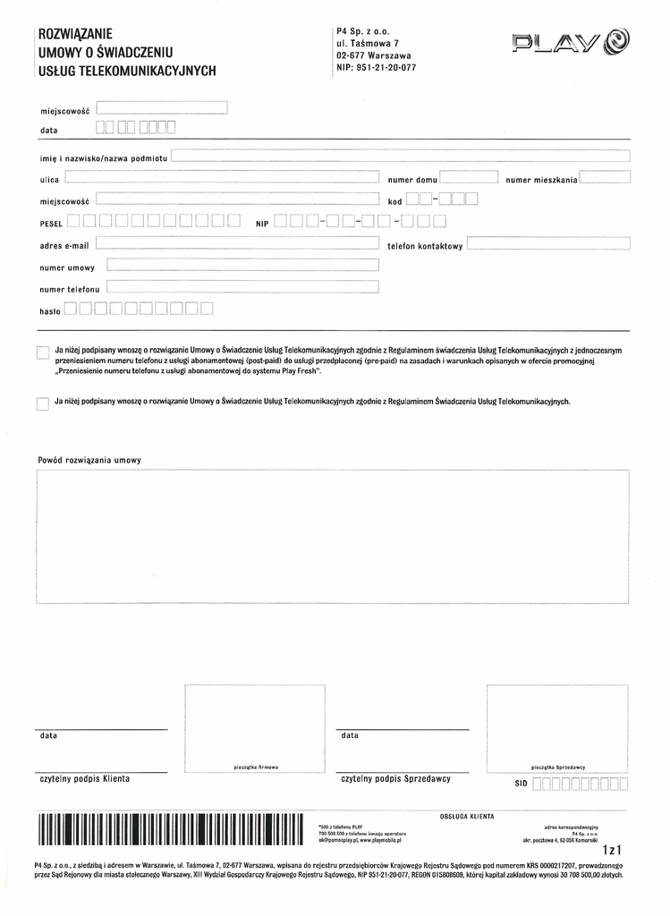 P4 Sp. z ROZWIĄZANIE UMOWY O ŚWIADCZENIU USŁUG TELEKOMUNIKACYJNYCH ul. 0.0. Taśmowa 7 02-677 Warszawa NIP: 951-21-20-077 miejscowość data imię i nazwisko/nazwa podmiotu J L numer ulica mieszkania L _ miejscowość PESEl adres t e I et o n kontaktowy e-mail numer ,___ __ __ _ umowy hasło Ja niżej podpisany przeniesieniem "Przeniesienie numeru Ja niżej podpisany Powód rozwiązania wnoszę o rozwiązanie numeru telefonu telefonu Umowy o Świadczenie z usługi abonamentowej z usługi abonamentowej wnoszę o rozwiązanie Usług Telekomunikacyjnych (post-paid) do usługi przedpłaconej do systemu Umowy o Świadczenie zgodnie z Regulaminem (pre-paid) świadczenia na zasadach Usług Telekomunikacyjnych i warunkach opisanych z jednoczesnym w ofercie promocyjnej Play Fresh". Usług Telekomunikacyjnych zgodnie z Regulaminem Świadczenia Usług Telekomunikacyjnych. umowy data data czytelny podpis Klienta ---- pieczątka -- firmowa pieczątka - ----------------, czytelny podpis Sprzedawcy OBSŁUGA 1111111111111111111111111111111111111111111111111111111111111111 *500 z telefonu PLAY 790500500 z telefonu innego operatora [email protected], www.playmobile.pl Sprzedawcy SIO KLIENTA adres korespondencyjny P4Sp.z 0.0. skr. pocztowa 4, 62·056 Komorniki 121 P4 Sp, Z 0,0" Z siedzibą i adresem w Warszawie. ul. Taśmowa 7, 02-677 Warszawa. wpisana do rejestru przedsiębiorców Krajowego Rejestru Sądowego pod numerem KRS 0000217207. prowadzonego przez Sąd Rejonowy dla miasta stołecznego Warszawy, XIII Wydział Gospodarczy Krajowego Rejestru Sądowego, NIP 951-21-20-077, REGON015808609, której kapitał zakładowy wynosi 30 708 500,00 złotych, )