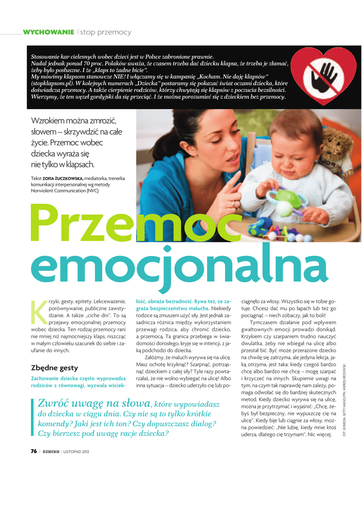 WYCHOWANIE stop przemocy Stosowanie kar cielesnych wobec dzieci jest w Polsce zabronione prawnie. Nadal jednak ponad 70 proc. Polaków uważa, że czasem trzeba dać dziecku klapsa, że trzeba je złamać, żeby było posłuszne. I że „klaps to żadne bicie”. My mówimy klapsom stanowcze NIE! I włączamy się w kampanię „Kocham. Nie daję klapsów” (stopklapsom.pl). W kolejnych numerach „Dziecka” postaramy się pokazać świat oczami dziecka, które doświadcza przemocy. A także cierpienie rodziców, którzy chwytają się klapsów z poczucia bezsilności. Wierzymy, że ten węzeł gordyjski da się przeciąć. I że można porozumieć się z dzieckiem bez przemocy. Wzrokiem można zmrozić, słowem – skrzywdzić na całe życie. Przemoc wobec dziecka wyraża się nietylkowklapsach. Tekst ZOFIA ŻUCZKOWSKA, mediatorka, trenerka komunikacji interpersonalnej wg metody Nonviolent Communication (NVC) Przemoc K rzyki, gesty, epitety. Lekceważenie, porównywanie, publiczne zawstydzanie. A także „ciche dni”. To są przejawy emocjonalnej przemocy wobec dziecka. Ten rodzaj przemocy rani nie mniej niż najmocniejszy klaps, niszcząc w małym człowieku szacunek do siebie i zaufanie do innych. Zbędne gesty Zachowanie dziecka często wyprowadza rodziców z równowagi, wyzwala wściek- łość, obnaża bezradność. Bywa też, że zagraża bezpieczeństwu malucha. Niekiedy rodzice są zmuszeni użyć siły. Jest jednak zasadnicza różnica między wykorzystaniem przewagi rodzica, aby chronić dziecko, a przemocą. Ta granica przebiega w świadomości dorosłego, kryje się w intencji, z jaką podchodzi do dziecka. Załóżmy, że maluch wyrywa się na ulicę. Masz ochotę krzyknąć? Szarpnąć, potrząsnąć dzieckiem z całej siły? Tyle razy powtarzałaś, że nie wolno wybiegać na ulicę! Albo inna sytuacja – dziecko uderzyło cię lub po- Zwróć uwagę na słowa, które wypowiadasz do dziecka w ciągu dnia. Czy nie są to tylko krótkie komendy? Jaki jest ich ton? Czy dopuszczasz dialog? Czy bierzesz pod uwagę racje dziecka? 76 DZIECKO LISTOPAD 2012 ciągnęło za włosy. Wszystko się w tobie gotuje. Chcesz dać mu po łapach lub też go pociągnąć – niech zobaczy, jak to boli! Tymczasem działanie pod wpływem gwałtownych emocji prowadzi donikąd. Krzykiem czy szarpaniem trudno nauczyć dwulatka, żeby nie wbiegał na ulicę albo przestał bić. Być może przerażone dziecko na chwilę się zatrzyma, ale jedyna lekcja, jaką otrzyma, jest taka: kiedy czegoś bardzo chcę albo bardzo nie chcę – mogę szarpać i krzyczeć na innych. Skupienie uwagi na tym, na czym tak naprawdę nam zależy, pomaga odwołać się do bardziej skutecznych metod. Kiedy dziecko wyrywa się na ulicę, można je przytrzymać i wyjaśnić: „Chcę, żebyś był bezpieczny, nie wypuszczę cię na ulicę”. Kiedy bije lub ciągnie za włosy, można powiedzieć: „Nie lubię, kiedy mnie ktoś uderza, dlatego cię trzymam”. Nic więcej. FOT. DIOMEDIA, GETTY IMAGES/FPM, ANDRZEJ KROSOWSKI emocjonalna Za miesiąc Słowa jak sztylety Podobnie rzecz się ma ze sposobem, w jaki zwracamy się do dziecka. Zarówno to, co mówimy, jak i ton, jakim się do niego zwracamy, stanowią ważny przekaz, który może być oznaką szacunku i zachętą do dialogu albo wyrazem lekceważenia. Jeśli dziecko słyszy od rodziców, że jest głupie, niegrzeczne, że nic nie potrafi – przyjmuje te słowa za prawdę. Zaczyna tak właśnie siebie postrzegać. Gdy w głosie mamy czy taty słyszy ciągle irytację, pretensje, znużenie, kuli się w sobie i tłumi emocje. Jeśli dostaje rozkazy, staje się biernym wykonawcą czynności. Dziecko jest bezbronne wobec siły argumentów dorosłego. Nie umie jeszcze wystąpić we własnej obronie i sprzeciwić się temu, co mówi mama czy tata. Potrzebuje bezpieczeństwa i ochrony. Zniekształcony obraz siebie samego utrwalony w dzieciństwie może się położyć cieniem na całym życiu dziecka. Granice terytorium Nie zawsze jesteśmy świadomi, że w imię zasad savoir-vivre’u używamy wobec dziecka przemocy. Np. gdy nakłaniamy je, by pocałowało ciocię, której całować nie ma ochoty. Albo gdy strofujemy je przy stole i nie dajemy prawa do odmowy zjedzenia kolejnej porcji. W takiej sytuacji nie pozwalamy mu odczytywać swoich potrzeb i decydować o ich zaspokojeniu. W ten sposób (często w dobrej wierze) negujemy autonomię dziecka i zagłuszamy jego prawdziwe emocje. Zmuszamy je do uległości i podporządkowania się autorytetowi dorosłego. Nadużywanie przewagi nad dzieckiem to również zawstydzanie go („Ale z ciebie gapa!”, „Co za niezdara!”), stosowanie szan- Mapa pomocy W trudnych sytuacjach można skorzystać z telefonu zaufania: tel. 116 123 – Telefon Kryzysowy; tel. 116 111 – Telefon Zaufania dla Dzieci i Młodzieży (Fundacja Dzieci Niczyje); tel. 22 668 70 00 – Warszawska „Niebieska Linia” (przemoc w rodzinie). tażu emocjonalnego („Tak się napracowałam, a ty nie jesz”), straszenie („Jak będziesz niegrzeczna, przyjdzie pani i cię zabierze”), wyśmiewanie. Formą emocjonalnej przemocy jest także „karny jeżyk” i demonstracyjne milczenie. Przymusowa izolacja oraz ignorowanie uczuć dziecka, które czuje złość, smutek czy lęk, niszczą w dziecku poczucie własnej wartości. Trudne dziedzictwo Lęk przed dzieckiem i ekspresją jego potrzeb jest wzmacniany przez koncepcje wychowawcze określające dziecko jako „małego tyrana” czy „strasznego dwulatka”. Dorośli chwytają się jak deski ratunku proponowanych przez poradniki „karnych jeżyków”, „kącików przemyśleń” i „odliczania do trzech” – jakby dzieci nie były ludźmi, ale zwierzętami do wytresowania. Tym łatwiej im to przychodzi, jeśli sami zostali wychowani w podobnym klimacie – przytłoczeni wymaganiami, w poniżeniu i permanentnej krytyce. Powielają, często nieświadomie, wzory z dzieciństwa. Jeśli rodzice dostrze