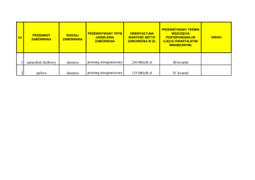 ORIENTACYJNA WARTOŚĆ NETTO ZAMOWIENIA W ZŁ PRZEWIDYWANY TERMIN WSZCZĘCIA POSTĘPOWANIA (W UJĘCIU KWARTALNYM/ MIESIĘCZNYM) PRZEDMIOT ZAMÓWIENIA RODZAJ ZAMÓWIENIA PRZEWIDYWANY TRYB UDZIELENIA ZAMÓWIENIA 1 samochód służbowy dostawa przetarg nieograniczony 230 000,00 zł III kwartał 2 paliwo dostawa przetarg nieograniczony 135 000,00 zł IV kwartał Lp UWAGI