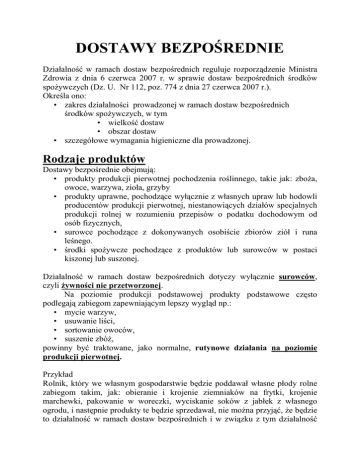 DOSTAWY BEZPOŚREDNIE Działalność w ramach dostaw bezpośrednich reguluje rozporządzenie Ministra Zdrowia z dnia 6 czerwca 2007 r. w sprawie dostaw bezpośrednich środków spożywczych (Dz. U. Nr 112, poz. 774 z dnia 27 czerwca 2007 r.). Określa ono: • zakres działalności prowadzonej w ramach dostaw bezpośrednich środków spożywczych, w tym • wielkość dostaw • obszar dostaw • szczegółowe wymagania higieniczne dla prowadzonej. Rodzaje produktów Dostawy bezpośrednie obejmują: • produkty produkcji pierwotnej pochodzenia roślinnego, takie jak: zboża, owoce, warzywa, zioła, grzyby • produkty uprawne, pochodzące wyłącznie z własnych upraw lub hodowli producentów produkcji pierwotnej, niestanowiących działów specjalnych produkcji rolnej w rozumieniu przepisów o podatku dochodowym od osób fizycznych, • surowce pochodzące z dokonywanych osobiście zbiorów ziół i runa leśnego. • środki spożywcze pochodzące z produktów lub surowców w postaci kiszonej lub suszonej. Działalność w ramach dostaw bezpośrednich dotyczy wyłącznie surowców, czyli żywności nie przetworzonej. Na poziomie produkcji podstawowej produkty podstawowe często podlegają zabiegom zapewniającym lepszy wygląd np.: • mycie warzyw, • usuwanie liści, • sortowanie owoców, • suszenie zbóż, powinny być traktowane, jako normalne, rutynowe działania na poziomie produkcji pierwotnej. Przykład Rolnik, który we własnym gospodarstwie będzie poddawał własne płody rolne zabiegom takim, jak: obieranie i krojenie ziemniaków na frytki, krojenie marchewki, pakowanie w woreczki, wyciskanie soków z jabłek z własnego ogrodu, i następnie produkty te będzie sprzedawał, nie można przyjąć, że będzie to działalność w ramach dostaw bezpośrednich i w związku z tym działalność taka będzie podlegała ogólnym zasadom określonym przepisami rozp. 852/2004. Działalność taka wpływa bowiem w sposób znaczący na charakter tych produktów. Zakres działalności i podmiot odpowiedzialny Dostawy bezpośrednie realizowane są bezpośrednio przez producentów produkcji pierwotnej, którzy dostarczają małe ilości środków spożywczych do konsumentów finalnych lub do zakładów detalicznych zaopatrujących konsumentów finalnych. Dostawy bezpośrednie nie dotyczą produktów pierwotnych wprowadzanych do obrotu przez zakład działający na rynku spożywczym w ramach prowadzonej działalności gospodarczej w rozumieniu przepisów o swobodzie działalności gospodarczej. Tak więc nie może to być działalność w systemie pośrednictwa i dalszej odsprzedaży innemu podmiotowi gospodarczemu. Przykład Rolnik, który uprawia ziemniaki, czy inne warzywa może je sprzedawać podmiotom wymienionym w art. 1 ust. 2 lit. c rozporządzenia 852/2004 (konsumentom finalnym) na warunkach sprzedaży bezpośredniej. Natomiast, jeśli ten sam rolnik będzie zajmował się skupem płodów rolnych od innych rolników i następnie będzie sprzedawał je innym podmiotom działającym na rynku spożywczym, to rolnik taki będzie prowadził działalność gospodarczą w zakresie wprowadzania żywności do obrotu na zasadach ogólnych. Obszar działania i forma sprzedaży Działalność w ramach dostaw bezpośrednich może być prowadzona: • na terenie województwa, w którym prowadzona jest produkcja pierwotna, lub na terenie województw przyległych • Jeżeli jest prowadzona na terenie kilku powiatów, państwowy powiatowy inspektor sanitarny właściwy dla miejsca prowadzenia produkcji pierwotnej powiadamia państwowych powiatowych inspektorów sanitarnych właściwych ze względu na prowadzenie dostaw bezpośrednich o wpisie do rejestru działalności w zakresie dostaw bezpośrednich. Sprzedaż produktów podstawowych przez rolników (warzyw, owoców, itp.) może być prowadzona np. przy bramie gospodarstwa, na lokalnym targu lub do lokalnego sklepu detalicznego w celu ich bezpośredniej sprzedaży konsumentowi ostatecznemu i do lokalnych restauracji. Wielkość dostaw Wielkości obrotu w ramach dostaw bezpośrednich nie mogą przekraczać: • wielkości plonów, w skali roku, poszczególnych surowców uzyskanych przez producentów produkcji pierwotnej z gospodarstw rolnych, których są oni właścicielami lub użytkownikami na podstawie innych niż własność tytułów prawnych użytkowania gruntów rolnych; • ilości surowców pochodzących z dokonywanych osobiście zbiorów ziół i runa leśnego osoby dostarczającej środki spożywcze w ramach dostaw bezpośrednich. Wymagania higieniczne Podmioty działające w ramach dostaw bezpośrednich: • obowiązane są przestrzegać wymagań higienicznych określonych w części A załącznika I do rozporządzenia nr 852/2004 w zakresie odnoszącym się do surowców pochodzenia roślinnego, z zastrzeżeniem ust. 2 i 3. • obowiązki w zakresie prowadzenia dokumentacji (pkt. III części A) obejmują wymóg udostępniania organowi urzędowej kontroli żywności lub zakładowi detalicznemu, do którego realizowane są dostawy bezpośrednie, na ich żądanie, pisemnych oświadczeń o stosowanych środkach ochrony roślin, występowaniu szkodników lub chorób, które mogą zagrozić bezpieczeństwu produktów pochodzenia roślinnego, oraz innych informacji istotnych ze względu na zdrowie człowieka. Urządzenia, sprzęt, wyposażenie i narzędzia, które są lub mogą znaleźć się w bezpośrednim kontakcie z żywnością, powinny być: • czyszczone i dezynfekowane, z częstotliwością niezbędną dla zapewnienia bezpieczeństwa środków spożywczych; • w stanie technicznym i higienicznym niewpływającym negatywnie na spełnianie wymagań zdrowotnych żywności. Przedsiębiorstwa sektora spożywczego produkującego lub zbierającego produkty roślinne podejmują działania: • w celu utrzymania w czystości obiektów, wyposażenia, pojemników, skrzyń, pojazdów • w celu zapewnienia higienicznych warunków pro