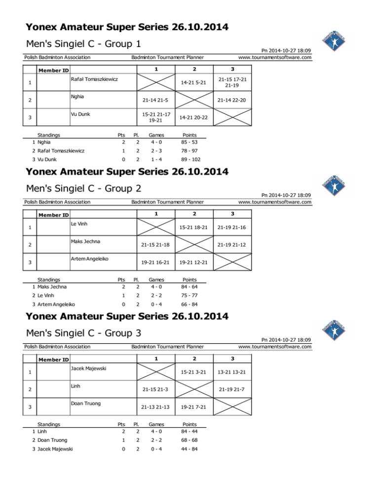 Yonex Amateur Super Series 26.10.2014 Men's Singiel C - Group 1 Polish Badminton Association 1 Member ID Rafał Tomaszkiewicz 1 Nghia 2 Standings 1 Nghia 2 3 14-21 5-21 21-15 17-21 21-19 21-14 21-5 Vu Dunk 3 Pn 2014-10-27 18:09 www.tournamentsoftware.com Badminton Tournament Planner 15-21 21-17 19-21 21-14 22-20 14-21 20-22 Pts 2 Pl. 2 Games 4-0 Points 85 - 53 2 Rafał Tomaszkiewicz 1 2 2-3 78 - 97 3 Vu Dunk 0 2 1-4 89 - 102 Yonex Amateur Super Series 26.10.2014 Men's Singiel C - Group 2 Polish Badminton Association 1 Member ID Le Vinh 1 Maks Jechna 2 Standings 1 Maks Jechna 2 3 15-21 18-21 21-19 21-16 21-15 21-18 Artem Angeleiko 3 Pn 2014-10-27 18:09 www.tournamentsoftware.com Badminton Tournament Planner 19-21 16-21 21-19 21-12 19-21 12-21 Pts 2 Pl. 2 Games 4-0 Points 84 - 64 2 Le Vinh 1 2 2-2 75 - 77 3 Artem Angeleiko 0 2 0-4 66 - 84 Yonex Amateur Super Series 26.10.2014 Men's Singiel C - Group 3 Polish Badminton Association 1 Member ID Jacek Majewski 1 Linh 2 Standings 1 Linh 2 3 15-21 3-21 13-21 13-21 21-15 21-3 Doan Truong 3 Pn 2014-10-27 18:09 www.tournamentsoftware.com Badminton Tournament Planner 21-13 21-13 21-19 21-7 19-21 7-21 Pts 2 Pl. 2 Games 4-0 Points 84 - 44 2 Doan Truong 1 2 2-2 68 - 68 3 Jacek Majewski 0 2 0-4 44 - 84 Yonex Amateur Super Series 26.10.2014 Men's Singiel C - Position 1-3 Polish Badminton Association 1 Member ID Nghia 1 Maks Jechna 2 Standings 1 Nghia 2 3 21-17 21-14 21-12 25-23 17-21 14-21 Linh 3 Pn 2014-10-27 18:09 www.tournamentsoftware.com Badminton Tournament Planner 12-21 23-25 21-17 21-17 17-21 17-21 Pts 2 Pl. 2 Games 4-0 Points 88 - 66 2 Maks Jechna 1 2 2-2 73 - 76 3 Linh 0 2 0-4 69 - 88 Yonex Amateur Super Series 26.10.2014 Men's Singiel C - Position 4-6 Polish Badminton Association 1 Member ID Rafał Tomaszkiewicz 1 Le Vinh 2 Standings 4 Le Vinh 2 3 21-14 15-21 17-21 w.o. Won 14-21 21-15 21-17 Group 3 #2 3 Pn 2014-10-27 18:09 www.tournamentsoftware.com Badminton Tournament Planner w.o. Lost w.o. Won w.o. Lost Pts 1 Pl. 1 Games 2-1 Points 56 - 53 5 Rafał Tomaszkiewicz 0 1 1-2 53 - 56 6 0 0 0-0 0-0 Yonex Amateur Super Series 26.10.2014 Men's Singiel C - Position 7-9 Polish Badminton Association 1 Member ID Vu Dunk 1 Artem Angeleiko 2 Standings 7 Vu Dunk 2 3 21-18 15-21 21-14 w.o. Won 18-21 21-15 14-21 Doan Truong 3 Pn 2014-10-27 18:09 www.tournamentsoftware.com Badminton Tournament Planner w.o. Lost w.o. Won w.o. Lost Pts 1 Pl. 1 Games 2-1 Points 57 - 53 8 Artem Angeleiko 0 1 1-2 53 - 57 9 Doan Truong 0 0 0-0 0-0