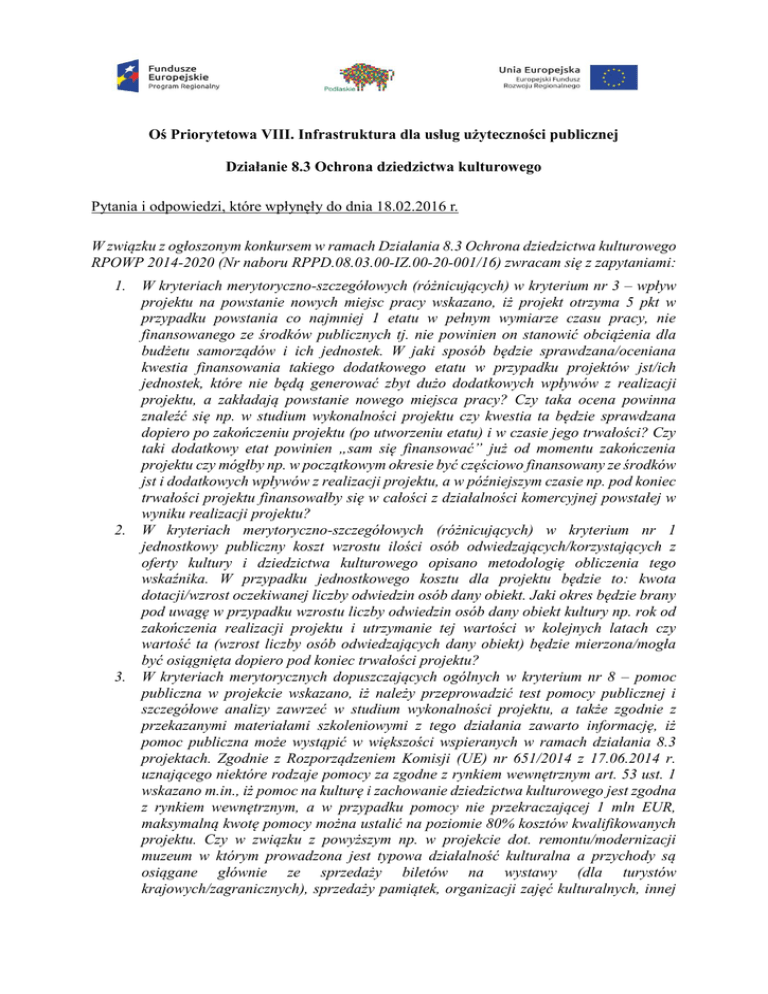 Oś Priorytetowa VIII. Infrastruktura dla usług użyteczności publicznej Działanie 8.3 Ochrona dziedzictwa kulturowego Pytania i odpowiedzi, które wpłynęły do dnia 18.02.2016 r. W związku z ogłoszonym konkursem w ramach Działania 8.3 Ochrona dziedzictwa kulturowego RPOWP 2014-2020 (Nr naboru RPPD.08.03.00-IZ.00-20-001/16) zwracam się z zapytaniami: 1. W kryteriach merytoryczno-szczegółowych (różnicujących) w kryterium nr 3 – wpływ projektu na powstanie nowych miejsc pracy wskazano, iż projekt otrzyma 5 pkt w przypadku powstania co najmniej 1 etatu w pełnym wymiarze czasu pracy, nie finansowanego ze środków publicznych tj. nie powinien on stanowić obciążenia dla budżetu samorządów i ich jednostek. W jaki sposób będzie sprawdzana/oceniana kwestia finansowania takiego dodatkowego etatu w przypadku projektów jst/ich jednostek, które nie będą generować zbyt dużo dodatkowych wpływów z realizacji projektu, a zakładają powstanie nowego miejsca pracy? Czy taka ocena powinna znaleźć się np. w studium wykonalności projektu czy kwestia ta będzie sprawdzana dopiero po zakończeniu projektu (po utworzeniu etatu) i w czasie jego trwałości? Czy taki dodatkowy etat powinien „sam się finansować” już od momentu zakończenia projektu czy mógłby np. w początkowym okresie być częściowo finansowany ze środków jst i dodatkowych wpływów z realizacji projektu, a w późniejszym czasie np. pod koniec trwałości projektu finansowałby się w całości z działalności komercyjnej powstałej w wyniku realizacji projektu? 2. W kryteriach merytoryczno-szczegółowych (różnicujących) w kryterium nr 1 jednostkowy publiczny koszt wzrostu ilości osób odwiedzających/korzystających z oferty kultury i dziedzictwa kulturowego opisano metodologię obliczenia tego wskaźnika. W przypadku jednostkowego kosztu dla projektu będzie to: kwota dotacji/wzrost oczekiwanej liczby odwiedzin osób dany obiekt. Jaki okres będzie brany pod uwagę w przypadku wzrostu liczby odwiedzin osób dany obiekt kultury np. rok od zakończenia realizacji projektu i utrzymanie tej wartości w kolejnych latach czy wartość ta (wzrost liczby osób odwiedzających dany obiekt) będzie mierzona/mogła być osiągnięta dopiero pod koniec trwałości projektu? 3. W kryteriach merytorycznych dopuszczających ogólnych w kryterium nr 8 – pomoc publiczna w projekcie wskazano, iż należy przeprowadzić test pomocy publicznej i szczegółowe analizy zawrzeć w studium wykonalności projektu, a także zgodnie z przekazanymi materiałami szkoleniowymi z tego działania zawarto informację, iż pomoc publiczna może wystąpić w większości wspieranych w ramach działania 8.3 projektach. Zgodnie z Rozporządzeniem Komisji (UE) nr 651/2014 z 17.06.2014 r. uznającego niektóre rodzaje pomocy za zgodne z rynkiem wewnętrznym art. 53 ust. 1 wskazano m.in., iż pomoc na kulturę i zachowanie dziedzictwa kulturowego jest zgodna z rynkiem wewnętrznym, a w przypadku pomocy nie przekraczającej 1 mln EUR, maksymalną kwotę pomocy można ustalić na poziomie 80% kosztów kwalifikowanych projektu. Czy w związku z powyższym np. w projekcie dot. remontu/modernizacji muzeum w którym prowadzona jest typowa działalność kulturalna a przychody są osiągane głównie ze sprzedaży biletów na wystawy (dla turystów krajowych/zagranicznych), sprzedaży pamiątek, organizacji zajęć kulturalnych, innej drobnej działalności, itp. mogą zajść przesłanki występowania takiej pomocy publicznej? (pomimo uzyskiwanych przychodów projekt nie jest dochodowy, gdyż koszty znacznie przewyższają osiągane przychody z ww. działalności operacyjnej). Jakie elementy/przesłanki będą decydujące czy taka pomoc może wystąpić w danym przypadku lub jej nie będzie? W odpowiedzi na Pana pytania zgłoszone w ramach konkursu - RPPD.08.03.00-IZ.00-20001/16 Instytucja Organizująca Konkurs (IOK) informuje, co następuje. Ad.1 W ramach kryterium merytoryczno-technicznego szczegółowego (różnicującego) nr 3 Wpływ projektu na powstanie nowych miejsc pracy Wnioskodawca może otrzymać punkty w przypadku, gdy w ramach projektu zostanie utworzone co najmniej jedno nowe pozarolnicze miejsce pracy w pełnym wymiarze czasu pracy, bez względu na formę zatrudnienia. Należy jednak mieć na uwadze, że powstałe w wyniku realizacji projektu miejsca pracy, nie mogą być finansowane ze środków publicznych w całym okresie realizacji projektu, np. ze środków samorządów terytorialnych, za wyjątkiem przypadków finansowania utworzonych miejsc pracy z komercyjnych wpływów działalności powstałej w wyniku realizacji projektu (np. sprzedaż biletów wstępu, usługi związane z komercyjnym wykorzystaniem elementów projektu w obszarze kultury, itp.). Zapewnienie, że utworzone w wyniku realizacji projektu miejsca pracy nie będą finansowane ze środków publicznych, leży po stronie Wnioskodawcy. Aby otrzymać punkty w ramach niniejszego kryterium, Wnioskodawca powinien w sposób wyczerpujący opisać sposób finansowania utworzonego miejsca pracy w Studium Wykonalności, w tym w analizie finansowej. Brak wystarczających informacji w tym zakresie może skutkować nie przyznaniem punktów w ramach tego kryterium. Deklaracja Wnioskodawcy, o której mowa powyżej, będzie weryfikowana przede wszystkim w trakcie kontroli realizacji projektu. Ad. 2 W ramach kryterium merytoryczno-technicznego szczegółowego (różnicującego) nr 1 Jednostkowy publiczny koszt wzrostu ilości osób odwiedzających/korzystających z oferty obiektu/-ów kultury i dziedzictwa kulturowego udokumentowany analizą popytu przy obliczaniu wzrostu liczby osób odwiedzających/korzystających z ofert obiektów kultury i dziedzictwa kulturowego będzie brana pod uwagę, np. wartość wskaźnika produktu: Wzrost oczekiwanej liczby odwiedzin w objętych wsparciem miejscach należących do dziedzictwa kulturalnego i naturalnego oraz stanowią