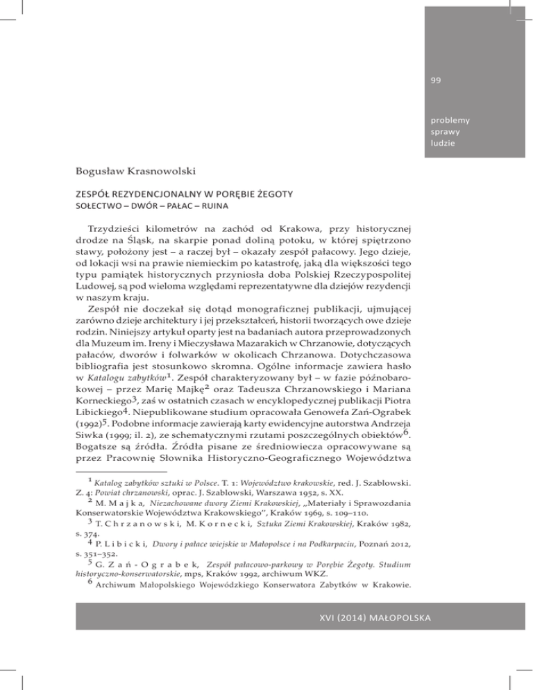 Zespół rezydencjonalny w Porębie Żegoty 99 problemy sprawy ludzie Bogusław Krasnowolski ZESPÓŁ REZYDENCJONALNY W PORĘBIE ŻEGOTY SOŁECTWO – DWÓR – PAŁAC – RUINA Trzydzieści kilometrów na zachód od Krakowa, przy historycznej drodze na Śląsk, na skarpie ponad doliną potoku, w której spiętrzono stawy, położony jest – a raczej był – okazały zespół pałacowy. Jego dzieje, od lokacji wsi na prawie niemieckim po katastrofę, jaką dla większości tego typu pamiątek historycznych przyniosła doba Polskiej Rzeczypospolitej Ludowej, są pod wieloma względami reprezentatywne dla dziejów rezydencji w naszym kraju. Zespół nie doczekał się dotąd monograficznej publikacji, ujmującej zarówno dzieje architektury i jej przekształceń, historii tworzących owe dzieje rodzin. Niniejszy artykuł oparty jest na badaniach autora przeprowadzonych dla Muzeum im. Ireny i Mieczysława Mazarakich w Chrzanowie, dotyczących pałaców, dworów i folwarków w okolicach Chrzanowa. Dotychczasowa bibliografia jest stosunkowo skromna. Ogólne informacje zawiera hasło w Katalogu zabytków1. Zespół charakteryzowany był – w fazie późnobarokowej – przez Marię Majkę 2 oraz Tadeusza Chrzanowskiego i Mariana Korneckiego3, zaś w ostatnich czasach w encyklopedycznej publikacji Piotra Libickiego4. Niepublikowane studium opracowała Genowefa Zań-Ograbek (1992)5. Podobne informacje zawierają karty ewidencyjne autorstwa Andrzeja Siwka (1999; il. 2), ze schematycznymi rzutami poszczególnych obiektów6. Bogatsze są źródła. Źródła pisane ze średniowiecza opracowywane są przez Pracownię Słownika Historyczno-Geograficznego Województwa 1Katalog zabytków sztuki w Polsce. T. 1: Województwo krakowskie, red. J. Szablowski. Z. 4: Powiat chrzanowski, oprac. J. Szablowski, Warszawa 1952, s. XX. 2 M. M a j k a, Niezachowane dwory Ziemi Krakowskiej, „Materiały i Sprawozdania Konserwatorskie Województwa Krakowskiego”, Kraków 1969, s. 109–110. 3 T. C h r z a n o w s k i, M. K o r n e c k i, Sztuka Ziemi Krakowskiej, Kraków 1982, s. 374. 4 P. L i b i c k i, Dwory i pałace wiejskie w Małopolsce i na Podkarpaciu, Poznań 2012, s. 351–352. 5 G. Z a ń - O g r a b e k, Zespół pałacowo-parkowy w Porębie Żegoty. Studium historyczno-konserwatorskie, mps, Kraków 1992, archiwum WKZ. 6 Archiwum Małopolskiego Wojewódzkiego Konserwatora Zabytków w Krakowie. XVI (2014) maŁopolska 100 Bogusław Krasnowolski Krakowskiego w Średniowieczu. Opublikowano inwentarze zespołu z końca XVII wieku7 (il. 1), niepublikowane pozostają późniejsze, z lat 1740, 1777 i 17798. O życiu w pałacu i jego mieszkańcach w 1. połowie XIX wieku mówią pamiętniki, zwłaszcza Kazimierza Girtlera (1804–1887)9, uczestnika Powstania Listopadowego i galicyjskiego konspiratora kapitana Józefa Patelskiego (1805–1887)10, Heleny z Mieroszewskich Darowskiej (1819–1908) 11. Istotne są przekazy kartograficzne i planistyczne: mapa opracowana w latach 1801– 1804 pod kierunkiem austriackiego oficera Antona Mayera Heldensfelda, obejmująca ziemie III zaboru austriackiego12, rejestrująca – schematycznie – zespół pałacowy z parkiem i stawami (il. 3) oraz dziesięciokrotnie dokładniejszy (1:2.880) plan katastralny Poręby Żegoty z 1848 roku13 (il. 4). Poręba Żegoty w średniowieczu Zespół pałacowy genezą związany jest zapewne z lokacyjnym rozplanowaniem wsi, założonej na leśnej porębie jako ośrodek parafialny i centrum rycerskiej własności. Rozplanowanie to, doskonale widoczne na wspomnianym planie katastralnym, jest czytelne do dzisiaj. Nawsie rozciągnięto po obu stronach potoku: działki siedliskowe zajęły miejsce ponad skarpami dolinki, role – o czytelnym rozłogu łanowo-leśnym – biegną prostopadle do nawsia. Owa lokacja przypaść mogła już na 2. poł. XIII stulecia, a najpóźniej na początek następnego wieku, skoro tutejszą parafię odnotowano w najstarszych zachowanych spisach „świętopietrza” z 1325 roku14. Nazwa wsi wskazuje na osobę kasztelana krakowskiego Żegoty herbu 7 Inwentarze dóbr ziemskich województwa krakowskiego, 1576–1700, wyd. A. Kamiński, A. Kielnicka, S. Pańków, Warszawa 1956, poz. 30, 31, 48, 63, 64, 77, 78, 80, 85. 8 Archiwum Narodowe w Krakowie [cyt. dalej AKNKr.], Castr. Crac. Rel. 164, s. 2671–2672; Castr. Crac. Rel. 208, s. 473–475; Castr. Crac. Rel. 210, s. 3010. 9 K. G i r t l e r, Opowiadania, T. 1–2, Kraków 1971, passim. 10 Wspomnienia wojskowe Józefa Patelskiego z lat 1823–1831, wyd. i przypisami opatrzył B.G., Wilno 1914, passim; Dalszy ciąg opowiadań kapitana Józefa Patelskiego [w:] Kapitan i dwie panny. Krakowskie pamiętniki z XIX wieku, przygot. do druku I. Homola, B. Łopuszański, Kraków 1980. 11 H. z M i e r o s z e w s k i c h D a r o w s k a, Dwa lata moich wspomnień z życia krakowskiego, 1836–1837 [w:] Kapitan i dwie panny..., s. 78. 12 Carte von West-Gallizien: welche auf allerhöchsten Befehl Seiner Kaiserlich Oesterreichischen und Königlich Apostolischen Majestät in den Jahren von 1801 bis 1804 unter der Direction des dermahligen General Majors, und General Quartiermeisters Anton Mayer von Heldensfeld durch den Kaiserl. Königl. Generalquartiermeisterstaab militärisch aufgenommen worden (...); oryginał w wiedeńskim Kriegsarchiv, kopie elektroniczne w posiadaniu licznych placówek naukowych w Polsce. 13 ANKr., sygn. Kat. Chrz. 272, sekcja IX. 14 Informacje źródłowe dotyczące średniowiecza oparte są na niepublikowanych jeszcze wypisach Pracowni Słownika Historyczno-Geograficznego Województwa Krakowskiego w Średniowieczu. XVI (2014) maŁopolska Zespół rezydencjonalny w Porębie Żegoty 101 problemy sprawy ludzie Ilustracja 1. Dwór Korycińskich w Porębie Żegoty z 1. połowy XVII wieku: schemat rzutu według inwentarzy z lat 1684–1690, oprac. autor Ilustracja 2. Pałac Szwarcenberg-Czernych w Porębie Żegoty ok. 1762 roku; rzut, oprac. A. Siwek, 1999 Ilust
