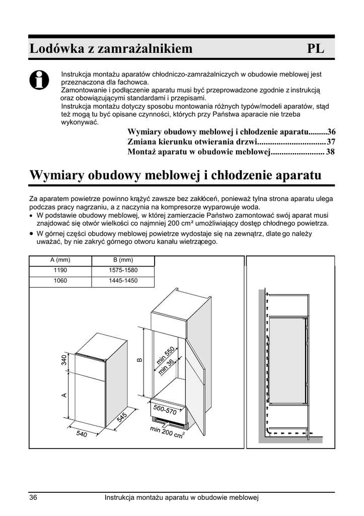 Lodówka z zamrażalnikiem PL Instrukcja montażu aparatów chłodniczo-zamrażalniczych w obudowie meblowej jest przeznaczona dla fachowca. Zamontowanie i podłączenie aparatu musi być przeprowadzone zgodnie z instrukcją oraz obowiązującymi standardami i przepisami. Instrukcja montażu dotyczy sposobu montowania różnych typów/modeli aparatów, stąd też mogą tu być opisane czynności, których przy Państwa aparacie nie trzeba wykonywać. Wymiary obudowy meblowej i chłodzenie aparatu.........36 Zmiana kierunku otwierania drzwi................................37 Montaż aparatu w obudowie meblowej......................... 38 Wymiary obudowy meblowej i chłodzenie aparatu Za aparatem powietrze powinno krążyć zawsze bez zakłóceń, ponieważ tylna strona aparatu ulega podczas pracy nagrzaniu, a z naczynia na kompresorze wyparowuje woda. • W podstawie obudowy meblowej, w której zamierzacie Państwo zamontować swój aparat musi znajdować się otwór wielkości co najmniej 200 cm² umożliwiający dostęp chłodnego powietrza. • W górnej części obudowy meblowej powietrze wydostaje się na zewnątrz, dlate go należy uważać, by nie zakryć górnego otworu kanału wietrzącego. 36 A (mm) B (mm) 1190 1575-1580 1060 1445-1450 Instrukcja montażu aparatu w obudowie meblowej Zmiana kierunku otwierania drzwi Jeśli kierunek otwierania drzwi Państwu nie odpowiada, można go zmienić. Po przeciwnej stronie obwodu aparatu wykonane zostały odpowiednie otwory przykryte zatyczkami. Należy: • Zdjąć ochraniacz górnego zawiasu, odkręcić zawias oraz zdjąć drzwi zamrażalnika (na środkowy zawias są tylko nasadzone) i podkładkę środkowego zawiasu. • Odkręcić górną listwę, przestawić na przeciwną stronę obudowy aparatu i przykręcić. • Odkręcić dolny zawias z podkładką i zdjąć drzwi lodówki. • Następnie odkręcić jeszcze środkowy zawias. • Zdjąć podkładkę z dolnego zawiasu i (obracając w kierunku wskazówek zegara) odkręcić sztyft dolnego zawiasu. Przykręcić z powrotem dolny zawias bez sztyftu. • Sztyft i podkładkę umieścić w odwrotnej kolejności w otworze dolnego zawiasu na drugiej stronie aparatu. • Na dolny zawias nasadzić drzwi lodówki. • Środkowy zawias obrócić o 180°, umieścić na drugiej stronie drzwi i przykręcić. Na zawias nałożyć podkładkę i górne drzwi. • Przykręcić górny zawias i nałożyć na niego ochraniacz. • Przełożyć prowadniki suwaków na przeciwną stronę obojga drzwi. • Otwory pozostałe w poprzednim miejscu po przestawieniu zakryć zatyczkami. • Na końcu sprawdzić przyleganie magnetycznych uszczelek • (uszczelka nie powinna być pomarszczona i musi w każdym miejscu dobrze uszczelniać). Jeżeli nie będzie przylegać, należy ją wyciągnąć i odwrócić o 180°. • W przypadku określonych modeli uszczelki na drzwiach nie można wymienić. • W miejscu, gdzie uszczelka nie przylega do obudowy urządzenia, należy ją z odpowiedniej odległości ogrzać (np. za pomocą suszarki do włosów), a następnie delikatnie ją rozciągnąć do żądanej długości uszczelki. 1 Ochraniacz górnego zawiasu 2 Górny zawias 3 Górna listwa 4 Środkowy zawias 5 Podkładka środkowego zaawiasu 6 Dolny zawias 7 Podkładka dolnego zawiasu 8 Sztyft dolnego zawiasu 9 Prowadnnik suwaka 10 Narożnik z otworem 11 Narożnik bez otworu Instrukcja montażu aparatu w obudowie meblowej 37 Montaż aparatu w obudowie meblowej. • Aparat należy wsunąć mniej więcej na 38 mm w głąb obudowy meblowej, przy czym odstęp pomiędzy aparatem i ścianką obudowy po przeciwnej stronie zawiasów drzwi musi wynosić na całej wysokości 4 mm (rysunek 1). • Szeroko otworzyć oboje drzwi aparatu i przymocować je do górnych i dolnych drzwi obudowy meblowej w następujący sposób: − Prowadnice suwaków (załączone w torebce wraz ze śrubami ST 4,2 x 9,5) należy umocować na krawędzi drzwi urządzenia. Pozostałe otwory należy zakryć za pomocą załączonych osłonek. − Drzwi aparatu przycisnąć do drzwi obudowy meblowej (rysunek 2). − Suwaki wsunąć w prowadniki suwaków i przy pomocy śrub A 4 x 12 przymocować je 15 mm od brzegu drzwi obudowy meblowej (rysunek 3). − Prowadniki suwaków usunąć i oddzielić drzwi aparatu od drzwi obudowy meblowej. − Suwaki przymocować jeszcze przy pomocy pozostałych śrub, i uważać, by suwaki się przy tym nie przesunęły (rysunek 4). − Prowadniki suwaków przymocować z powrotem na poprzednim miejscu. − Zamknąć drzwi i sprawdzić jakość zamykania i szczelność (uszczelka drzwi w żadnym miejscu nie powinna być pomarszczona). • Na koniec przytwierdzić aparat do obudowy. Do sufitu przykręcić go trzema śrubami A 4 x 12 poprzez górną listwę, do dna dwiema śrubami A 4 x 16 poprzez dolne zawiasy. Na śruby wywiercić należy otwory o średnicy 3 x 5 (rysunek 5). • Szczelinę na przeciwległej stronie zawiasu drzwi aparatu należy uszczelnić przy pomocy załączonej uszczelki (rysunek 6). OSTRZEŻENIE! Podczas instalowania aparatu w obudowie meblowej nie wolno włączać go do sieci elektrycznej, gałka termostatu powinna znajdować się w pozycji STOP (0). 38 Rysunek 1 Rysunek 2 Rysunek 3 Rysunek 4 Rysunek 5 Rysunek 6 Instrukcja montażu aparatu w obudowie meblowej