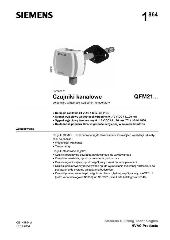 1 1864P01 864 Symaro™ QFM21... Czujniki kanałowe do pomiaru wilgotności względnej i temperatury • • • • Napięcie zasilania 24 V AC / 13,5...35 V DC Sygnał wyjściowy wilgotności względnej 0...10 V DC / 4…20 mA Sygnał wyjściowy temperatury 0...10 V DC / 4…20 mA / T1 / LG-Ni 1000 Dokładność pomiaru ±3 % wilgotności względnej w zakresie komfortu Zastosowanie Czujniki QFM21... przeznaczone są do stosowania w instalacjach wentylacji i klimatyzacji do pomiaru: • Wilgotności względnej • Temperatury Czujniki stosowane są jako: • Czujniki regulacyjne powietrza nawiewanego lub wywiewanego • Czujniki odniesienia, np. do przesunięcia punktu rosy • Czujniki ograniczające, np. do współpracy z nawilżaczami parowymi • Czujniki pomiarowe wykorzystywane np. do wyświetlania mierzonej wartości lub do podłączenia do systemu zarządzania budynkiem • Czujniki pomiarowe entalpii i wilgotności bezwzględnej, współpracując z AQF61.1 (patrz karta katalogowa N1899) lub SEZ222 (patrz karta katalogowa N5146) CE1N1864pl 16.12.2004 Siemens Building Technologies HVAC Products Zestawienie typów Oznaczenie typu Zakres pomiaru temperatury Sygnał wyjściowy temperatury Zakres pomiaru wilgotności Sygnał wyjściowy wilgotności Napięcie zasilania QFM2100 — — 0...100 % Aktywny, 0...10 V DC 24 V AC lub 13,5…35 V DC QFM2101 — — 0...100 % Aktywny, 4…20 mA 13,5…35 V DC QFM2120 −35...+50 °C Pasywny, LG-Ni 1000 0...100 % Aktywny, 0...10 V DC 24 V AC lub 13,5…35 V DC QFM2140 −35...+50 °C Pasywny, T1 (PTC) 0...100 % Aktywny, 0...10 V DC 24 V AC lub 13,5…35 V DC QFM2160 0...50 °C lub −35...+35 °C Aktywny, 0...10 V DC 0...100 % Aktywny, 0...10 V DC 24 V AC lub 13,5…35 V DC QFM2171 0...50 °C lub −35...+35 °C Aktywny, 4…20 mA 0...100 % Aktywny, 4…20 mA 13,5…35 V DC Zamawianie i dostawa Przy zamawianiu należy podać nazwę i oznaczenie typu urządzenia, np.: Czujnik kanałowy QFM2120 Czujnik dostarczany jest z kołnierzem montażowym oraz z dławikiem kablowym M16. Urządzenia współpracujące Wszystkie systemy lub urządzenia, do których można podłączyć sygnał wyjściowy czujnika 0...10 V DC, 4...20 mA, LG-Ni 1000 lub T1. Działanie Czujnik dokonuje pomiaru temperatury wilgotności względnej za pomocą pojemnościowego elementu pomiarowego, którego pojemność elektryczna zmienia się w funkcji wilgotności względnej powietrza. Elektroniczny obwód pomiarowy przetwarza sygnał czujnika na wyjściowy sygnał ciągły 0...10 V DC lub 4…20 mA, odpowiadający 0...100 % wilgotności względnej. Temperatura Czujnik dokonuje pomiaru temperatury powietrza za pomocą elementu pomiarowego, którego rezystancja zmienia się w funkcji temperatury powietrza. Zależnie od typu czujnika, zmiana rezystancji przetwarzana jest na aktywny sygnał wyjściowy 0…10 V DC lub 4…20 mA ( 0…50 °C lub –35…+35 °C) lub jest dostępna jako pasywny sygnał wyjściowy ( –35…+50 °C). Wykres obciążenia jałowego Sygnał wyjściowy, zacisk I1 / I2 1864D03pl Wilgotność względna 900 Obciążenie jałowe [Ω] 800 Zakres niedozwolony! 700 600 Zakres dozwolony 500 400 300 200 100 0 0 10 20 30 40 Napięcie zasilania [V DC] 2/8 Siemens Building Technologies HVAC Products Czujniki kanałowe QFM21... CE1N1864pl 16.12.2004 Charakterystyka: R [Ω] LG-Ni 1000 1811D01 Element pomiarowy 1400 1200 1000 800 600 −50 −40 −30 −20 −10 0 10 20 30 40 50 60 70 80 ϑ [°C] R [Ω] T1 (PTC) 1864D01 3200 3000 2800 2600 2400 2200 2000 1800 1600 1400 −40 −30 −20 −10 Legenda R ϑ 0 10 20 30 40 50 60 70 80 ϑ [°C] Rezystancja [Ω] Temperatura [°C] Budowa Kanałowy czujnik QFM21... składa się z obudowy, obwodu drukowanego, zacisków podłączeniowych, kołnierza montażowego i trzpienia pomiarowego. W skład dwuczęściowej obudowy wchodzi podstawa oraz zdejmowana pokrywa (mocowana zatrzaskowo). Obwód pomiarowy i element nastawczy umieszczone są na obwodzie drukowanym wewnątrz pokrywy, a zaciski podłączeniowe znajdują się w podstawie. Element pomiarowy znajduje się na końcu trzpienia pomiarowego i jest zabezpieczony osłoną filtra. Kabel doprowadzany jest przez dławik kablowy M16 (IP54) dostarczany z czujnikiem, dławik może być przykręcony do obudowy. Trzpień pomiarowy i obudowa wykonane są z tworzywa sztucznego i trwale ze sobą połączone. Czujnik przeznaczony jest do montażu z kołnierzem montażowym dostarczonym z czujnikiem. Kołnierz należy nałożyć na trzpień pomiarowy czujnika, a następnie zamocować zgodnie z wymaganą głębokością zanurzenia. Range 1 2 3 Zakres pomiar. 123 U1 10 V Funkcja testowania U2 BS-MS I1 I2 5V 20 °C 20 mA 12 mA 5 V 10 V 75 °C 12 mA 20 mA 0V 5V 20 °C 4 mA 12 mA 5V 0V 35 °C 12 mA 4 mA 1864Z05pl Element nastawczy Element nastawczy umieszczony jest wewnątrz pokrywy. Składa się z 6-pinowego złącza oraz zwory. Element ten jest używany do wyboru wymaganego zakresu pomiarowego oraz do włączania funkcji testowania. 3/8 Siemens Building Technologies HVAC Products Czujniki kanałowe QFM21... CE1N1864pl 16.12.2004 Różne położenia zwory mają następujące znaczenie: • Do wyboru pasywnego zakresu pomiarowego temperatury: Zwora w środkowym położeniu (R2) = −35...+50 °C (nastawa fabryczna) • Do wyboru aktywnego zakresu pomiarowego temperatury: Zwora w lewym położeniu (R1) = −35...+35 °C, Zwora w środkowym położeniu (R2) = 0...50 °C (nastawa fabryczna), Zwora w prawym położeniu (R3) = 0...50 °C • Do uaktywnienia funkcji testowania: Zwora w położeniu poziomym. Sygnał wyjściowy czujnika przyjmuje wartości zgodnie z tabelką „Funkcja testowania". Awaria • W przypadku awarii czujnika temperatury, po upływie 60 sekund sygnał wyjściowy U2 (I2) przyjmuje wartość 0 V (4 mA) lub sygnał wyjściowy BS-MS −35 °C, a sygnał wilgotności na wyjściu U1 (I1) osiągnie wartość 10 V (20 mA) • W przypadku awarii czujnika wilgotności, sygnał wyjściowy U1 (I