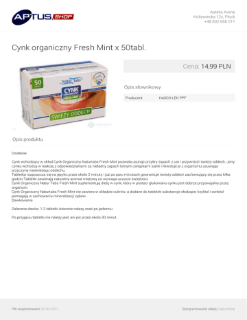 Apteka Avena Królewiecka 12c, Płock +48 502 666 011 Cynk organiczny Fresh Mint x 50tabl. Cena: 14,99 PLN Opis słownikowy Producent HASCO-LEK PPF Opis produktu Działanie Cynk wchodzący w skład Cynk Organiczny Naturtabs Fresh Mint pozwala usunąć przykry zapach z ust i przywrócić świeży oddech. Jony cynku wchodzą w reakcję z odpowiedzialnymi za nieładny zapach lotnymi związkami siarki i likwiduje je z organizmu usuwając przyczynę nieświeżego oddechu. Tabletka rozpuszcza się na języku przez około 2 minuty i już po paru minutach gwarantuje świeży oddech zachowujący się przez kilka godzin.Tabletki zawierają naturalny aromat miętowy co wzmaga uczucie świeżości. Cynk Organiczny Natur Tabs Fresh Mint suplementują dietę w cynk, który w postaci glukonianu cynku jest dobrze przyswajalny przez organizm. Cynk Organiczny Naturtabs Fresh Mint nie zawiera w składzie cukrów, a dodane do tabletek substancje słodzące: ksylitol i sorbitol pomagają w zachowaniu mineralizacji zębów. Dawkowanie Zalecana dawka: 1-2 tabletki dziennie nalezy ssać po jedzeniu. Po przyjęciu tabletki nie nalezy jeść ani pić przez około 30 minut. Plik wygenerowano: 02-03-2017 Powered by TCPDF (www.tcpdf.org) Oprogramowanie sklepu: AptusShop