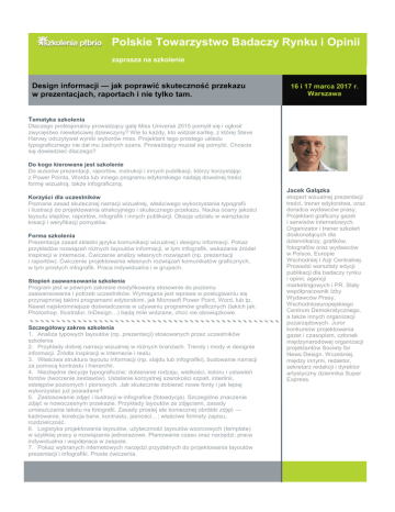 Polskie Towarzystwo Badaczy Rynku i Opinii zaprasza na szkolenie Design informacji — jak poprawić skuteczność przekazu w prezentacjach, raportach i nie tylko tam. 16 i 17 marca 2017 r. Warszawa Tematyka szkolenia Dlaczego profesjonalny prowadzący galę Miss Universe 2015 pomylił się i ogłosił zwycięstwo niewłaściwej dziewczyny? Wie to każdy, kto widział kartkę, z której Steve Harvey odczytywał wyniki wyborów miss. Projektant tego prostego układu typograficznego nie dał mu żadnych szans. Prowadzący musiał się pomylić. Chcecie się dowiedzieć dlaczego? Do kogo kierowane jest szkolenie Do autorów prezentacji, raportów, instrukcji i innych publikacji, którzy korzystając z Power Pointa, Worda lub innego programu edytorskiego nadają dowolnej treści formę wizualną, także infograficzną. Jacek Gałązka Korzyści dla uczestników Poznane zasad skutecznej narracji wizualnej, właściwego wykorzystania typografii i ilustracji do projektowania atrakcyjnego i skutecznego przekazu. Nauka oceny jakości layoutu slajdów, raportów, infografik i innych publikacji. Okazja udziału w warsztacie kreacji i weryfikacji pomysłów. Forma szkolenia Prezentacja zasad składni języka komunikacji wizualnej i designu informacji. Pokaz przykładów rozwiązań różnych layoutów informacji, w tym infografik, wskazanie źródeł inspiracji w internecie. Ćwiczenie analizy własnych rozwiązań (np. prezentacji i raportów). Ćwiczenie projektowania własnych rozwiązań komunikatów graficznych, w tym prostych infografik. Praca indywidualna i w grupach. Stopień zaawansowania szkolenia Program jest w pewnym zakresie modyfikowany stosownie do poziomu zaawansowania i potrzeb uczestników. Wymagana jest wprawa w posługiwaniu się przynajmniej takimi programami edytorskimi, jak Microsoft Power Point, Word, lub tp. Nawet najskromniejsze doświadczenia w używaniu programów graficznych (takich jak: Photoshop. Illustrator, InDesign…) będą mile widziane, choć nie obowiązkowe. Szczegółowy zakres szkolenia 1. Analiza typowych layoutów (np. prezentacji) stosowanych przez uczestników szkolenia 2. Przykłady dobrej narracji wizualnej w różnych branżach. Trendy i mody w designie informacji. Źródła inspiracji w internecie i realu. 3. Właściwa struktura layoutu informacji (np. slajdu lub infografiki), budowanie narracji za pomocą kontrastu i hierarchii. 4. Niezbędne decyzje typograficzne: dobieranie rodzaju, wielkości, koloru i ustawień fontów (tworzenie zestawów). Ustalanie korzystnej szerokości szpalt, interlinii, odstępów poziomych i pionowych. Jak skutecznie dobierać nowe fonty i jak lepiej wykorzystać już posiadane? 5. Zastosowanie zdjęć i ilustracji w infografice (fotoedycja). Szczególne znaczenie zdjęć w nowoczesnym przekazie. Przykłady layoutów ze zdjęciami, zasady umieszczania tekstu na fotografii. Zasady prostej ale koniecznej obróbki zdjęć — kadrowanie, korekcja barw, kontrastu, jasności…; właściwe formaty zapisu, rozdzielczość. 6. Logistyka projektowania layoutów, użyteczność layoutów wzorcowych (template) w szybkiej pracy a rozwiązania jednorazowe. Planowanie czasu oraz narzędzi; praca indywidualna i współpraca w zespole. 7. Pokaz wybranych internetowych narzędzi przydatnych do projektowania layoutów prezentacji i infografiki. Proste ćwiczenia. ekspert wizualnej prezentacji treści, trener edytorstwa, oraz doradca wydawców prasy. Projektant graficzny gazet i serwisów internetowych. Organizator i trener szkoleń doskonalących dla dziennikarzy, grafików, fotografów oraz wydawców w Polsce, Europie Wschodniej i Azji Centralnej. Prowadzi warsztaty edycji publikacji dla badaczy rynku i opinii, agencji marketingowych i PR. Stały współpracownik Izby Wydawców Prasy, Wschodnioeuropejskiego Centrum Demokratycznego, a także innych organizacji pozarządowych. Juror konkursów projektowania gazet i czasopism, członek międzynarodowej organizacji projektantów Society for News Design. Wcześniej, między innymi, redaktor, sekretarz redakcji i dyrektor artystyczny dziennika Super Express.