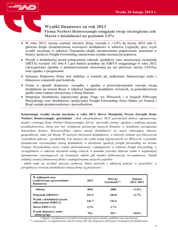 Środa 26 lutego 2014 r. Wyniki finansowe za rok 2013 Firma Norbert Dentressangle osiągnęła swoje strategiczne cele Marża z działalności na poziomie 3,5% W roku 2013, roczna wartość obrotów firmy wzrosła o +3,9% do kwoty 4032 mln €, głównie dzięki dynamicznemu rozwojowi działalności w sektorze Logistyki, przy czym wyniki uzyskane w sektorze Transportu uległy nieznacznemu pogorszeniu, natomiast w branży spedycji Freight Forwarding zanotowana została nieznaczna poprawa. Wynik z działalności przed potrąceniem odsetek, podatków oraz amortyzacji (wskaźnik EBITA) wyniósł 142 mln € i jest bardzo podobny do EBITA osiągniętego w roku 2012 (skorygowane zgodnie z postanowieniami stosowanej po raz pierwszy normy IAS19R) oraz zgodny z prognozami Sytuacja finansowa firmy jest stabilna, a wartość jej zadłużenia finansowego netto i bilansowe wskaźniki pod kontrolą Firma w sposób skuteczny, rozsądny i zgodny z przewidywaniami rozwija swoją działalność na terenie Rosji w sektorze logistyki produktów świeżych, za pośrednictwem spółki joint-venture utworzonej z firmą Danone. Integracja działalności logistycznej grupy Fiege we Włoszech i w krajach Półwyspu Iberyjskiego oraz działalności spedycyjnej Freight Forwarding firmy Daher we Francji i Rosji została przeprowadzona z powodzeniem. Komentując wyniki roczne uzyskane w roku 2013, Hervé Montjotin, Prezes Zarządu firmy Norbert Dentressangle, powiedział: „Rok obrachunkowy 2013 potwierdził dobrze ugruntowany model i strategię firmy Norbert Dentressangle, był on niezwykle istotny, zgodnie z ambicją naszego przedsiębiorstwa, którą jest być wiodącym partnerem naszych klientów w dziedzinie zarządzania łańcuchem dostaw. Rozszerzyliśmy zakres naszej działalności na nowe, obiecujące obszary geograficzne, takie jak Rosja. W naszych obszarach działalności, w których rozmiar jest kluczowym czynnikiem sukcesu, uzyskaliśmy 4-te miejsce na rynku usług logistycznych we Włoszech, a ponadto dynamicznie rozwinęliśmy naszą działalność w dziedzinie spedycji freight forwarding na terenie Francji. Pozyskaliśmy nowe, ważne doświadczenia i umiejętności w sektorze freight forwarding, w szczególności w zakresie inżynierii usług celnych, a ponadto jesteśmy liderem rynku w najbardziej dynamicznie rozwijających się branżach, takich jak handel elektroniczny (e-commerce). Dzięki solidnej sytuacji finansowej firmy i zaangażowaniu naszych zespołów , udało nam się uzyskać pozycję rynkową, która pozwala z ufnością patrzeć w przyszłość, a perspektywy rozwoju działalności naszej firmy są pozytywne”. W milionach euro (Audytowane sprawozdania finansowe) 2013 2012 po korektach** Zmiana 2013/ 2012 4032 3880 +3,9% Wskaźnik EBITDA* 251,5 244,8 +2,7% Wynik z działalności przed odliczeniami (EBITA) 141,7 141,6 Marża EBITA (%) 3,5% 3,7% Wynik finansowy netto - udział grupy 70,1 69,7 Obroty +0,6% *: Wynik z działalności przed doliczeniem/potrąceniem odsetek, podatków oraz amortyzacji. **: związanych z uwzględnieniem zaleceń normy IAS 19R dotyczącej zobowiązań socjalnych przedsiębiorstwa. 1 Środa 26 lutego 2014 r. Obroty firmy - ciągły wzrost i rozwój działalności w skali międzynarodowej Skonsolidowana wartość obrotów rocznych grupy Norbert Dentressangle za rok obrachunkowy 2013 wyniosła 4032 mln €, co oznacza wzrost o +3,9% w porównaniu z wartością obrotów opublikowaną za rok 2012. Bez uwzględnienia zmian zakresu działalności oraz wahań kursów wymiany walut, wartość obrotów wzrosła o +2,4% w porównaniu z rokiem 2012. Znaczenie wahań kursów wymiany walut wynosiło w tym okresie –1,6%. W ostatnim kwartale roku potwierdzone zostały pozytywne tendencje zaobserwowane już w III kwartale – w porównaniu z czwartym kwartałem roku 2012, wzrost obrotów wyniósł prawie +10%. Działalność prowadzona przez grupę Norbert Dentressangle ma charakter coraz bardziej międzynarodowy – uzyskuje ona obecnie 60% całkowitej wartości swoich obrotów poza terytorium Francji. W roku obrachunkowym 2013, wartość obrotów sektora Transportu wyniosła 2014 mln €, co w porównaniu z rokiem 2012 stanowi nieznaczny spadek o -1,2% wg publikowanych danych finansowych oraz o -0,6% bez uwzględnienia wpływu zmian zakresu działalności i wahań kursów wymiany walut. W czwartym kwartale roku zaobserwowaliśmy dalsze umocnienie nowej dynamiki wzrostu, zauważonej już podczas trzeciego kwartału – bez uwzględnienia wpływu zmian zakresu działalności i wahań kursów wymiany walut wartość obrotów wzrosła o +1,4%. Struktura oferowanych produktów również ewoluuje pozytywnie, dzięki poprawie wyników naszej oferty wynajmu i zarządzania parkiem „Red Inside” o +4,3%, a także specjalnej oferty europejskich przesyłek paletowych „Red Europe” o +2,3%. Istotne znaczenie mają również nowe kontrakty w ramach naszej działalności usług transportowych „Key PL” na terenie Wielkiej Brytanii oraz Francji. Wysoka dynamika rozwoju utrzymuje się w sektorze Logistyki – w roku 2013 jego opublikowana wartość obrotów wzrosła o +9,4% i wyniosła 1950 mln €, co oznacza wzrost o +7% bez uwzględnienia wpływu zmian zakresu działalności i wahań kursów wymiany walut. W czwartym kwartale roku, wzrost obrotów bez uwzględnienia wpływu zmian zakresu działalności i wahań kursów wymiany walut wyniósł 11%. Doświadczenia i umiejętności nabyte przez firmę Norbert Dentressangle w sektorze Logistyki w odniesieniu do najbardziej dynamicznie rozwijających się rodzajów działalności, takich jak handel elektroniczny (ecommerce) umożliwiają naszej firmie pozyskiwanie niezwykle wartościowych kontraktów na kluczowych europejskich rynkach. W roku 2013, wartość obrotów sektora spedycji Freight Forwarding wyniosła 145 mln €, co oznacza wzrost o +1,3% w porównaniu z rokiem 2012. Począwszy od 1 października 2013 roku, dane dotycz