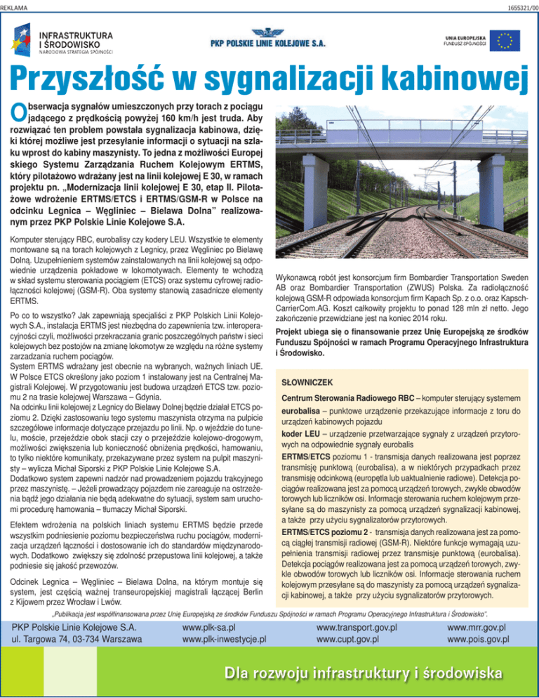 1655321/00 REKLAMA Przyszłość w sygnalizacji kabinowej bserwacja sygnałów umieszczonych przy torach z pociągu jadącego z prędkością powyżej 160 km/h jest truda. Aby rozwiązać ten problem powstała sygnalizacja kabinowa, dzięki której możliwe jest przesyłanie informacji o sytuacji na szlaku wprost do kabiny maszynisty. To jedna z możliwości Europej skiego Systemu Zarządzania Ruchem Kolejowym ERTMS, który pilotażowo wdrażany jest na linii kolejowej E 30, w ramach projektu pn. „Modernizacja linii kolejowej E 30, etap II. Pilotażowe wdrożenie ERTMS/ETCS i ERTMS/GSM-R w Polsce na odcinku Legnica – Węgliniec – Bielawa Dolna” realizowanym przez PKP Polskie Linie Kolejowe S.A. O Komputer sterujący RBC, eurobalisy czy kodery LEU. Wszystkie te elementy montowane są na torach kolejowych z Legnicy, przez Węgliniec po Bielawę Dolną. Uzupełnieniem systemów zainstalowanych na linii kolejowej są odpowiednie urządzenia pokładowe w lokomotywach. Elementy te wchodzą w skład systemu sterowania pociągiem (ETCS) oraz systemu cyfrowej radiołączności kolejowej (GSM-R). Oba systemy stanowią zasadnicze elementy ERTMS. Po co to wszystko? Jak zapewniają specjaliści z PKP Polskich Linii Kolejowych S.A., instalacja ERTMS jest niezbędna do zapewnienia tzw. interoperacyjności czyli, możliwości przekraczania granic poszczególnych państw i sieci kolejowych bez postojów na zmianę lokomotyw ze względu na różne systemy zarzadzania ruchem pociągów. System ERTMS wdrażany jest obecnie na wybranych, ważnych liniach UE. W Polsce ETCS określony jako poziom 1 instalowany jest na Centralnej Magistrali Kolejowej. W przygotowaniu jest budowa urządzeń ETCS tzw. poziomu 2 na trasie kolejowej Warszawa – Gdynia. Na odcinku linii kolejowej z Legnicy do Bielawy Dolnej będzie działał ETCS poziomu 2. Dzięki zastosowaniu tego systemu maszynista otrzyma na pulpicie szczegółowe informacje dotyczące przejazdu po linii. Np. o wjeździe do tunelu, moście, przejeździe obok stacji czy o przejeździe kolejowo-drogowym, możliwości zwiększenia lub konieczność obniżenia prędkości, hamowaniu, to tylko niektóre komunikaty, przekazywane przez system na pulpit maszynisty – wylicza Michał Siporski z PKP Polskie Linie Kolejowe S.A. Dodatkowo system zapewni nadzór nad prowadzeniem pojazdu trakcyjnego przez maszynistę. – Jeżeli prowadzący pojazdem nie zareaguje na ostrzeżenia bądź jego działania nie będą adekwatne do sytuacji, system sam uruchomi procedurę hamowania – tłumaczy Michał Siporski. Efektem wdrożenia na polskich liniach systemu ERTMS będzie przede wszystkim podniesienie poziomu bezpieczeństwa ruchu pociągów, modernizacja urządzeń łączności i dostosowanie ich do standardów międzynarodowych. Dodatkowo zwiększy się zdolność przepustowa linii kolejowej, a także podniesie się jakość przewozów. Odcinek Legnica – Węgliniec – Bielawa Dolna, na którym montuje się system, jest częścią ważnej transeuropejskiej magistrali łączącej Berlin z Kijowem przez Wrocław i Lwów. Wykonawcą robót jest konsorcjum firm Bombardier Transportation Sweden AB oraz Bombardier Transportation (ZWUS) Polska. Za radiołączność kolejową GSM-R odpowiada konsorcjum firm Kapach Sp. z o.o. oraz KapschCarrierCom.AG. Koszt całkowity projektu to ponad 128 mln zł netto. Jego zakończenie przewidziane jest na koniec 2014 roku. Projekt ubiega się o finansowanie przez Unię Europejską ze środków Funduszu Spójności w ramach Programu Operacyjnego Infrastruktura i Środowisko. SŁOWNICZEK Centrum Sterowania Radiowego RBC – komputer sterujący systemem eurobalisa – punktowe urządzenie przekazujące informacje z toru do urządzeń kabinowych pojazdu koder LEU – urządzenie przetwarzające sygnały z urządzeń przytorowych na odpowiednie sygnały eurobalis ERTMS/ETCS poziomu 1 - transmisja danych realizowana jest poprzez transmisję punktową (eurobalisa), a w niektórych przypadkach przez transmisję odcinkową (europętla lub uaktualnienie radiowe). Detekcja pociągów realizowana jest za pomocą urządzeń torowych, zwykle obwodów torowych lub liczników osi. Informacje sterowania ruchem kolejowym przesyłane są do maszynisty za pomocą urządzeń sygnalizacji kabinowej, a także przy użyciu sygnalizatorów przytorowych. ERTMS/ETCS poziomu 2 - transmisja danych realizowana jest za pomocą ciągłej transmisji radiowej (GSM-R). Niektóre funkcje wymagają uzupełnienia transmisji radiowej przez transmisje punktową (eurobalisa). Detekcja pociągów realizowana jest za pomocą urządzeń torowych, zwykle obwodów torowych lub liczników osi. Informacje sterowania ruchem kolejowym przesyłane są do maszynisty za pomocą urządzeń sygnalizacji kabinowej, a także przy użyciu sygnalizatorów przytorowych. „Publikacja jest współfinansowana przez Unię Europejską ze środków Funduszu Spójności w ramach Programu Operacyjnego Infrastruktura i Środowisko”. PKP Polskie Linie Kolejowe S.A. ul. Targowa 74, 03-734 Warszawa www.plk-sa.pl www.plk-inwestycje.pl www.transport.gov.pl www.cupt.gov.pl www.mrr.gov.pl www.pois.gov.pl