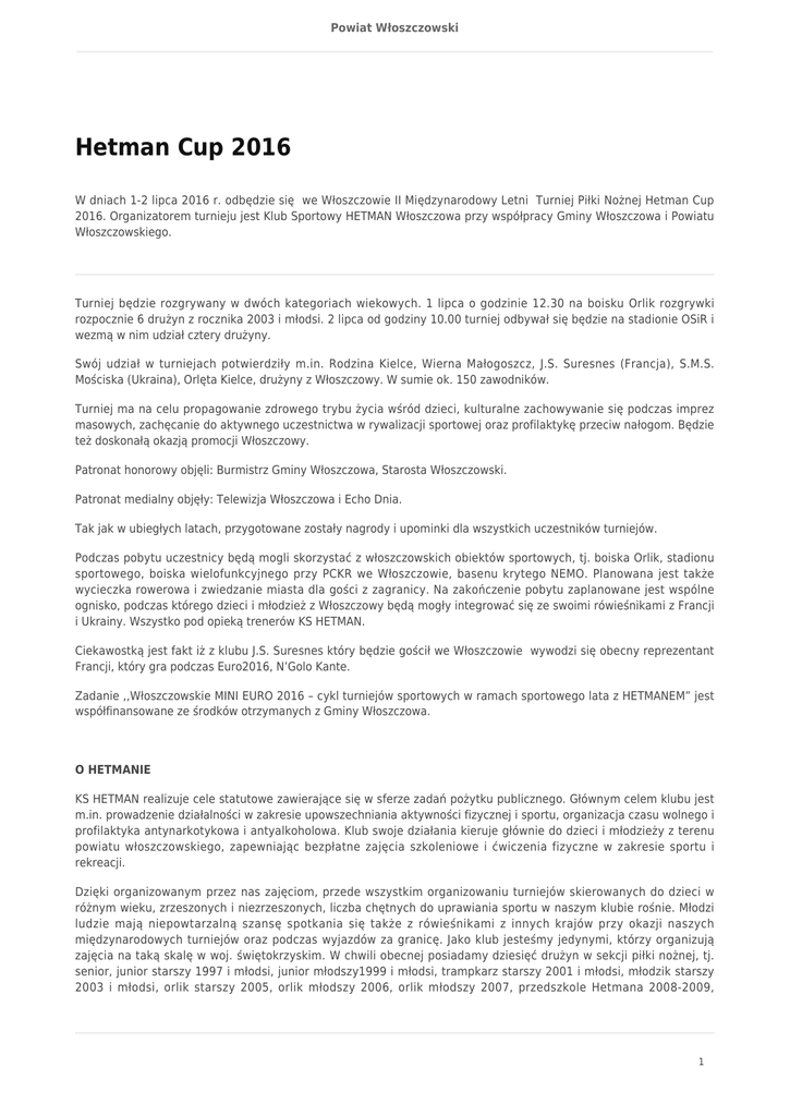 Powiat Włoszczowski Hetman Cup 2016 W dniach 1-2 lipca 2016 r. odbędzie się we Włoszczowie II Międzynarodowy Letni Turniej Piłki Nożnej Hetman Cup 2016. Organizatorem turnieju jest Klub Sportowy HETMAN Włoszczowa przy współpracy Gminy Włoszczowa i Powiatu Włoszczowskiego. Turniej będzie rozgrywany w dwóch kategoriach wiekowych. 1 lipca o godzinie 12.30 na boisku Orlik rozgrywki rozpocznie 6 drużyn z rocznika 2003 i młodsi. 2 lipca od godziny 10.00 turniej odbywał się będzie na stadionie OSiR i wezmą w nim udział cztery drużyny. Swój udział w turniejach potwierdziły m.in. Rodzina Kielce, Wierna Małogoszcz, J.S. Suresnes (Francja), S.M.S. Mościska (Ukraina), Orlęta Kielce, drużyny z Włoszczowy. W sumie ok. 150 zawodników. Turniej ma na celu propagowanie zdrowego trybu życia wśród dzieci, kulturalne zachowywanie się podczas imprez masowych, zachęcanie do aktywnego uczestnictwa w rywalizacji sportowej oraz profilaktykę przeciw nałogom. Będzie też doskonałą okazją promocji Włoszczowy. Patronat honorowy objęli: Burmistrz Gminy Włoszczowa, Starosta Włoszczowski. Patronat medialny objęły: Telewizja Włoszczowa i Echo Dnia. Tak jak w ubiegłych latach, przygotowane zostały nagrody i upominki dla wszystkich uczestników turniejów. Podczas pobytu uczestnicy będą mogli skorzystać z włoszczowskich obiektów sportowych, tj. boiska Orlik, stadionu sportowego, boiska wielofunkcyjnego przy PCKR we Włoszczowie, basenu krytego NEMO. Planowana jest także wycieczka rowerowa i zwiedzanie miasta dla gości z zagranicy. Na zakończenie pobytu zaplanowane jest wspólne ognisko, podczas którego dzieci i młodzież z Włoszczowy będą mogły integrować się ze swoimi rówieśnikami z Francji i Ukrainy. Wszystko pod opieką trenerów KS HETMAN. Ciekawostką jest fakt iż z klubu J.S. Suresnes który będzie gościł we Włoszczowie wywodzi się obecny reprezentant Francji, który gra podczas Euro2016, N’Golo Kante. Zadanie ,,Włoszczowskie MINI EURO 2016 – cykl turniejów sportowych w ramach sportowego lata z HETMANEM” jest współfinansowane ze środków otrzymanych z Gminy Włoszczowa. O HETMANIE KS HETMAN realizuje cele statutowe zawierające się w sferze zadań pożytku publicznego. Głównym celem klubu jest m.in. prowadzenie działalności w zakresie upowszechniania aktywności fizycznej i sportu, organizacja czasu wolnego i profilaktyka antynarkotykowa i antyalkoholowa. Klub swoje działania kieruje głównie do dzieci i młodzieży z terenu powiatu włoszczowskiego, zapewniając bezpłatne zajęcia szkoleniowe i ćwiczenia fizyczne w zakresie sportu i rekreacji. Dzięki organizowanym przez nas zajęciom, przede wszystkim organizowaniu turniejów skierowanych do dzieci w różnym wieku, zrzeszonych i niezrzeszonych, liczba chętnych do uprawiania sportu w naszym klubie rośnie. Młodzi ludzie mają niepowtarzalną szansę spotkania się także z rówieśnikami z innych krajów przy okazji naszych międzynarodowych turniejów oraz podczas wyjazdów za granicę. Jako klub jesteśmy jedynymi, którzy organizują zajęcia na taką skalę w woj. świętokrzyskim. W chwili obecnej posiadamy dziesięć drużyn w sekcji piłki nożnej, tj. senior, junior starszy 1997 i młodsi, junior młodszy1999 i młodsi, trampkarz starszy 2001 i młodsi, młodzik starszy 2003 i młodsi, orlik starszy 2005, orlik młodszy 2006, orlik młodszy 2007, przedszkole Hetmana 2008-2009, 1 Powiat Włoszczowski przedszkole Hetmana 2010 i młodsi. A w sekcji piłki siatkowej seniorów, juniorów, kadetów, prowadzimy również sekcje, które działają pod naszą opieką w Kluczewsku i Seceminie. W sumie w naszym klubie jest ok. 260 uczestników zajęć i ich liczba stale rośnie, dochodzą do tego opiekunowie zajęć, trenerzy, działacze, kibice. Zarząd K.S. Hetman Włoszczowa 2
