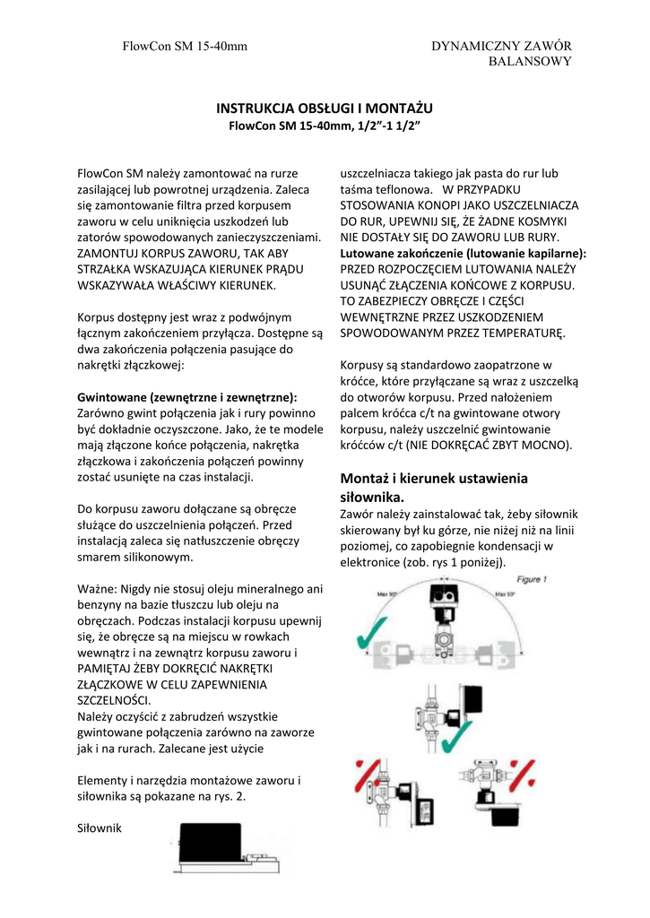 DYNAMICZNY ZAWÓR BALANSOWY FlowCon SM 15-40mm INSTRUKCJA OBSŁUGI I MONTAŻU FlowCon SM 15-40mm, 1/2”-1 1/2” FlowCon SM należy zamontować na rurze zasilającej lub powrotnej urządzenia. Zaleca się zamontowanie filtra przed korpusem zaworu w celu uniknięcia uszkodzeń lub zatorów spowodowanych zanieczyszczeniami. ZAMONTUJ KORPUS ZAWORU, TAK ABY STRZAŁKA WSKAZUJĄCA KIERUNEK PRĄDU WSKAZYWAŁA WŁAŚCIWY KIERUNEK. Korpus dostępny jest wraz z podwójnym łącznym zakończeniem przyłącza. Dostępne są dwa zakończenia połączenia pasujące do nakrętki złączkowej: Gwintowane (zewnętrzne i zewnętrzne): Zarówno gwint połączenia jak i rury powinno być dokładnie oczyszczone. Jako, że te modele mają złączone końce połączenia, nakrętka złączkowa i zakończenia połączeń powinny zostać usunięte na czas instalacji. Do korpusu zaworu dołączane są obręcze służące do uszczelnienia połączeń. Przed instalacją zaleca się natłuszczenie obręczy smarem silikonowym. Ważne: Nigdy nie stosuj oleju mineralnego ani benzyny na bazie tłuszczu lub oleju na obręczach. Podczas instalacji korpusu upewnij się, że obręcze są na miejscu w rowkach wewnątrz i na zewnątrz korpusu zaworu i PAMIĘTAJ ŻEBY DOKRĘCIĆ NAKRĘTKI ZŁĄCZKOWE W CELU ZAPEWNIENIA SZCZELNOŚCI. Należy oczyścić z zabrudzeń wszystkie gwintowane połączenia zarówno na zaworze jak i na rurach. Zalecane jest użycie Elementy i narzędzia montażowe zaworu i siłownika są pokazane na rys. 2. Siłownik uszczelniacza takiego jak pasta do rur lub taśma teflonowa. W PRZYPADKU STOSOWANIA KONOPI JAKO USZCZELNIACZA DO RUR, UPEWNIJ SIĘ, ŻE ŻADNE KOSMYKI NIE DOSTAŁY SIĘ DO ZAWORU LUB RURY. Lutowane zakończenie (lutowanie kapilarne): PRZED ROZPOCZĘCIEM LUTOWANIA NALEŻY USUNĄĆ ZŁĄCZENIA KOŃCOWE Z KORPUSU. TO ZABEZPIECZY OBRĘCZE I CZĘŚCI WEWNĘTRZNE PRZEZ USZKODZENIEM SPOWODOWANYM PRZEZ TEMPERATURĘ. Korpusy są standardowo zaopatrzone w króćce, które przyłączane są wraz z uszczelką do otworów korpusu. Przed nałożeniem palcem króćca c/t na gwintowane otwory korpusu, należy uszczelnić gwintowanie króćców c/t (NIE DOKRĘCAĆ ZBYT MOCNO). Montaż i kierunek ustawienia siłownika. Zawór należy zainstalować tak, żeby siłownik skierowany był ku górze, nie niżej niż na linii poziomej, co zapobiegnie kondensacji w elektronice (zob. rys 1 poniżej). FlowCon SM 15-40mm Przykrycie Śruba Wrzeciono/ Adapter wału Gniazdo i Zapadka Mosiężna nakrętka Uchwyt montażowy Śruby z łbem gniazdowym Klucz imbusowy Wrzeciono/ Wał Korpus zaworu Rys. 2 Podłączenie i programowanie siłownika. Rys. 3 DYNAMICZNY ZAWÓR BALANSOWY Usunąć przykrycie siłownika poprzez poluzowanie śrub przykrycia. Rys. 3 przedstawia układ scalony siłownika oraz wszystkie elementy istotne przy programowaniu siłownika. Ustaw maksymalny przepływ mikroprzełączników (odnieś się do tabeli na stronie 6). Jeżeli dostosowujesz ustawienia mikroprzełączników po podłączeniu zasilania, wciśnij przycisk reset w celu stworzenia nowych ustawień. Rys. 4-8 przedstawiają różne wymagania sygnału, tj. Analog 2-10V, Analog 4-20mA i Digital Tri-state oraz w jaki sposób stosować rezystory i przewody. Podłącz przewody zgodnie z wybranym wygnałem wejścia. Rezystory 500ohm (niebieskie ) dostosowane są do konwersji 4-20mA do 2-10V i powinny zostać połączone, jak pokazano na rys. 4 (2-10V) lub rys. 5 (420mA). Dwa rezystory 2.2Kohm (brązowe) dostosowane są specjalnie dla regulacji Digital/tri-state. W tym trybie pracy siłownik jest wrażliwy na napięcie elektryczne indukowane również z innych źródeł. W celu zapobiegania takiej interferencji, podłącz rezystor 2.2Kohm pomiędzy pinami 1 i 4, a drugi rezystor 2.2Kohm pomiędzy pinami 1 i 3 (zob. rys. 6 i 7). DYNAMICZNY ZAWÓR BALANSOWY FlowCon SM 15-40mm Pozycja w obrotach Mikroprzełączniki programowania LED wyłączony: Wyświetlana rzeczywiste obroty pozycji zaworu LED włączony: Wyświetlane ustawienia maksymalnych obrotów (na przemian co 10 sek.) Przycisk reset Mikroprzełączniki maksymalnego przepływu LED programowania i wska-zywania Listwa zaciskowa okablowania Sterowanie ręczne(NIE OBSŁUGIWAĆ GDY ZASILANIE JEST PODŁĄCZONE) Rys. 4 Rys. 5 Rys. 7 Rys. 6 Siłownik jest fabrycznie ustawiony na sygnał analogowy. Jeżeli istnieje potrzeba zmiany sygnału, postępuj zgodnie z poniższymi instrukcjami: Wyłącz zasilanie i ustaw wszystkie mikroprzełączniki programowania na OFF. FlowCon SM 15-40mm Włącz zasilanie i w ciągu 10 sekund naciśnij i puść przycisk reset. DYNAMICZNY ZAWÓR BALANSOWY Przełącznik #1: Cyfrowy/3-Punktowy Zmienny/ Trójstanowy Ustawienie funkcji na Otwarty lub Zamknięty podczas awarii zasilania. Ta funkcja dostępna jest tylko dla modeli posiadających zapasowe zasilanie baterią w razie awarii zasilania. Zapewnia to magazynowanie energii do siłownika zarówno dla ustawienia otwartego na maksymalny przepływ, jak i ustawienia pełnego zamknięcia w razie awarii zasilania. Fabrycznie siłownik ustawiony jest na Zamknięty w przypadku awarii zasilania. Przełącznik #2: Impulsy układu PWM Modulacja szerokości (niedostępny dla wersji SM.0.0.0.1) Dla ustawienia zaworu na Otwarty w przypadku awarii zasilania przełącz mikroprzełącznik programowania #2 na ON. Przełącznik #3: Analogowy 2-10V lub 4-20mA. Dla ustawienia zaworu na Zamknięty w przypadku awarii zasilania przełącz mikroprzełącznik #2 na OFF. LED programowania i wskazywania powinien zacząć migać. Przełącz mikroprzełączniki programowania #1, #2 lub #3 na ON, a następnie OFF aby wybrać pożądany sygnał. Ustawienie funkcji na Standardowo Otwarte lub Standardowo Zamknięte. Siłownik jest fabrycznie ustawiony na Standardowo Zamknięty i na analogowy sygnał regulacji, tak więc minimalny sygnał 2V lub 4mA spowoduje zamknięcie zaworu, a maksymalny sygnał 10V lub 20mA otworzy zawór do wybranego maksymalnego przepływu. 