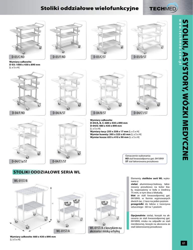 Stoliki oddziałowe wielofunkcyjne D-03/C/ST D-03/D/ST D-04/A/ST D-04/B/ST D-04/C1/ST Wymiary całkowite: D-03: 1000 x 430 x 890 mm [L x S x H] D-04/F/KO Wymiary całkowite: D-04/A, B, C: 680 x 430 x 890 mm D-04/E: 480 x 430 x 890 mm [L x S x H] Wymiary tacy: 255 x 358 x 17 mm [L x S x H] Wymiar kuwety: 395 x 325 x 65 mm [L x S x H] Wymiar kosza: 655 x 410 x 90 mm [L x S x H] D-04/C1a/ST Oznaczenie wykonania: KO stal kwasoodporna gat. 0H18N9 ST stal lakierowana proszkowo D-04/E1/ST STOLIKI, ASYSTORY, WÓZKI MEDYCZNE D-03/F/KO w w w.techmed.com.pl D-03/C/KO STOLIKI ODDZIAŁOWE SERIA WL Elementy stolików serii WL wykonano z: stelaż aluminiowy/stalowy, lakierowany proszkowo na kolor biały, wyposażony w koła o średnicy 75 mm, w tym dwa z blokadą blat ze stali kwasoodpornej gat. 0H18N9, w formie wyjmowanych dwóch tac, 2 tace na jeden poziom przegródki do leków z tworzywa sztucznego - 60 na 1 poziom WL-01ST/B H S L WL-01ST/A WL-01ST/A z koszykiem na akcesoria i miską uchylną Opcjonalnie: stelaż, koszyk na akcesoria ze stali kwasoodpornej gat. 0H18N9, miska na odpadki ze stali nierdzewnej, koszyk na akcesoria ze stali lakierowanej proszkowo Wymiary całkowite: 660 x 430 x 890 mm [L x S x H] 61