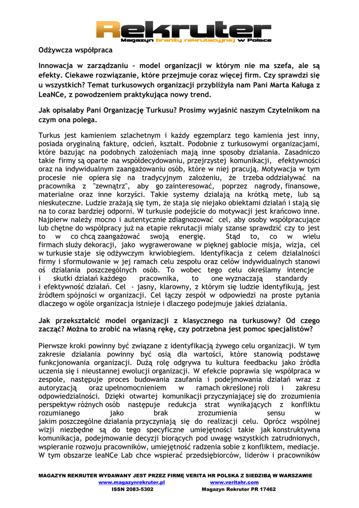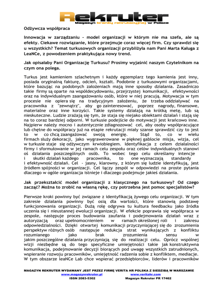 Odżywcza współpraca Innowacja w zarządzaniu - model organizacji w którym nie ma szefa, ale są efekty. Ciekawe rozwiązanie, które przejmuje coraz więcej firm. Czy sprawdzi się u wszystkich? Temat turkusowych organizacji przybliżyła nam Pani Marta Kaługa z LeaNCe, z powodzeniem praktykująca nowy trend. Jak opisałaby Pani Organizację Turkusu? Prosimy wyjaśnić naszym Czytelnikom na czym ona polega. Turkus jest kamieniem szlachetnym i każdy egzemplarz tego kamienia jest inny, posiada oryginalną fakturę, odcień, kształt. Podobnie z turkusowymi organizacjami, które bazując na podobnych założeniach mają inne sposoby działania. Zasadniczo takie firmy są oparte na współdecydowaniu, przejrzystej komunikacji, efektywności oraz na indywidualnym zaangażowaniu osób, które w niej pracują. Motywacja w tym procesie nie opiera się na tradycyjnym założeniu, że trzeba oddziaływać na pracownika z "zewnątrz", aby go zainteresować, poprzez nagrody, finansowe, materialne oraz inne korzyści. Takie systemy działają na krótką metę, lub są nieskuteczne. Ludzie zrażają się tym, że staja się niejako obiektami działań i stają się na to coraz bardziej odporni. W turkusie podejście do motywacji jest krańcowo inne. Najpierw należy mocno i autentycznie zdiagnozować cel, aby osoby współpracujące lub chętne do współpracy już na etapie rekrutacji miały szanse sprawdzić czy to jest to w co chcą zaangażować swoją energię. Stąd to, co w wielu firmach służy dekoracji, jako wygrawerowane w pięknej gablocie misja, wizja, cel w turkusie staje się odżywczym krwiobiegiem. Identyfikacja z celem działalności firmy i sformułowanie w jej ramach celu zespołu oraz celów indywidualnych stanowi oś działania poszczególnych osób. To wobec tego celu określamy intencje i skutki działań każdego pracownika, to one wyznaczają standardy i efektywność działań. Cel - jasny, klarowny, z którym się ludzie identyfikują, jest źródłem spójności w organizacji. Cel łączy zespół w odpowiedzi na proste pytania dlaczego w ogóle organizacja istnieje i dlaczego podejmuje jakieś działania. Jak przekształcić model organizacji z klasycznego na turkusowy? Od czego zacząć? Można to zrobić na własną rękę, czy potrzebna jest pomoc specjalistów? Pierwsze kroki powinny być związane z identyfikacją żywego celu organizacji. W tym zakresie działania powinny być osią dla wartości, które stanowią podstawę funkcjonowania organizacji. Dużą rolę odgrywa tu kultura feedbacku jako źródła uczenia się i nieustannej ewolucji organizacji. W efekcie poprawia się współpraca w zespole, następuje proces budowania zaufania i podejmowania działań wraz z autoryzacją oraz upełnomocnieniem w ramach określonej roli i zakresu odpowiedzialności. Dzięki otwartej komunikacji przyczyniającej się do zrozumienia perspektyw różnych osób następuje redukcja strat wynikających z konfliktu rozumianego jako brak zrozumienia sensu w jakim poszczególne działania przyczyniają się do realizacji celu. Oprócz wspólnej wizji niezbędne są do tego specyficzne umiejętności takie jak konstruktywna komunikacja, podejmowanie decyzji biorących pod uwagę wszystkich zatrudnionych, wspieranie rozwoju pracowników, umiejętność radzenia sobie z konfliktem, mediacje. W tym obszarze leaNCe Lab chce wspierać przedsiębiorców, liderów i pracowników MAGAZYN REKRUTER WYDAWANY JEST PRZEZ FIRMĘ VERITA HR POLSKA Z SIEDZIBĄ W WARSZAWIE www.magazynrekruter.pl www.veritahr.com ISSN 2083-5302 Magazyn Rekruter PR 17462 firm organizując praktyczne warsztaty i grupy wsparcia jak np. Action Learning. Badania przeprowadzone w zespołach mówią o tym, że aby współpraca w grupie była na najlepszym poziomie należy przeznaczać około 10-12 proc. czasu i przestrzeni na dbanie o relacje. Jeśli tego brakuje to poziom frustracji, niechęci, wrogości doprowadza do sytuacji, w której grupa pracuje na najniższym poziomie wydajności. Dla mnie idea turkusu jest bardzo praktyczna w wymiarze codziennych kontaktów i decyzji w firmie, przyjęcia na siebie odpowiedzialności za podejmowane działania, rozumienie perspektywy innego człowieka. I wolności do powiedzenia Nie w sytuacji, gdy cos ważnego stoi na przeszkodzie wykonaniu działania. To z jednej strony przyjęcie odpowiedzialności w roli , a z drugiej pokora i uznanie naszej ludzkiej niedoskonałości i emocji jako sygnału o tym co dla nas ważne. Można zaryzykować twierdzenie, że zwyczajowo czy kulturowo w konflikcie lub w trudnej sytuacji szukamy winnych i ich w ten lub inny sposób karzemy (samo uznanie kogoś winnego czegoś jest już karą w wymiarze społecznym) Kiedy powstał pomysł takiego kształtu organizacji? Swoje pierwsze przedszkole założyłam w 2000 roku. Moje pojęcie o zarządzaniu i organizacji było wówczas skromne. Wiedziałam to, że nie chcę współpracowników karać ani nagradzać. Wraz z moim własnym rozwojem oraz rozwojem organizacji stawało się dla mnie coraz bardziej jasne w jaki sposób chcę zarządzać. Dwa kluczowe momenty to poznanie „Porozumienia bez przemocy” (Nonviolent Communication Marshalla Rosenberga) oraz spotkanie Zdziśka Kolmagi i jego fascynacji książką Laloux "Reinventing Organisations". „Porozumienie bez przemocy” dało mi narzędzia oraz idee komunikacji opartą na zrozumieniu potrzeb swoich i innych ludzi, zmiany przekonań, innego sposobu kontaktu i działania. Z kolei książka Lalouxa pokazała w jaki sposób można przebudowywać organizację aby lepiej działała dla wszystkich. Połączyło się to też z moją potrzebą budowania społeczności wokół przedszkola i żłobka. Tworzą ją pracownicy i rodzice oraz osoby zaangażowane w zmianę relacji w oparciu o komunikację, zmianę myślenia. Elementem tego procesu dojrzewania do zarządzania było odkrycie strachu i wstydu, który motywował moje działania jako menedżera. P