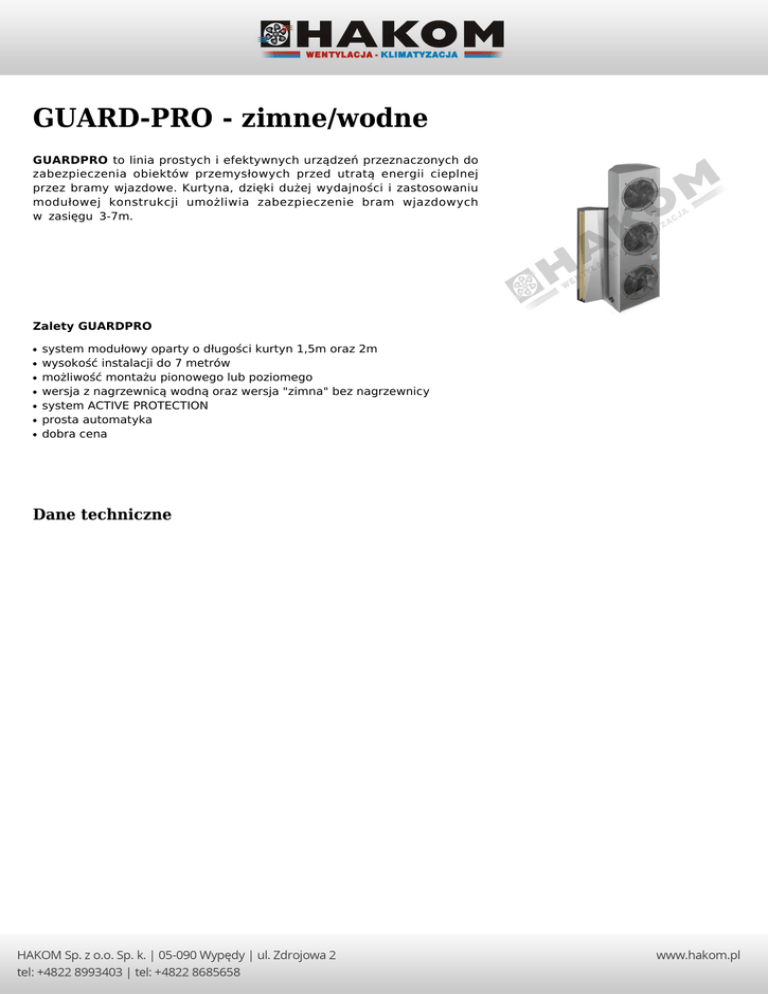 GUARD-PRO - zimne/wodne GUARDPRO to linia prostych i efektywnych urządzeń przeznaczonych do zabezpieczenia obiektów przemysłowych przed utratą energii cieplnej przez bramy wjazdowe. Kurtyna, dzięki dużej wydajności i zastosowaniu modułowej konstrukcji umożliwia zabezpieczenie bram wjazdowych w zasięgu 3-7m. Zalety GUARDPRO ● ● ● ● ● ● ● system modułowy oparty o długości kurtyn 1,5m oraz 2m wysokość instalacji do 7 metrów możliwość montażu pionowego lub poziomego wersja z nagrzewnicą wodną oraz wersja "zimna" bez nagrzewnicy system ACTIVE PROTECTION prosta automatyka dobra cena Dane techniczne Montaż Uwagi montażowe ● ● ● ● ● minimalna odległość od sufitu/ściany 300 mm aby zwiększyć skuteczność kurtyny można zainstalować dwa zestawy kurtyn po obu stronach bramy wjazdowej strumień powietrza nawiewanego powinien być skierowany pod kątem 10° od osi bramy wjazdowej elementy łączące moduły wchodzą w zakres dostawy elementy łączące kurtynę z sufitem lub podłogą dostępne są opcjonalnie System ACTIVE PROTECTION W przypadku zastosowania montażu pionowego, innowacyjny system ACTIVE PROTECTION, poprzez modułowe połączenie kurtyny z nagrzewnicą wodną ( w dolnej części) z kurtyną zimną ( w górnej części) umożliwia minimalizację kosztów zużycia energii cieplnej. Ciepłe powietrze z dolnej kurtyny powietrznej miesza się z powietrzem z kurtyny zainstalowanej z góry, tworząc jednocześnie skuteczną barierę dla zimnego powietrza zewnętrznego Automatyka Regulator prędkości obrotowej SPEEDER ● ● ● ● Pięciostopniowa regulacja prędkości Możliwość sterowania 3 wentylatorami, regulator 2A (SPEEDER 3) Możliwość sterowania 6 wentylatorami, regulator 4A (SPEEDER 6) Możliwość sterowania 10 wentylatorami, regulator 7A (SPEEDER 10) Wyłącznik drzwiowy DOORSTOP ● ● ● Włączanie/wyłączanie silników kurtyny w momencie otwarcia/zamknięcia bramy wjazdowej Montaż w dolnej części prowadnicy drzwi podnoszonych Klasa ochrony IP67 Dobór Wiele budynków kubaturowych oraz obiektów wymagających stale otwartych drzwi, boryka się z problemem niepożądanego napływu zimnego lub ciepłego powietrza do wewnątrz obiektu. Zastosowanie przemysłowej kurtyny powietrznej GUARDPRO wyeliminuje ten problem i zapewni rozdzielenie warunków klimatycznych panujących wewnątrz budynku oraz tych na zewnątrz. Poniżej przedstawiamy kryteria doboru urządzeń GUARDPRO. Krok 1. Montaż poziomy Szerokość ościeżnicy drzwiowej powinna być mniejsza lub równa szerokości nawiewanego strumienia powietrza. Przemysłowe kurtyny GUARDPRO występują w dwóch długościach modułowych 1,5 m oraz 2 m. Należy zauważyć, iż w zależności od potrzeby możemy łączyć poszczególne segmenty modułowe zgodnie z dostępną kombinatoryką. Przykłady modułów: 4m 2m 3m 2m 3,5m 2m 1,5m 1,5m 6m 1,5m 2m 2m 2m Krok 2. Montaż pionowy Wysokość ościeżnicy drzwiowej powinna być mniejsza lub równa szerokości nawiewanego strumienia powietrza. Przemysłowe kurtyny GUARDPRO występują w dwóch długościach modułowych 1,5 m oraz 2 m. Należy zauważyć, iż w zależności od potrzeby możemy łączyć poszczególne segmenty modułowe zgodnie z dostępną kombinatoryką (schemat modułów powyżej). Krok 3. Wysokość montażu – zasięg strugi powietrza pion/poziom. Maksymalny zasięg strugi powietrza w układzie poziomym (wysokość drzwi) oraz w układzie pionowym (szerokość drzwi) wynosi 7 m.