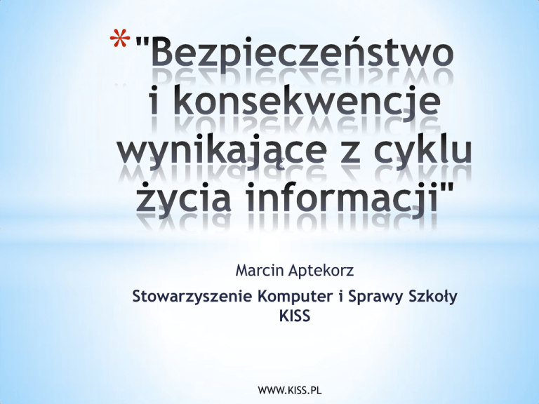 * Marcin Aptekorz Stowarzyszenie Komputer i Sprawy Szkoły KISS WWW.KISS.PL * Informacja - (łac. informatio – przedstawienie, wizerunek; informare – kształtować, przedstawiać) Narodziny informacji Ustalanie celu Życie, deformacja WWW.KISS.PL Osiągnięcie celu Efekt * • Jeden z pierwszych podręczników do nauki definiowania i manipulowania komputerowego informacją • Podstawa przedmiotu WDI na studiach informatycznych • Wyszukiwanie, sortowanie, stosy, szyfrowanie WWW.KISS.PL * • Definicja informacji o podłoży matematycznym • Lektura polecana jako podstawa szczegółowego studiowania informacji i sposobów jej mierzenia. WWW.KISS.PL * Treść Czas Forma Dostępność WWW.KISS.PL * • • • • Obserwacja Analiza Wyobraźnia Bodźce Obserwacja i analiza działania systemu informacyjnego, pozwala wnioskować o treści informacji jakie przetwarza. WWW.KISS.PL * * * * Domena Men.gov.pl PING men.gov.pl Adres 195.136.199.90 WHOIS 195.136.199.90 Serwer Exatel S.A WWW.KISS.PL * *Źródło: http://axatel.pl * Technologia Organizacja WWW.KISS.PL * Domena Treść Czas Adres ip Forma Dostępność Serwer WWW.KISS.PL * Narodziny informacji Ustalanie celu Życie, deformacja WWW.KISS.PL Osiągnięcie celu Efekt * • Nowa / innowacyjna informacja • Kolizja informacji • Wpływ informacji na środowisko tworzenie nowej • Informacje muszą być zgodne z prawdą • Z prawem • Z rozsądkiem i etyką (na przyszłość) WWW.KISS.PL * Informacja Sieć publiczna Sieć znajomy ch Sieć nieznajom ych WWW.KISS.PL * WWW.KISS.PL * • • • • • • • • Jaki cel chcemy osiągnąć? Czy cel jest osiągalny w optymalnym czasie? Czy cel uświęca środki ? Jakie środki jestem w stanie przeznaczyć na osiągnięcie celu? Jakie ryzyko jestem w stanie ponieść? Czy moja informacja dotyczy danych osobowych, praw autorskich? Jakie jest otoczenie, środowisko publikacji informacji. Jakie jest ryzyko konkurencyjności i innowacyjność naszej informacji? • • • • Czy stać nas na obsługę informacji Czy cel jest osiągalny? Jaką technologię wybrać Jaką ścieżkę wytyczyć informacji WWW.KISS.PL * WWW.KISS.PL * • Konieczność moderacji • Moderacja poprzez tworzenie nowych informacji, czy moderacja poprzez wycofanie treści? • Kontrola informacji • Promocja informacji • Ochrona prawna i egzekwowanie konsekwencji • Rutynowe wyszukiwanie fraz i słów kluczowych • Pozycjonowanie informacji w wyszukiwarkach • Sprawdzanie zabezpieczeń, rejestrów i logów. • Ochrona sieci i ochrona antywirusowa pracowni. • Zabezpieczenie fizyczne dokumentów + kontrola Monitoring zagrożeń! – Jaka technologia może zagrozić naszym informacjom. WWW.KISS.PL * • Czy warto przedłużać życie informacji? • Jakie konsekwencje wynikną z kontynuowania, przedłużania życia informacji? Technologia Złoty przepis na udane życie informacji Czas WWW.KISS.PL Idea * Koszt usunięcia informacji Koszt optymalny Duży kosz utrzymania efektu • Efekt też trzeba kontrolować. • Czy efekt jest prawidłowy? • Czy efekt nie wywołuje niepożądanych informacji? WWW.KISS.PL * KIEDY USUWAĆ INFORMACJE: • Nieaktualność • Zagrożenie prawne i inne • Wywołują niekontrolowany efekt lub same wymykają się spod kontroli JAK USUWAĆ INFORMACJE Z INTERNETU: • Mechanizmy wyszukiwarek i techniki internetowe • Kontakt administratorami serwisów powielających informacje • Poprzez egzekwowanie praw WWW.KISS.PL * 5000 0 0 2 lata WWW.KISS.PL 5 lat * Informacja Nasza informacja Informacja WWW.KISS.PL * Informacja Modyfikacja Kontrola Analiza Cel WWW.KISS.PL NAUKA Dziękuję za uwagę WWW.KISS.PL