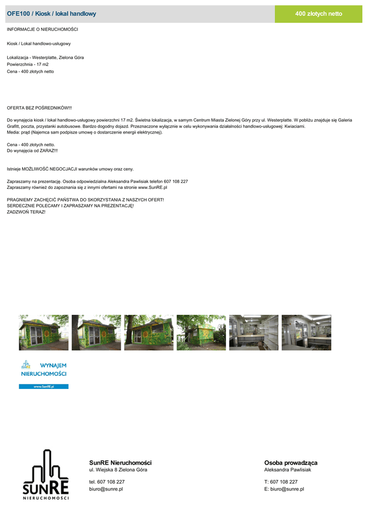 OFE100 / Kiosk / lokal handlowy 400 złotych netto INFORMACJE O NIERUCHOMOŚCI Kiosk / Lokal handlowo-usługowy Lokalizacja - Westerplatte, Zielona Góra Powierzchnia - 17 m2 Cena - 400 złotych netto OFERTA BEZ POŚREDNIKÓW!!! Do wynajęcia kiosk / lokal handlowo-usługowy powierzchni 17 m2. Świetna lokalizacja, w samym Centrum Miasta Zielonej Góry przy ul. Westerplatte. W pobliżu znajduje się Galeria Grafitt, poczta, przystanki autobusowe. Bardzo dogodny dojazd. Przeznaczone wyłącznie w celu wykonywania działalności handlowo-usługowej: Kwiaciarni. Media: prąd (Najemca sam podpisze umowę o dostarczenie energii elektrycznej). Cena - 400 złotych netto. Do wynajęcia od ZARAZ!!! Istnieje MOŻLIWOŚĆ NEGOCJACJI warunków umowy oraz ceny. Zapraszamy na prezentację. Osoba odpowiedzialna Aleksandra Pawlisiak telefon 607 108 227 Zapraszamy również do zapoznania się z innymi ofertami na stronie www.SunRE.pl PRAGNIEMY ZACHĘCIĆ PAŃSTWA DO SKORZYSTANIA Z NASZYCH OFERT! SERDECZNIE POLECAMY I ZAPRASZAMY NA PREZENTACJĘ! ZADZWOŃ TERAZ! SunRE Nieruchomości Osoba prowadząca ul. Wiejska 8 Zielona Góra Aleksandra Pawlisiak tel. 607 108 227 [email protected] T: 607 108 227 E: [email protected]