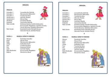 OBSADA: PROLOG: Gwiazdor 1 Gwiazdor 2 Gwiazdor 3 Aniołeczek 1 Aniołeczek 2 Miotlarka Diabełek Małe Góralki: Mali Górale: OBSADA: PROLOG: Lewandowska Gabriela Maciejewska Aleksandra Trzaska Karolina Okorafor Bianka Murza Maja Sowińska Klaudia Szurowska Gabriela Kołodziej Kamila, Kordek Aleksandra, Kroszczyńska Magdalena, Lipińska Urszula, Piwek Adrianna, Sokólska Aleksandra Kamiński Kostek, Michalik Kacper, Zalewski Patryk, Zieliński Maciej Gwiazdor 1 Gwiazdor 2 Gwiazdor 3 Aniołeczek 1 Aniołeczek 2 Miotlarka Diabełek Małe Góralki: Lewandowska Gabriela Maciejewska Aleksandra Trzaska Karolina Okorafor Bianka Murza Maja Sowińska Klaudia Szurowska Gabriela Kołodziej Kamila, Kordek Aleksandra, Kroszczyńska Magdalena, Lipińska Urszula, Piwek Adrianna, Sokólska Aleksandra Kamiński Kostek, Michalik Kacper, Zalewski Patryk, Zieliński Maciej Mali Górale: * SCENA 1: Maryja Józef Baba Chłop Pani Pan Gość Mała Biedronka Babcia MARYJA I JÓZEF W DRODZE Kamińska Danielka Muszel Piotr Maciejewska Aleksandra Podsiadło Paweł Trzaska Karolina Kasprzak Michał Sawicka Natalia Kroszczyńska Magdalena Mroziewicz Basia * SCENA 1: MARYJA I JÓZEF W DRODZE Maryja Józef Baba Chłop Pani Pan Gość Mała Biedronka Babcia Kamińska Danielka Muszel Piotr Maciejewska Aleksandra Podsiadło Paweł Trzaska Karolina Kasprzak Michał Sawicka Natalia Kroszczyńska Magdalena Mroziewicz Basia SCENA 2: SCENA PASTERSKA Góralik Bartek Kuba Michał Walek Baca Małgorzatka Dziewczyny: Anioł Śpiewający SCENA 2: Kamiński Kostek Okorafor Patrycja Sawczuk Mariusz Kasprzak Michał Piotrowska Natalia Podsiadło Paweł Piwek Adrianna Kordek Aleksandra, Kołodziej Kamila, Lipińska Urszula, Sokólska Aleksandra, Sowińska Klaudia, Szczurowska Gabriela Mroziewicz Basia SCENA PASTERSKA Góralik Bartek Kuba Michał Walek Baca Małgorzatka Dziewczyny: Kamiński Kostek Okorafor Patrycja Sawczuk Mariusz Kasprzak Michał Piotrowska Natalia Podsiadło Paweł Piwek Adrianna Kordek Aleksandra, Kołodziej Kamila, Lipińska Urszula, Sokólska Aleksandra, Sowińska Klaudia, Szczurowska Gabriela Anioł Śpiewający Mroziewicz Basia * * SCENKA TRZY KRÓLOWE w/g tekstu ks. Jana Twardowskiego Muszel Łucja SCENKA TRZY KRÓLOWE w/g tekstu ks. Jana Twardowskiego Muszel Łucja * SCENA 3: W PAŁACU HERODA Herod Lewicki Aleksander Herodowa Wiśniewska Julia Dworzanin 1 Maciejewska Aleksandra Dworzanin 2 Sawicka Natalia Śmierć Murza Julia Diabeł1 Górajska Matylda Diabeł 2 Zalewska Wiktoria Król Kacper Król Melchior Król Baltazar * Karsznia Andrzej Dębek Marcin/ Rzepko Radosław Pudełek Krzysztof SCENA 3: W PAŁACU HERODA Herod Lewicki Aleksander Herodowa Wiśniewska Julia Dworzanin 1 Maciejewska Aleksandra Dworzanin 2 Sawicka Natalia Śmierć Murza Julia Diabeł1 Górajska Matylda Diabeł 2 Zalewska Wiktoria Król Kacper Król Melchior Król Baltazar * SCENA 4: Aniołki W STAJENCE Kołodziej Kamila, Kordek Aleksandra, Lipińska Urszula, Murza Maja, Okorafor Bianka, Sowińska Klaudia, Szczurowska Gabriela Karsznia Andrzej Dębek Marcin/ Rzepko Radosław Pudełek Krzysztof * SCENA 4: Aniołki W STAJENCE Kołodziej Kamila, Kordek Aleksandra, Lipińska Urszula, Murza Maja, Okorafor Bianka, Sowińska Klaudia, Szczurowska Gabriela