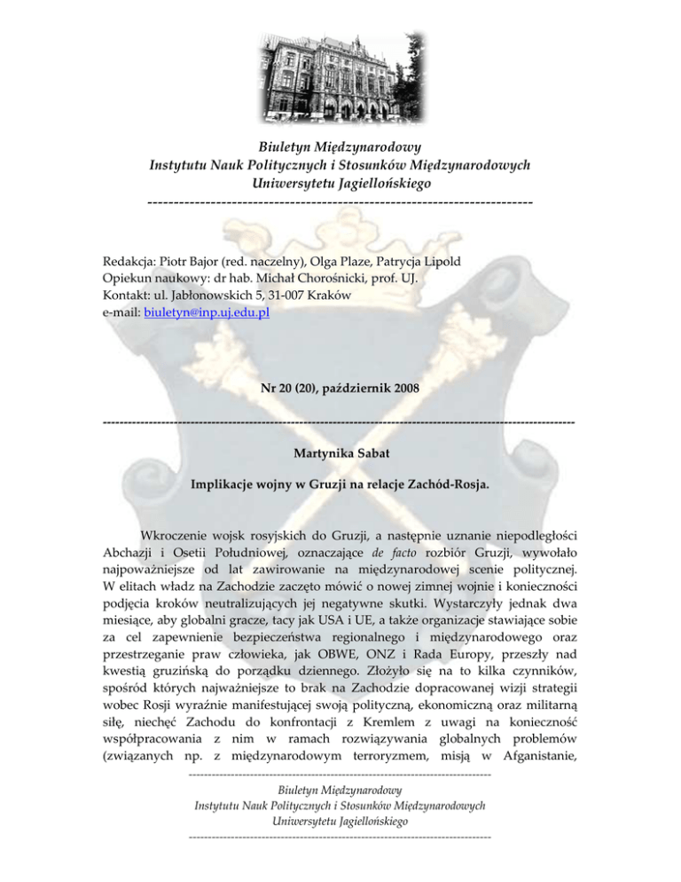 Biuletyn Międzynarodowy Instytutu Nauk Politycznych i Stosunków Międzynarodowych Uniwersytetu Jagiellońskiego ------------------------------------------------------------------------- Redakcja: Piotr Bajor (red. naczelny), Olga Plaze, Patrycja Lipold Opiekun naukowy: dr hab. Michał Chorośnicki, prof. UJ. Kontakt: ul. Jabłonowskich 5, 31-007 Kraków e-mail: [email protected] Nr 20 (20), październik 2008 ----------------------------------------------------------------------------------------------------------------Martynika Sabat Implikacje wojny w Gruzji na relacje Zachód-Rosja. Wkroczenie wojsk rosyjskich do Gruzji, a następnie uznanie niepodległości Abchazji i Osetii Południowej, oznaczające de facto rozbiór Gruzji, wywołało najpoważniejsze od lat zawirowanie na międzynarodowej scenie politycznej. W elitach władz na Zachodzie zaczęto mówić o nowej zimnej wojnie i konieczności podjęcia kroków neutralizujących jej negatywne skutki. Wystarczyły jednak dwa miesiące, aby globalni gracze, tacy jak USA i UE, a także organizacje stawiające sobie za cel zapewnienie bezpieczeństwa regionalnego i międzynarodowego oraz przestrzeganie praw człowieka, jak OBWE, ONZ i Rada Europy, przeszły nad kwestią gruzińską do porządku dziennego. Złożyło się na to kilka czynników, spośród których najważniejsze to brak na Zachodzie dopracowanej wizji strategii wobec Rosji wyraźnie manifestującej swoją polityczną, ekonomiczną oraz militarną siłę, niechęć Zachodu do konfrontacji z Kremlem z uwagi na konieczność współpracowania z nim w ramach rozwiązywania globalnych problemów (związanych np. z międzynarodowym terroryzmem, misją w Afganistanie, ------------------------------------------------------------------------------Biuletyn Międzynarodowy Instytutu Nauk Politycznych i Stosunków Międzynarodowych Uniwersytetu Jagiellońskiego ------------------------------------------------------------------------------- programem jądrowym Iranu), niezdolność i jednocześnie niechęć UE do zajęcia ultymatywnego stanowiska wobec Rosji, skupienie się Waszyngtonu na sprawach krajowych w związku z nadchodzącą zmianą władzy w Białym Domu, a także koncentracja uwagi Amerykanów i Europejczyków na przeciwdziałaniu drastycznie pogłębiającemu się kryzysowi na rynkach finansowych. Istotny wkład w zneutralizowanie znaczenia sierpniowych wydarzeń w Gruzji mają również działania propagandowe Rosji skierowane wobec Zachodu, skutecznie podważające wiarygodność i intencje władz w Tbilisi w jej konflikcie z FR oraz sprawnie tłumaczące politykę Kremla na Kaukazie. Wszystkie te elementy sprawiają, że oddala się scenariusz ponownego wejścia Zachodu i Rosji w erę zimnej wojny, o którym głośno mówiono jeszcze w sierpniu br. Żadna ze stron, a zwłaszcza Zachód, po prostu tego nie chce. Reakcje Zachodu na inwazję rosyjską w Gruzji W pierwszych dniach inwazji na Gruzję, bezwzględność rosyjskich działań spowodowała, że na Zachodzie – zarówno w USA, jak i w Europie – zaczęto mówić o konieczności wprowadzenia poważnych sankcji politycznych lub ekonomicznych wobec FR. Brano pod uwagę m. in. zamrożenie kontaktów dyplomatycznych z Rosją, wykluczenie jej z G8, zawieszenie członkostwa w międzynarodowych organizacjach, zablokowanie wejścia do WTO, wstrzymanie unijno-rosyjskich negocjacji w sprawie nowego PCA oraz finansowania projektów inwestycyjnych w Rosji przez unijne banki, odebranie Rosji organizacji igrzysk olimpijskich w Soczi w 2014 r., skłonienie Niemiec do rezygnacji ze współpracy w ramach budowy Nord Streamu, a wreszcie – co byłoby największą karą dla Moskwy – przyznanie w grudniu br. Gruzji i Ukrainie Planu Działań na Rzecz Członkostwa w NATO. Sposób prowadzenia przez Rosję działań na Kaukazie zjednoczył Stany Zjednoczone i Europę. Szybko okazało się jednak, że na krótko. Gdy w połowie sierpnia USA zawiesiły współpracę wojskową i atomową z Rosją, a Sojusz Północnoatlantycki wstrzymał prace Rady Rosja-NATO do czasu wypełnienia przez stronę rosyjską postanowień porozumienia pokojowego z 12 sierpnia, a wiceprezydent D. Cheney przekonywał swoich europejskich partnerów do przyznania Gruzji MAP, wewnątrz UE zaczęły pojawiać się opinie, iż trudno jednoznacznie ocenić, kto zaczął konflikt w Osetii Południowej i Abchazji. Wobec tego jakiekolwiek próby karania Rosji na tym etapie wyjaśniania kwestii gruzińskiej nie powinny wchodzić w rachubę. Stany Zjednoczone zaczęły też silniej niż Europejczycy podnosić temat wypracowania przez NATO nowej strategii obronnej, ------------------------------------------------------------------------------Biuletyn Międzynarodowy Instytutu Nauk Politycznych i Stosunków Międzynarodowych Uniwersytetu Jagiellońskiego ------------------------------------------------------------------------------- odpowiadającej na zagrożenie ze strony Rosji. Na uznanie 26 sierpnia przez Rosję separatystycznych republik zarówno w USA, jak i UE zareagowano jedynie słowami potępienia. Państwa europejskie z większym zrozumieniem niż Amerykanie przyjęły argumentację Rosji w sprawie przekroczenia przez jej wojska granicy z Gruzją i z większym krytycyzmem oceniały intencje prezydenta M. Saakaszwilego. Przekonująco dla wielu państw europejskich brzmiało motywowanie przez Moskwę działań militarnych koniecznością obrony praw mniejszości rosyjskiej w Gruzji. Ponadto Unia musiała mieć na uwadze nieustannie przypominany przez Rosję casus Kosowa, jako analogii do sytuacji Abchazji i Osetii Południowej. To wszystko wpłynęło zapewne na to, iż decyzje podjęte 1 września na nadzwyczajnym szczycie UE w Brukseli w sprawie sytuacji w Gruzji i dalszych stosunków z FR, a także następujące po nim działania i deklaracje przedstawicieli europejskich państw i instytucji, były dla Rosji – zgodnie z jej przewidywaniami – stosunkowo 