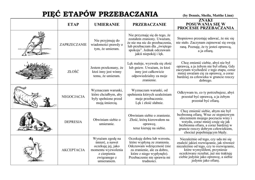 PIĘĆ ETAPÓW PRZEBACZANIA (by Dennis, Sheila, Matthe Linn) UMIERANIE PRZEBACZANIE ZNAKI POSUWANIA SIĘ W PROCESIE PRZEBACZANIA Nie przyjmuję do wiadomości prawdy o tym, że umieram. Nie przyznaję się do tego, że zostałem zraniony. Uważam, że nie ma nic do przebaczenia, lub przebaczam dla „świętego spokoju”. Jednak odczuwam jakiś niepokój i lęk. Stopniowo przestaję udawać, że nic się nie stało. Zaczynam zajmować się swoją raną. Poznaję, że ty jesteś oprawcą, a ja ofiarą. ZŁOŚĆ Jestem przekonany, że ktoś inny jest winny temu, że umieram. Lęk maleje, wyzwala się złość lub gniew. Uważam, że ktoś inny jest całkowicie odpowiedzialny za moje zranienie. Chcę zmienić ciebie, abyś nie był oprawcą, a ja żebym nie był ofiarą. Gdy zaczynam wychodzić z tego etapu, coraz mniej uważam cię za oprawcę, a coraz bardziej za człowieka w gruncie rzeczy dobrego. NEGOCJACJA Wyznaczam warunki, które chciałbym, aby były spełnione przed moją śmiercią. Wyznaczam warunki, od spełnienia których uzależniam moje przebaczenie. Lęk i złość słabnie. Odkrywam to, co ty potrzebujesz, abyś przestał być oprawcą, a ja żebym przestał być ofiarą. Chcę zmienić siebie, abym nie był bezbronną ofiarą. Wraz ze stopniowym uleczeniem mojego poczucia winy i wstydu, coraz mniej czuję się jak bezbronna ofiara, a coraz bardziej w gruncie rzeczy dobrym człowiekiem, chociaż popełniającym błędy. Niezależnie od tego, czy uda mi się znaleźć jakieś rozwiązanie, jak również niezależnie od tego, czy to rozwiązanie, które wymyśliłem, przyniesie oczekiwany rezultat, już nie traktuję ciebie jedynie jako oprawcę, a siebie jedynie jako ofiarę. ETAP ZAPRZECZANIE DEPRESJA Obwiniam siebie o umieranie. Obwiniam siebie o zranienie. Złość, którą kierowałem na oprawcę, teraz kieruję na siebie. AKCEPTACJA Wyrażam zgodę na śmierć, a nawet oczekuję jej, jako momentu wyzwolenia z cierpienia związanego z umieraniem. Oczekuję dobra lub wzrostu, które wypłyną ze zranienia. Odczuwam wdzięczność (nie za zranienie, ale za dobro, które z niego wypłynęło). Przebaczenie nie sprawia mi trudności.
