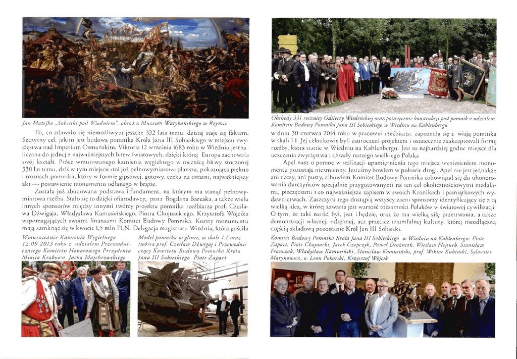 —. • -* .• Jan Matejko „Sobieskipod Wiedniem", obraz z Muzeum Watykanskiego w Rzymie To, CO zdawato si? niemozliwym jeszcze 332 lata temu, dzisiaj scaje si? faktem. Szczytny eel, jakim jest budowa pomnika Krola Jana III Sobieskiego w miejscu zwyci^stwa nad Impcrium Osmariskim. Viktoria 12 wrzesnia 1683 roku w Wiedniu jestzaliczana do jednej z najwazniejszych bitewswiatowych, dzi?ki ktorej Europazachowala swoj ksztalt. Procz wmurowanego kamienia w^gielnego w rocznic? bitwy stoczonej 330 lat temu, dzis w tym miejscu stoi juzpclnowymiarowa plansza, pokazujqca pi^kno i rozmach pomnika, ktory w formie gipsowej, gotowy, czeka na ostatni, najwazniejszy akt — postawienie monumentu odlanego w br^zie. Zostaia juz zbudowana podstawa i fundament, na ktorym ma stance pelnowymiarowarzezba. StaJo si? to dzi?ki ofiarodawcy, pana Bogdana Barzaka, a takze wielu innych sponsomw mi?dzy innymi tworcy projektu pomnika rzczbiarza prof. Czestawa Dzwigaja, Wtadyslawa Kamusiriskiego, Piotra Chojnackicgo, Krzysztofa Wojcika wspomagaj^cych swoimi finansami Komitct Budowy Pomnika. Koszty monumentu majj\ zamkn^c .si? w kwocie 1,5 mln PLN. Dclegacja magiscratu Wiednia, ktora goscila Wmurowanie Kamienia Wfgielnego 12.09.2013 roku z udzialem Przewodni- czqcego Komitetu Honorowego Prezydenta Miasta Krakowa Jacka Majchrowskiego Model pomnika wglinie, w skali 1:1 oraz tworcaprof. Czeslaw Dzwigaj i Przewodniczqcy Komitetu Budowy Pomnika Krola Jana III Sobieskiego Piotr Zapart Obchody 331 rocznicy Odsieczy Wiedetiskiej oraz poswifcenie konstrukcji podpomnik z udzialem Komitetu Budowy Pomnika Jana 111 Sobieskiego w Wiedniu na Kahlenbergu w dniu 30 czerwca 2014 roku w pracowni rzezbiarza, zapoznala si? z wizj^ pomnika w skali 1:1. Jej czlonkowie byli zauroczeni projektem i ostatecznie zaakceptowali form? rzezby, ktorastanie w Wiedniu na Kahlenbergu. Jest to najbardzicj godne miejsce dla uczczenia zwyci?stwa i chwaJy nas/.ego wielkiego Polaka. Apel nasz o pomoc w realizacji upami?tnicnia tego miejsca wzniesicnicm monu mentu pozostaje niezmienny. Jestesmy bowiem w polowicdrogi. Apel nic jest jednakze ani czczy, ani pusty, albowiem Komitet Budowy Pomnika zobowi^zat si? do uhonorowania darczyricow specjalnie przygotowanymi na ten eel okolicznosciowymi medalami, piecz?ciami i co najwazniejsze zapisem w swoich Kronikach i pami^tkowych wy- dawnictwach. Zaszczytu tego dost^pi^ wszyscy zacni sponsorzy identyfikuj^cy si? z t^ wielk^ ide^, w ktorej zawarta jestwartosc tolsamosci Polakow w .swiatowej cywilizacji. O tym, ze taki narod byl, jest i b?dzie, oraz ze ma wielk^ sii? przetrwania, a takze demonstracji wlasnej, odr?bnej, acz przeciez triumfalnej kultury, ktorej nieodt^czn^ cz?sci.'| skladow^ pozostanie Krol Jan III Sobieski. Komitet Budowy Pomnika Krola Jana III Sobieskiego w Wiedniu na Kahlenbergu: Piotr Zapart, Piotr Chojnacki, Jacek Czepczyk, Pawel Drozniak, Wieslaw Flejtuch, Stanislaw Franczak. Wladyslaw Kamusinski, Stanislaw Komusinski, prof. Wiktor Kubinski, Sylwester Marynowicz, o. Leon Pokorski. KrzysztofWojcik
