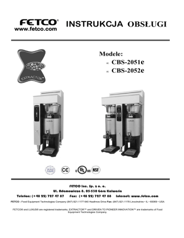 www.fetco.com INSTRUKCJA OBSŁUGI Modele: • CBS-2051e • CBS-2052e FETCO Inc. Sp. z o. o. Ul. Adamowicza 8, 05-530 Góra Kalwaria Telefon: (+48 22) 727 47 87 Fax: (+48 22) 727 47 88 Internet: www.fetco.com FETCO - Food Equipment Technologies Company (847) 821-1177 640 Heathrow Drive Fax: (847) 821-1178 Lincolnshire • IL • 60069 • USA FETCO® and LUXUS® are registered trademarks, EXTRACTOR™ and DRIVEN TO PIONEER INNOVATION™ are trademarks of Food Equipment Technologies Company. OPIS I CECHY WYRÓśNIAJĄCE Zaparzacze CBS – 2051e i CBS – 2052e są przedstawicielami naszej nowej technologii parzenia kawy, nazwanej parzeniem impulsowym. Operator moŜe zaprogramować zmienne dla kaŜdej wielkości wsadu: • Objętość zaparzania • Objętość wstępnego zraszania • Czas cyklu zaparzania • Opóźnienie wstępnego zraszania, (czas pomiędzy końcem • Opóźnienie ociekania zraszania wstępnego, a początkiem cyklu zaparzania) UŜywając tych zmiennych, program wylicza ile wody naleŜ zuŜyć do zraszania i zaparzania. Całkowity czas zaparzania jest podzielony na 30-to sekundowe impulsy. W czasie trwania impulsu, program oblicza jak długo naleŜy spryskiwać zmieloną kawę wodą i jak długa musi być przerwa przed rozpoczęciem następnego impulsu. CECHY • Dwie (trzy) moŜliwości parzenia na kaŜdej stronie • Kontrolowane elektronicznie dozowanie gorącej wody • Elektronicznie sterowana blokada kosza(y) • Regulowane zraszanie wstępne • Utrzymanie temperatury zaparzania • Uniwersalne podłączenia (na 1, 3 fazy) SPECYFIKACJA WYROBU Wymagania • Instalacja elektryczna: Patrz strona z konfiguracją elektryczną. • Filtry do kawy: 15” x 5 ½ ” FETCO – produkt # F001 • Instalacja wodna: CBS-2051e: 1,4 – 5,5 atm., 4 l/min, CBS-2052e: 1,4 – 5,5 atm., 6 l/min WAGA I POJEMNOŚĆ Model Waga Pojemność Zbiornika (netto) & Waga CBS-2051e CBS-2052e 25 kg 41,4 kg 5.5gal/21l 10.3gal./38,9l Waga (brutto) Termos, Waga (netto) Termos, Waga (brutto) Waga całkowita z napełnionym(i) termosem(ami) 46 kg 80,1 kg 3,8 kg 3,8 kg 9,4 kg 9,4 kg 55,5 kg 99 kg 21 kg 38,7 kg KONFIGURACJA ELEKTRYCZNA, WYDAJNOŚĆ CBS-2051e (EUROPA) 6 l, 1.5Galona = Porcja Oznaczenie Grzałki Napięcie Ilość Okablo- KW Maksymalne Elektryczne (AC) faz wanie ObciąŜenie [A] E51026 2 x 3 KW 230 jedna 2 + uziemienie 2 5.2 23.4 Porcji / h* (max 11) Woda Woda zimna ciepła 8.9 11.0 CBS-2052e (EUROPA) 6 l, 1.5Galona = Porcja Oznaczenie Grzałki Napięcie Ilość Okablo- KW Maksymalne ObciąŜenie Elektryczne (AC) faz wanie [A] E52036 2 x 3 KW 230 jedna 2 + uziemienie 5.2 23.4 CBS-2051e (USA & Kanada) 6 l, 1.5Galona = Porcja Oznaczenie Grzałki Napięcie Ilość Okablo- KW Maksymalne Elektryczne (AC) faz wanie ObciąŜenie [A] E51016 2 x 3 KW 120/208 120/220 120/240 jedna 3 + uziemienie 4.6 5.2 6.1 22.1 23.4 25.5 CBS-2052e (USA & Kanada) 6 l, 1.5 Galona = Porcja Oznaczenie Grzałki Napięcie Ilość Okablo- KW Maksymalne Elektryczne (AC) faz wanie ObciąŜenie [A] E52016 Uniwersalne Okablowanie Grzałki 3 x 3 KW Opcja 1; 2 x 3 KW (ust. fab.) Opcja 2; 3 x 3 KW 120/208 120/220 120/240 120/208 120/220 120/240 E52026 Uniwersalne Okablowanie Grzałki 3 x 5 KW Opcja 1; 2 x 5 KW 120/208 120/220 120/240 120/208 120/220 120/240 Opcja 2; 3 x 5 KW (ust. fab.) jedna 3 + uziemienie trzy 4 + uziemienie jedna 3 + uziemienie trzy 4 + uziemienie * - Wg ustawień fabrycznych: 4.0 min. czas parzenia 0% - zraszanie, 0% bypass, temp. wody 93˚C. 3 Porcji / h* (max 11) Woda Woda zimna ciepła 8.9 21.26 Porcji / h* (max 11) Woda Woda zimna ciepła 7.7 8.9 10.3 11.0 11.0 11.0 Porcji / h* (max 22) Woda Woda zimna ciepła 4.6 5.2 6.1 6.9 7.7 9.1 22.4 23.7 25.8 19.5 21.3 22.5 7.7 8.9 10.3 11.5 13.4 15.4 18.6 21.6 22.0 22.0 22.0 22.0 7.6 8.8 10.1 11.4 13.2 15.1 36.9 40.3 42.5 32.0 35.0 36.9 12.8 14.9 17.1 19.2 22.0 22.0 22.0 22.0 22.0 22.0 22.0 22.0 WYMIARY CBS-2051e WYMIARY CBS-2052e 4 INSTALACJA Wyłącznie przez wykwalifikowany personel. WSKAZÓWKI Jeśli zaparzacz nie zostanie zainstalowany przez wykwalifikowany personel, moŜe pracować niewłaściwie lub ulec uszkodzeniu. Uszkodzenia powstałe na skutek niewłaściwej instalacji nie podlegają gwarancji. Przed rozpoczęciem instalowania naleŜy rozwaŜyć następujące zagadnienia: Zasilanie: ► Wszystkie wyroby FETCO wymagają przewodu zerowego, uziemienie nie jest wystarczającą ochroną. Podłączenie bez przewodu zerowego moŜe spowodować uszkodzenie elektroniki. ► Schemat elektryczny znajduje się w środku dolnej pokrywy. ► Podłączenie musi być wykonane zgodnie z obowiązującymi przepisami Podłączenie do instalacji wodociągowej: ► Musi spełniać odpowiednie przepisy. ► Przewody rurowe, dostarczające wodę muszą być starannie przepłukane przed podłączeniem zaparzacza w celu uniknięcia jego zanieczyszczenia. ► Sprawdź, czy linia wodociągowa zapewnia odpowiedni przepływ wody; 4 l/min dla CBS 2051e i 6 l/min dla CBS 2052e (przed przyłączeniem zaparzacza). Ogólne: Posługuj się wyłącznie wykwalifikowanym personelem serwisowym, listę naszych serwisantów znajdziesz na: http://www.fetco.com INSTALACJA 1. 2. 3. 4. 5. Ustawienie zaparzacza Sprawdź wymiary urządzenia którego zamierzasz zainstalować. Upewnij się czy zmieści się w miejscu na to przeznaczonym i czy stół lub parapet bufetu utrzyma całkowitą masę zaparzacza i napełnionych termosów. NóŜki zaparzacza znajdują się wewnątrz pojemnika na filtr i kawę. Wyjmij pojemnik i termos (termosy), połóŜ zaparzacz na „plecach” i wkręć nóŜki. Ustaw zaparzacz na miejscu do tego przeznaczonym. Wypoziomuj zaparzacz (płaszczyznę podstawy) poprzez regulację nóŜek. Zdejmij dolną pokrywę aby mieć dostęp do podłączeń elektrycznych i wodnych, końcówki znajdują się na tylnej ścianie, przy podstawie. Uwaga: Maszyna powinna być ustawiona na stole. 1. 2. 3. 4. Podłączenie wody Wlot wody posiada końcówkę „męską” o średnicy 3/8 cala z 