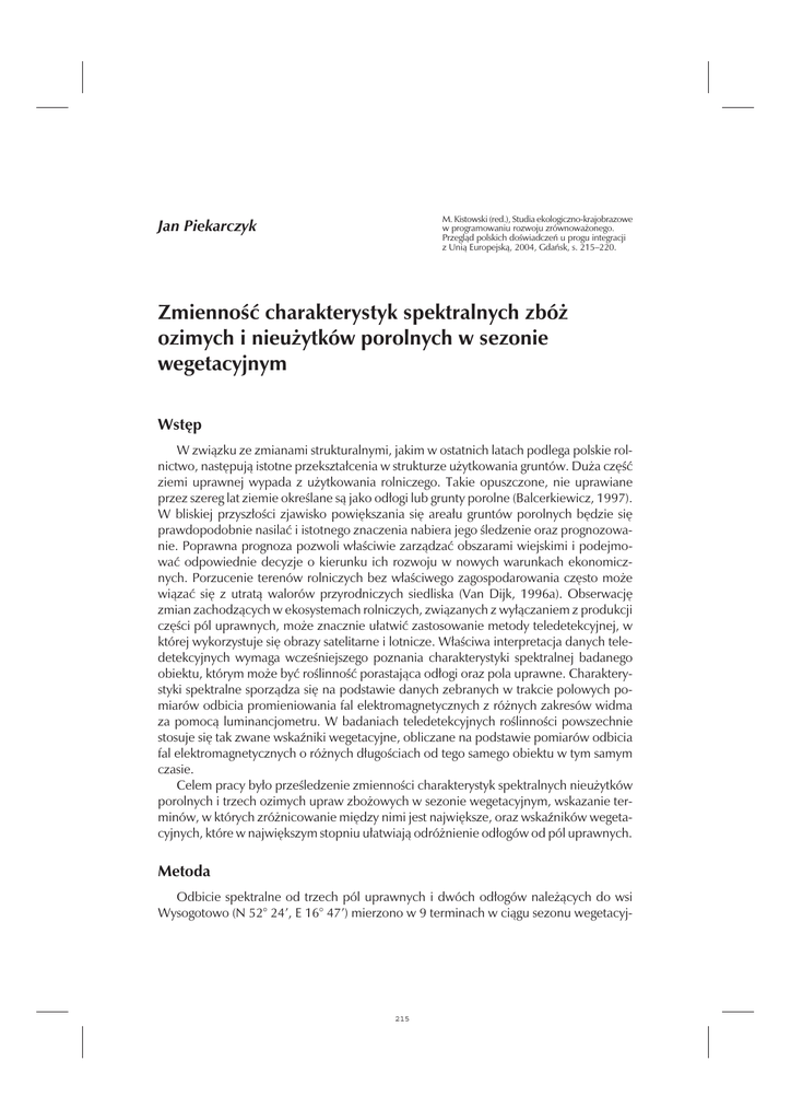 M. Kistowski (red.), Studia ekologiczno-krajobrazowe w programowaniu rozwoju zrównoważonego. Przegląd polskich doświadczeń u progu integracji z Unią Europejską, 2004, Gdańsk, s. 215–220. Jan Piekarczyk Zmienność charakterystyk spektralnych zbóż ozimych i nieużytków porolnych w sezonie wegetacyjnym Wstęp W związku ze zmianami strukturalnymi, jakim w ostatnich latach podlega polskie rolnictwo, następują istotne przekształcenia w strukturze użytkowania gruntów. Duża część ziemi uprawnej wypada z użytkowania rolniczego. Takie opuszczone, nie uprawiane przez szereg lat ziemie określane są jako odłogi lub grunty porolne (Balcerkiewicz, 1997). W bliskiej przyszłości zjawisko powiększania się areału gruntów porolnych będzie się prawdopodobnie nasilać i istotnego znaczenia nabiera jego śledzenie oraz prognozowanie. Poprawna prognoza pozwoli właściwie zarządzać obszarami wiejskimi i podejmować odpowiednie decyzje o kierunku ich rozwoju w nowych warunkach ekonomicznych. Porzucenie terenów rolniczych bez właściwego zagospodarowania często może wiązać się z utratą walorów przyrodniczych siedliska (Van Dijk, 1996a). Obserwację zmian zachodzących w ekosystemach rolniczych, związanych z wyłączaniem z produkcji części pól uprawnych, może znacznie ułatwić zastosowanie metody teledetekcyjnej, w której wykorzystuje się obrazy satelitarne i lotnicze. Właściwa interpretacja danych teledetekcyjnych wymaga wcześniejszego poznania charakterystyki spektralnej badanego obiektu, którym może być roślinność porastająca odłogi oraz pola uprawne. Charakterystyki spektralne sporządza się na podstawie danych zebranych w trakcie polowych pomiarów odbicia promieniowania fal elektromagnetycznych z różnych zakresów widma za pomocą luminancjometru. W badaniach teledetekcyjnych roślinności powszechnie stosuje się tak zwane wskaźniki wegetacyjne, obliczane na podstawie pomiarów odbicia fal elektromagnetycznych o różnych długościach od tego samego obiektu w tym samym czasie. Celem pracy było prześledzenie zmienności charakterystyk spektralnych nieużytków porolnych i trzech ozimych upraw zbożowych w sezonie wegetacyjnym, wskazanie terminów, w których zróżnicowanie między nimi jest największe, oraz wskaźników wegetacyjnych, które w największym stopniu ułatwiają odróżnienie odłogów od pól uprawnych. Metoda Odbicie spektralne od trzech pól uprawnych i dwóch odłogów należących do wsi Wysogotowo (N 52° 24’, E 16° 47’) mierzono w 9 terminach w ciągu sezonu wegetacyj- 215 216 Jan Piekarczyk nego w roku 2002. Daty wykonania pomiarów spektralnych, fazy rozwojowe, w jakich znajdowały się wówczas rośliny, oraz stopień, w jakim pokrywały glebę, przedstawia tabela 1. We wszystkich dziewięciu terminach na każdym polu i odłogu wykonywano trzy pomiary odbicia spektralnego w pięciu losowo wybranych punktach. Odłogi były porośnięte roślinnością o zbliżonym składzie botanicznym, w którym dominowały trawy (tab. 2). Wyniki pomiarów spektralnych uzyskane na odłogach zostały uśrednione. Odbicie promieniowania słonecznego mierzono przy użyciu luminancjometru polowego CIMEL CE 313–21, o polu widzenia wynoszącym 10°, rejestrującego luminancję w pięciu następujących kanałach: 450, 550, 650, 850 i 1650 nm. Głowica luminancjometru była zamontowana na ręcznym statywie, na wysokości 250 cm. Pomiary wykonywano w dni bezchmurne, w kierunku nadirowym, przy najwyższym położeniu zenitalnym Słońca w danym dniu. Przed rozpoczęciem i po zakończeniu każdej serii pomiarowej rejestrowano wartość luminancji halonowego wzorca bieli, dzięki czemu dla każdej fali można było obliczyć spektralny współczynnik odbicia (SWO), definiowany jako stosunek Tabela 1. Fazy rozwojowe trzech gatunków zbóż ozimych (Fr) i stopień pokrycia gleby przez rośliny (Pg) w dniach, gdy wykonywano pomiary spektralne w sezonie wegetacyjnym 2002 roku Table 1. Growing stages of winter grain crops (Gs) and ground cover (Gc) on dates of spectral measurements Gatunki zbóż 18.03. 29.03. 23.04. 02.05. 10.05. 22.05. 04.06. 18.06. 19.08. Fr Fr Fr Fr Fr Fr Fr Fr Fr Pg Pg Pg Pg Pg Pg Pg Pg Pg Gs Gc Gs Gc Gs Gc Gs Gc Gs Gc Gs Gc Gs Gc Gs Gc Gs Gc [%] [%] [%] [%] [%] [%] [%] [%] [%] Pszenica ozima Winter wheat 2 44 2 49 2 97 3 100 3 100 5 100 6 99 7 95 – – Jęczmień ozimy Winter barley 2 98 2 99 3 100 3 100 5 100 6 100 8 100 8 98 – – Żyto ozime Winter rye 2 54 2 90 3 96 3 100 5 100 6 100 6 99 8 96 – – Odłogi Fallow 2 97 2 100 2 100 3 100 5 100 6 100 6 100 7 100 8 100 Główne fazy rozwojowe zbóż wg BBCH (2002): 2 – krzewienie, 3 – strzelanie w źdźbło, 5 – kłoszenie, 6 – kwitnienie, 7 – rozwój ziarniaków, 8 – dojrzewanie Main growing stages of grain crops according to BBCH (2002) Tabela 2. Gatunki roślin występujące na dwóch odłogach, na których wykonywano pomiary spektralne Table 2. Plant species on two fallow fields on which spectral measurements were taken Odłóg 1 kostrzewa czerwona (Festuca rubra L. s. s.) Odłóg 2 mietlica pospolita (Agrostis capiliaris L.) miotła zbożowa (Aspera spica-venti (L.) P. Beauv.) perz właściwy (Agropyron repens L.) miotła zbożowa (Aspera spica-venti (L.) P. Beauv.) miotła zbożowa (Aspera spica-venti (L.) P. Beauv.) samosiewy żyta (Secale cereale L.) przymiotno kanadyjskie (Erigeron canadensis L.) przymiotno kanadyjskie (Erigeron canadensis L.) szczaw polny (Rumex acetosella L.) 216 Zmienność charakterystyk spektralnych zbóż ozimych i nieużytków porolnych... 217 całkowitej luminancji obiektu do całkowitej luminancji powierzchni wzorcowej dla określonej długości fali. Zdjęcia powierzchni upraw i nieużytków w punktach pomiarowych odbicia spektralnego wykonano aparatem cyfrowym AGFA ePhoto 1680. Zdjęcia te przetwarzano następnie za pomocą oprogramowania TNTMips w celu obliczenia stopnia pokrycia gleby przez rośliny. Wynik