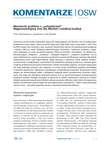 Ośrodek Studiów Wschodnich im. Marka Karpia NUMER 182 | 11.09.2015 www.osw.waw.pl Niemiecki problem z „uchodźcami” Najpoważniejszy test dla Merkel i wielkiej koalicji Artur Ciechanowicz, współpraca Lidia Gibadło Lawinowy wzrost liczby imigrantów spoza UE napływających do Niemiec stał się politycznym problemem numer jeden. Nowe szacunki dotyczące liczby osób, które mają trafić w 2015 roku do RFN i złożyć tam wniosek o azyl, są prawie dwukrotnie wyższe niż dotychczasowe prognozy i mówią o 800 tys. osób. Problemy administracyjne, finansowe i społeczne związane z napływem migrantów są coraz wyraźniej widoczne. Mimo że problem „uchodźców” (w debacie publicznej pojęcia „imigranci”, „uchodźcy”, „nielegalni imigranci”, „imigranci zarobkowi” nie są ostro zdefiniowane i często są używane wymiennie) narastał od kilkunastu miesięcy. Był jednak niedoceniany przez rząd Angeli Merkel, zajęty dyskusją o ratowaniu Grecji. Dopiero codzienne informacje o podpalanych schroniskach dla uchodźców skłoniły kanclerz do zabrania głosu i nadania problemowi priorytetu (Chefsache). Jednak ani koalicja rządowa, ani partie opozycyjne nie mają spójnego pomysłu, jak reagować na wzrost liczby uchodźców, podziały przebiegają w poprzek ugrupowań. Zgłaszane są propozycje od liberalizacji przepisów dotyczących prawa pobytu po skuteczniejszą walkę z nielegalną imigracją dzięki przyspieszeniu procedur azylowych. Nie mają one charakteru spoistych planów, lecz są raczej koncepcjami zainspirowanymi wynikami sondaży. Dlatego nierzadko są sprzeczne w swoich założeniach. Dotyczy to również działań zaproponowanych przez Merkel: szybsze usuwanie z Niemiec osób, które nie mają prawa pobytu i przekonanie innych krajów UE do przyjmowania „uchodźców”. Żaden z tych pomysłów nie jest nowy – wszystkie pojawiały się już w wewnątrzniemieckiej debacie. Niemieckie kompromisy azylowe i migracyjne Prawo do azylu w RFN gwarantuje konstytucja: „Osoby prześladowane ze względów politycznych korzystają z prawa azylu”. Przez długi czas od 1949 roku zapis ten, zawarty w art. 16 ustawy zasadniczej, nie był doprecyzowany. Debata o zmianach w prawie azylowym rozpoczęła się dopiero w połowie lat 80. Jej przyczyną była rosnąca liczba wniosków o azyl oraz wzrost imigracji zarobkowej. Zmiany w polityce wobec obcokrajowców były jedną z czterech kwestii wymagających szybkiego uregulowania wymienionych przez kanclerza Helmuta Kohla w czasie jego exposé w 1982 roku. Chodziło o ukróce- nie niekontrolowanego napływu imigrantów oraz nadużywania przez nich prawa azylowego. Kampania azylowa na dobre rozpoczęła się w 1986 roku. Za ograniczeniami opowiadali się politycy CDU/CSU, jednak w samej partii nie było jednolitego stanowiska co do wymiaru zmian. Przed zaostrzeniem przepisów przestrzegał minister pracy. Przeciwko były związki pracodawców. Ostatecznie Kohl zrezygnował ze zmian. Temat powrócił przed wyborami do Bundestagu w roku 1990. Tym razem debata nabrała intensywności, a do dyskusji włączyły się takie gazety jak Bild oraz Welt am Sonntag, które wspierały zmiany. Do przeciwników zaliczali się: SPD, Partia Zielonych, część FDP, organizacje kościelne, obrońcy praw człowieka, KOMENTARZE OSW NUMER 182 1 związki zawodowe, stowarzyszenia gospodarcze oraz przemysłowe. Ostatecznie nasilające się antyimigranckie ekscesy skłoniły SPD do zmiany stanowiska, co pozwoliło na osiągnięcie większości parlamentarnej, potrzebnej do zmiany przepisów. Decyzja pociągnęła za sobą ograniczenie przyznawania prawa do azylu w Niemczech. Najważniejsze zmiany dotyczyły: • Zasada bezpiecznych państw trzecich Osoby przyjeżdżające do Niemiec z krajów zakwalifikowanych do tej grupy nie mogą ubiegać się o azyl. Do tej grupy zaliczają się także kraje graniczące z Niemcami. Jeśli osoba zostanie zatrzymana na granicy lub w obszarze przygranicznym, może zostać natychmiast odesłana. Charakterystyka bezpiecznego państwa trzeciego została umieszczona w art. 16a ustawy zasadniczej, a konkretne państwa wymieniono w ustawie o postępowaniu w sprawie przyznawania azylu (Asylverfahrensgesetz). • Zasada bezpiecznego kraju pochodzenia Jeżeli dana osoba pochodzi z bezpiecznego kraju pochodzenia, nie może ubiegać się o azyl. Takie kraje są klasyfikowane przez ustawę wymagającą zgody Bundesratu. • Regulacje dotyczące lotnisk Wjazd z możliwością uzyskania azylu jest możliwy jedynie drogą lotniczą. Przyjazd do Niemiec po przekroczeniu terytorium państw bezpiecznych uniemożliwia ubieganie się o azyl. Jeśli osoba pochodzi lub przyjechała z kraju zakwalifikowanego jako bezpieczny, uruchomione zostaną przyspieszone procedury lotniskowe w strefie tranzytowej wraz z ograniczoną kontrolą rzeczową, tak aby osoba mogła być natychmiast odesłana. • Ustawa o świadczeniach dla osób ubiegających się o azyl Dokument zatwierdzono w 1993 roku: Asylbewerberleistungsgesetz określa formę i wysokość świadczeń dla osób ubiegających się o azyl, objętych pobytem tolerowanym oraz obcokrajowców zobowiązanych do opuszczenia kraju. • Status uchodźców wojennych Jedna ze zmian dotyczyła ustanowienia oddzielnego statusu „uchodźców wojennych“, który pozwoliłby osobom przyjeżdżającym do Niemiec z powodu wojny w swoich krajach nie przechodzić przez standardową procedurę ubiegania się o azyl. Ostatecznie takim osobom przyznaje się pobyt tolerowany. Kolejną ważną zmianą, która wpłynęła na regulacje azylowe, było przyjęcie ustawy imigracyjnej1. Weszła ona w życie 1 stycznia 2005 roku i była poprzedzona fundamentalną dyskusją. Przed 1994 rokiem konstytucja Niemiec gwarantowała nieograniczone prawo do ubiegania się o azyl. Nie dotyczyła ona konkretnie uchodźców, lecz ogólnie imigrantów. Za początek debaty na temat przyszłości Niemiec jako kraju