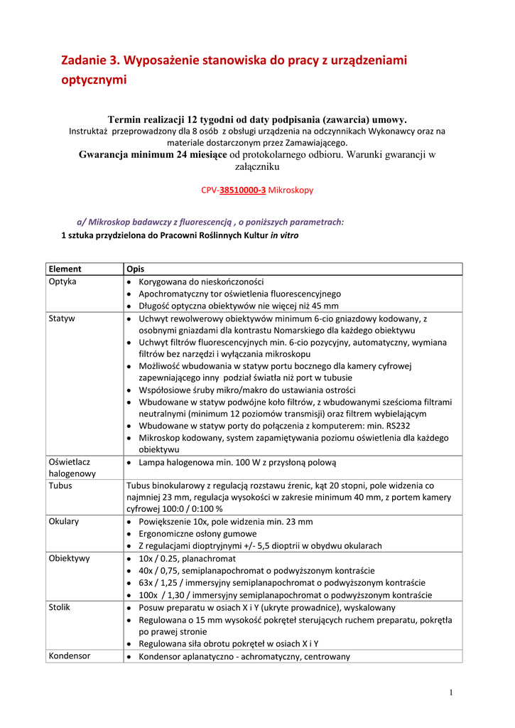 Zadanie 3. Wyposażenie stanowiska do pracy z urządzeniami optycznymi Termin realizacji 12 tygodni od daty podpisania (zawarcia) umowy. Instruktaż przeprowadzony dla 8 osób z obsługi urządzenia na odczynnikach Wykonawcy oraz na materiale dostarczonym przez Zamawiającego. Gwarancja minimum 24 miesiące od protokolarnego odbioru. Warunki gwarancji w załączniku CPV-38510000-3 Mikroskopy a/ Mikroskop badawczy z fluorescencją , o poniższych parametrach: 1 sztuka przydzielona do Pracowni Roślinnych Kultur in vitro Element Optyka Statyw Oświetlacz halogenowy Tubus Okulary Obiektywy Stolik Kondensor Opis Korygowana do nieskończoności Apochromatyczny tor oświetlenia fluorescencyjnego Długość optyczna obiektywów nie więcej niż 45 mm Uchwyt rewolwerowy obiektywów minimum 6-cio gniazdowy kodowany, z osobnymi gniazdami dla kontrastu Nomarskiego dla każdego obiektywu Uchwyt filtrów fluorescencyjnych min. 6-cio pozycyjny, automatyczny, wymiana filtrów bez narzędzi i wyłączania mikroskopu Możliwość wbudowania w statyw portu bocznego dla kamery cyfrowej zapewniającego inny podział światła niż port w tubusie Współosiowe śruby mikro/makro do ustawiania ostrości Wbudowane w statyw podwójne koło filtrów, z wbudowanymi sześcioma filtrami neutralnymi (minimum 12 poziomów transmisji) oraz filtrem wybielającym Wbudowane w statyw porty do połączenia z komputerem: min. RS232 Mikroskop kodowany, system zapamiętywania poziomu oświetlenia dla każdego obiektywu Lampa halogenowa min. 100 W z przysłoną polową Tubus binokularowy z regulacją rozstawu źrenic, kąt 20 stopni, pole widzenia co najmniej 23 mm, regulacja wysokości w zakresie minimum 40 mm, z portem kamery cyfrowej 100:0 / 0:100 % Powiększenie 10x, pole widzenia min. 23 mm Ergonomiczne osłony gumowe Z regulacjami dioptryjnymi +/- 5,5 dioptrii w obydwu okularach 10x / 0.25, planachromat 40x / 0,75, semiplanapochromat o podwyższonym kontraście 63x / 1,25 / immersyjny semiplanapochromat o podwyższonym kontraście 100x / 1,30 / immersyjny semiplanapochromat o podwyższonym kontraście Posuw preparatu w osiach X i Y (ukryte prowadnice), wyskalowany Regulowana o 15 mm wysokość pokręteł sterujących ruchem preparatu, pokrętła po prawej stronie Regulowana siła obrotu pokręteł w osiach X i Y Kondensor aplanatyczno - achromatyczny, centrowany 1 Fluorescencja Kamera cyfrowa monochromatycz na Oprogramowanie do cytogenetyki Zestaw komputerowy Oświetlacz z palnikiem ksenonowym o mocy 75 W Przysłony: polowa i filtr osłabiający (2% … 100%) Filtry fluorescencyjne dla DAPI, FITC, CY3, CY5. Filtry dla FITC i CY3 o transmisji co najmniej 95% Przetwornik: CCD 2/3” Rozdzielczość: 1360 (H) x 1024 (V) Digitalizacja co najmniej: 12 bitów / 24 MHz Dynamika: (full well capacity) min. 17 000 e Interface: USB 2.0 System chłodzenia Interface optyczny: C-mount 1. LICENCJA NA OPROGRAMOWANIE DO POBIERANIA I PRZETWARZANIA OBRAZÓW FLUORESCENCYJNYCH ZAWIERAJĄCA FUNKCJE: Pobieranie obrazu do 9-ciu kanałach barwnych ze zintegrowaną kontrolą mikroskopu dla mikroskopów automatycznych Interaktywna i automatyczna kontrola czasu integracji dla każdego kanału barwnego Wyświetlanie obrazu ‘na żywo’ na ekranie komputera Interaktywna i automatyczna korekta tła obrazu oraz ustawienia progu tła dla każdego kanału barwnego Interaktywne i automatyczne dopasowywanie nałożenia kolorów (color registration) Optymalizacja kontrastu dla całego obrazu Przejściowe i stałe powiększenie obrazu Prezentacja pojedynczych kolorów, fałszywych kolorów i poziomów szarości Opcja pobierania obrazu w wielu płaszczyznach ostrości (focus stack) Możliwość nanoszenia opisów Funkcje pomiaru intensywności i cech morfometrycznych Zarządzanie i wyszukiwanie obrazów poprzez galerię obrazów Łatwe i elastyczne projektowanie formularzy wydruków Eksport obrazów w formacie TIF, JPEG, BMP Modularne uaktualnienia Zestaw komputerowy dostosowany parametrami do obsługi oprogramowania i mikroskopu o parametrach procesora nie gorszych niż: Procesor o parametrach nie gorszych niż: - cache 3.0 MB - szybkość zegaraz 2.90 GHz - 2 rdzenie - pamięć DDR3L-1333,1600 -kompatybilny z grafiką HD 460 Wyposażenie Drukarka laserowa kolorowa do formatów min. A4 Drukarka wraz zestawem kartridżów całkowicie wypełnionych tonerem Monitor LCD o przekątnej minimum 26 cali Dysk zewnętrzny na USB, min. pojemność 2 TB Zestaw ochronny antystatyczny (pokrowiec, osłony gumowe na okulary oraz źródło światła) Żarówka halogenowa (2szt) Olejek immersyjny (5 x 10 ml) i płyn do zmywania olejku Reakcja serwisu do 48 godzin Gwarancja minimum 24 miesiące Naprawa do 2 tygodni od zgłoszenia 2
