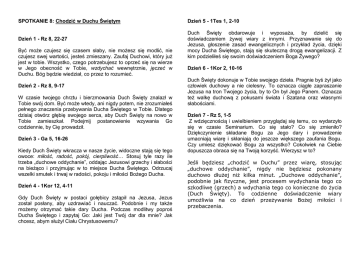SPOTKANIE 8: Chodzić w Duchu Świętym Dzień 1 - Rz 8, 22-27 Być może czujesz się czasem słaby, nie możesz się modlić, nie czujesz swej wartości, jesteś zmieszany. Zaufaj Duchowi, który już jest w tobie. Wszystko, czego potrzebujesz to oprzeć się na wierze w Jego obecność w Tobie, wzdychać wewnętrznie, jęczeć w Duchu. Bóg będzie wiedział, co przez to rozumieć. Dzień 2 - Rz 8, 9-17 W czasie twojego chrztu i bierzmowania Duch Święty znalazł w Tobie swój dom. Być może wtedy, ani nigdy potem, nie zrozumiałeś pełnego znaczenia przebywania Ducha Świętego w Tobie. Dlatego dzisiaj otwórz głębię swojego serca, aby Duch Święty na nowo w Tobie zamieszkał. Podejmij postanowienie wzywania Go codziennie, by Cię prowadził. Dzień 3 - Ga 5, 16-26 Kiedy Duch Święty wkracza w nasze życie, widoczne stają się tego owoce: miłość, radość, pokój, cierpliwość… Stosuj tyle razy ile trzeba „duchowe oddychanie”, oddając Jezusowi grzechy i słabości na bieżąco i przyjmując w to miejsce Ducha Świętego. Odrzucaj wszelki smutek i trwaj w radości, pokoju i miłości Bożego Ducha. Dzień 4 - 1Kor 12, 4-11 Gdy Duch Święty w postaci gołębicy zstąpił na Jezusa, Jezus został posłany, aby uzdrawiać i nauczać. Podobnie i my także możemy otrzymać takie dary Ducha. Podczas modlitwy poproś Ducha Świętego i zapytaj Go: Jaki jest Twój dar dla mnie? Jak chcesz, abym służył Ciału Chrystusowemu? Dzień 5 - 1Tes 1, 2-10 Duch Święty obdarowuje i wyposaża, by dzielić się doświadczeniem żywej wiary z innymi. Przyznawanie się do Jezusa, głoszenie zasad ewangelicznych i przykład życia, dzięki mocy Ducha Świętego, stają się skuteczną drogą ewangelizacji. Z kim podzieliłeś się swoim doświadczeniem Boga Żywego? Dzień 6 - 1Kor 2, 10-16 Duch Święty dokonuje w Tobie swojego dzieła. Pragnie byś żył jako człowiek duchowy a nie cielesny. To oznacza ciągłe zapraszanie Jezusa na tron Twojego życia, by to On był Jego Panem. Oznacza też walkę duchową z pokusami świata i Szatana oraz własnymi słabościami. Dzień 7 - Rz 5, 1-5 Z wdzięcznością i uwielbieniem przyglądaj się temu, co wydarzyło się w czasie Seminarium. Co się stało? Co się zmieniło? Dziękczynienie składane Bogu za Jego dary i prowadzenie umacniają wiarę i skłaniają do jeszcze większego zaufania Bogu. Czy umiesz dziękować Bogu za wszystko? Cokolwiek na Ciebie dopuszcza obraca się na Twoją korzyść. Wierzysz w to? Jeśli będziesz „chodzić w Duchu” przez wiarę, stosując „duchowe oddychanie”, nigdy nie będziesz pokonany duchowo dłużej niż kilka minut. „Duchowe oddychanie”, podobnie jak fizyczne, jest procesem wydychania tego co szkodliwe (grzech) a wdychania tego co konieczne do życia (Duch Święty). To codzienne doświadczenie wiary umożliwia na co dzień przeżywanie Bożej miłości i przebaczenia.