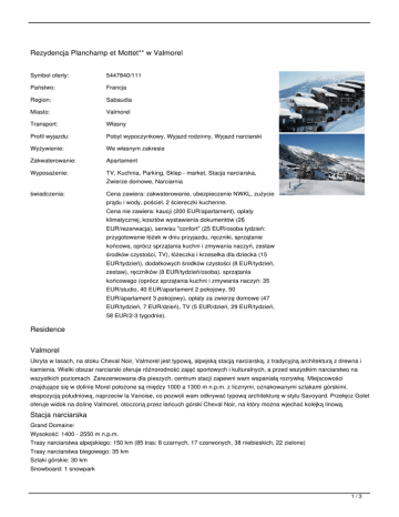 Rezydencja Planchamp et Mottet** w Valmorel Symbol oferty: 5447840/111 Państwo: Francja Region: Sabaudia Miasto: Valmorel Transport: Własny Profil wyjazdu: Pobyt wypoczynkowy, Wyjazd rodzinny, Wyjazd narciarski Wyżywienie: We własnym zakresie Zakwaterowanie: Apartament Wyposażenie: TV, Kuchnia, Parking, Sklep - market, Stacja narciarska, świadczenia: Cena zawiera: zakwaterowanie, ubezpieczenie NWKL, zużycie Zwierze domowe, Narciarnia prądu i wody, pościel, 2 ściereczki kuchenne. Cena nie zawiera: kaucji (200 EUR/apartament), opłaty klimatycznej, kosztów wystawienia dokumentów (26 EUR/rezerwacja), serwisu "confort" (25 EUR/osoba tydzień: przygotowanie łóżek w dniu przyjazdu, ręczniki, sprzątanie końcowe, oprócz sprzątania kuchni i zmywania naczyń, zestaw środków czystości, TV), łóżeczka i krzesełka dla dziecka (15 EUR/tydzień), dodatkowych środków czystości (8 EUR/tydzień, zestaw), ręczników (8 EUR/tydzień/osoba), sprzątania końcowego (oprócz sprzątania kuchni i zmywania naczyń: 35 EUR/studio, 40 EUR/apartament 2 pokojowy, 50 EUR/apartament 3 pokojowy), opłaty za zwierzę domowe (47 EUR/tydzień, 7 EUR/dzień), TV (5 EUR/dzień, 29 EUR/tydzień, 58 EUR/2-3 tygodnie). Residence Valmorel Ukryta w lasach, na stoku Cheval Noir, Valmorel jest typową, alpejską stacją narciarską, z tradycyjną architekturą z drewna i kamienia. Wielki obszar narciarski oferuje różnorodność zajęć sportowych i kulturalnych, a przed wszystkim narciarstwo na wszystkich poziomach. Zarezerwowana dla pieszych, centrum stacji zapewni wam wspaniałą rozrywkę. Miejscowości znajdujące się w dolinie Morel położone są między 1000 a 1300 m n.p.m. z licznymi, oznakowanymi szlakami górskimi, ekspozycją południową, naprzeciw la Vanoise, co pozwoli wam odkrywać typową architekturę w stylu Savoyard. Przełęcz Golet oferuje widok na dolinę Valmorel, otoczoną przez łańcuch górski Cheval Noir, na który można wjechać kolejką linową. Stacja narciarska Grand Domaine: Wysokość: 1400 - 2550 m n.p.m. Trasy narciarstwa alpejskiego: 150 km (85 tras: 8 czarnych, 17 czerwonych, 38 niebieskich, 22 zielone) Trasy narciarstwa biegowego: 35 km Szlaki górskie: 30 km Snowboard: 1 snowpark 1/3 Wyciągi narciarskie: 54 Sport i rozrywka Stacja oferuje różnorodne zajęcia sportowe i kulturalne: spadochroniarstwo, wspinaczkę po wodospadach lodowych, konny zaprzęg, spacery, skutery śnieżne, quad, zwiedzanie Iglo, kino, centrum SPA (sauny, hammam, masaże, sale fitness…). Położenie Rezydencja położona jest w typowej miejscowości alpejskiej o łagodnym klimacie, zbudowanej w stylu Savoyard. Znajduje się zaledwie 100 m od wyciągów narciarskich. Zakwaterowanie: sobota od godz. 17:00 Wykwaterowanie: sobota do godz. 10:00 Zakwaterowanie Apartament 2 pokojowy 5-osobowy: ok. 30 m2, salon z 3 łóżkami 1-osobowymi, sypialnia z 2 łóżkami 1-osobowymi, aneks kuchenny (piec, lodówka, zmywarka), balkon (oprócz apartamentów na parterze: wyjście bezpośrednio na zewnątrz), łazienka lub prysznic z WC (niektóre apartamenty: salon z 2 łóżkami 1-osobowymi, sypialnia z piętrowym i 1-osobowym łóżkiem). Apartament 2 pokojowy 6-osobowy: ok. 35 m2, salon z 2 łóżkami 1-osobowymi, aneks sypialniany z 2 łóżkami 1-osobowymi, sypialnia z 2 łóżkami 1-osobowymi, aneks kuchenny (piec, lodówka, zmywarka), balkon (oprócz apartamentów na parterze: wyjście bezpośrednio na zewnątrz), łazienka lub prysznic z WC, dodatkowa łazienka lub prysznic (w niektórych apartamentach). Apartament 3 pokojowy 8-osobowy: ok. 48 m2, salon z 4 łóżkami 1-osobowymi, 2 sypialnie z 2 łóżkami 1-osobowymi lub piętrowym łóżkiem, aneks kuchenny (piec, lodówka, zmywarka), balkon (oprócz apartamentów na parterze: wyjście bezpośrednio na zewnątrz), łazienka lub prysznic z WC, dodatkowy prysznic z WC, (niektóre apartamenty: salon z 2 łóżkami 1-osobowymi, 2 sypialnie z 3 łóżkami 1-osobowymi każda). Studio 2-osobowe: ok. 18 m2, salon z 2 łóżkami 1-osobowymi, aneks kuchenny (piec, lodówka), balkon (oprócz apartamentów na parterze: wyjście bezpośrednio na zewnątrz), łazienka lub prysznic z WC. Studio 2-3-osobowe: ok. 20 m2, salon z 2 łóżkami 1-osobowymi i 2-osobowym, rozkładanym łóżkiem lub piętrowym i 1-osobowym łóżkiem, aneks kuchenny (piec, lodówka), balkon (oprócz apartamentów na parterze: wyjście bezpośrednio na zewnątrz), łazienka lub prysznic z WC. Studio 4-osobowe: ok. 28 m2, salon z 2 łóżkami 1-osobowymi, aneks sypialniany z 2 łóżkami 1-osobowymi, aneks kuchenny (piec, lodówka, zmywarka), balkon (oprócz apartamentów na parterze: wyjście bezpośrednio na zewnątrz), łazienka lub prysznic z WC (niektóre apartamenty typu studio: salon z 4 łóżkami 1-osobowymi. Club dla dzieci Stacja oferuje: club dla dzieci od 18 miesiąca do 5 lat, żłobek od 18 do 35 miesiąca, club dla dzieci od 3 do 5 lat. Balneoterapia Centrum SPA Valmoforme, położone 600 m od rezydencji, zapewnia 100% przyjemności i wypoczynku w tradycyjnym stylu Savoyard. Proponuje zabiegi kosmetyczne dla osób powyżej 15 lat: hydromasaż, saunę, hammam, zabiegi odchudzające, masaż z olejkami eterycznymi, masaż kalifornijski, tajski, szwedzki. Oferta specjalna 7 = 8 Dla terminu od 20/12/08 do 27/12/08 istnieje możliwość przyjazdu 19/12/08 oraz dla terminu od 11/04/09 do 18/04/09 istnieje możliwość wyjazdu 19/04/09 bez ponoszenia dodatkowych kosztów. TERMINY: od: 2017-03-04 do: 2017-03-11 (8 dni), miejsca: zamów cena od: 736 PLN = 170 EUR od: 2017-03-11 do: 2017-03-18 (8 dni), miejsca: zamów cena od: 660 PLN = 152 EUR od: 2017-03-18 do: 2017-03-25 (8 dni), miejsca: zamów cena od: 660 PLN = 152 EUR od: 2017-03-25 do: 2017-04-01 (8 dni), miejsca: zamów cena od: 660 PLN = 152 EUR od: 2017-04-01 do: 2017-04-08 (8 dni), miejsca: zamów cena od: 519 PLN = 120 EUR CENNIK: 2/3 Długość pobytu: 8 dni 8 dni 8 dni Grupa cenowa: D C E 430 460 865 940 640 6