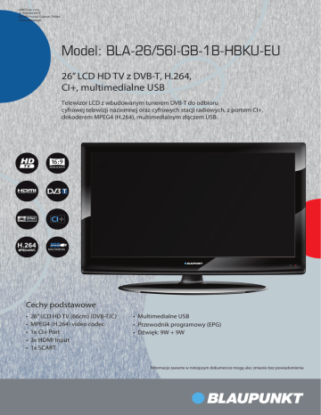 UNICO sp. z o.o. ul. Kossaka 6A/9 83-000 Pruszcz Gdanski, Polska www.maxton.pl Model: BLA-26/56I-GB-1B-HBKU-EU 26’’ LCD HD TV z DVB-T, H.264, CI+, multimedialne USB Telewizor LCD z wbudowanym tunerem DVB-T do odbioru cyfrowej telewizji naziemnej oraz cyfrowych stacji radiowych, z portem CI+, dekoderem MPEG4 (H.264), multimedialnym złączem USB. 16:9 WIDESCREEN MULTIMEDIA Cechy podstawowe • 26” LCD HD TV (66cm) (DVB-T/C) • MPEG4 (H.264) video codec • 1x CI+ Port • 3x HDMI Input • 1x SCART • Multimedialne USB • Przewodnik programowy (EPG) • Dźwięk: 9W + 9W Informacje zawarte w niniejszym dokumencie mogą ulec zmianie bez powiadomienia UNICO sp. z o.o. ul. Kossaka 6A/9 83-000 Pruszcz Gdanski, Polska www.maxton.pl Model: BLA-26/56I-GB-1B-HBKU-EU 26’’ LCD HD TV ; DVB-T/C, H.264, CI+, multimedialne USB Wyświetlacz Funcje DVB Rozdzielczość 1366 x 768 Kontrast1000:1 Kontrast dynamiczny 100 000:1 Proporcje16:9 Jasność 450 cd/m2 Odświeżanie 8 ms Ilość wyświetlanych kolorów 16.7 M Kąty obserwacji (V / H) 178/178 Edycja programówtak Ulubiony kanał tak Opcjonalny interfejstak Skanowanie kanałów Auto / Manual Tekst cyfrowytak Napisy tak Ilość kanałów400 Funcje analogowe Wejścia i wyjścia System Video PAL/SECAM/NTSC (Playback) Skanowanie kanałówAuto/Manual Teletext 1000 stron Nicam/A2tak Ulubiony kanałtak Educja programówtak Ilość kanałów100 CI + 1 SCART1 RF In1 Wwejście komponentowe (V/L/R)1 Wwejście kompozytowe (YPbPr)1 HDMI IN3 Złącze PC1 Audio PC1 Coaxialne1 USB1 Wyjście słuchawkowe1 Funcje TV Tuner cyfrowy Typ DVB-T (MPEG4) | Analogowy hybrydowy Częstotliwość 74.25 to 230.25 Hz (VHF ) 474.25 MHz to 862.25 MHz (UHF) Pasmo kanałów 7 MHz / 8 MHz Impedancja75Ω Modulacja COFDM 2K/8K, QPSK, 16QAM, 32QAM, 64QAM, 128QAM, 256QAM System Video MPEG-2: MP@ML, MPEG-4 AVC/H.264 System Audio MPEG-1 Layer 1,2; MPEG-2 Layer 2; MPEG-4 AAC/HE(ACC+)/Dolby AC3/AC3+ Tuner analogowy System PAL B/G, D/K, I; SECAM B/G, D/K, L/L’ RF-Signal VHF/UHF Impedancja75ohm Zakres odbioru 49 MHz-864 MHz Funcje USB System zasilania Zasilanie AC 110V~240V Zużycie energii 63/120W (ecohome/max) w czuwaniu <0,5W Klasa energetycznaD Inne Montaż naściennytak VESA Standard200x100 Pilot zdalnego sterowania z bateriami tak Logistyka USB Port Type2.0 Aktualizacja oprogramowaniatak Multimedialne USBtak System dźwięku Wzmacniacz Zakres częstotliwości Proporcje AUTO, 4:3, 16:9, Zoom, Stretch De-interlacing3D Digital Noise Reductiontak Comb Filter3D Format obrazu480i/480p/576i/576p/720i 720p/1080i/1080p Kontrola rodzicielskatak System hotelowytak OSDWielojęzyczne EN, DE, ESP, FR, IT, PT, CZ, HU, PL, SK lub opcjonalnie 9W + 9W 100 Hz - 15000 Hz Wymiary z podstawą 653x200x472mm Wymiary bez podstawy 653x102x453mm Waga netto 7,4kg Waga brutto 8,9kg Informacje zawarte w niniejszym dokumencie mogą ulec zmianie bez powiadomienia A +++ A ++ Series: 26/28G(J,I,N); 26/54G(J,I,N); 26/56G(J,I,N); 26/57G(J,I,N); + Blaupunkt 26/74G(J,I,N) A A B A+ A B C D E F G CA B DC D E F E F 63 66 G 92 26 2010/1062 - 2011 ENB/LAB/0098
