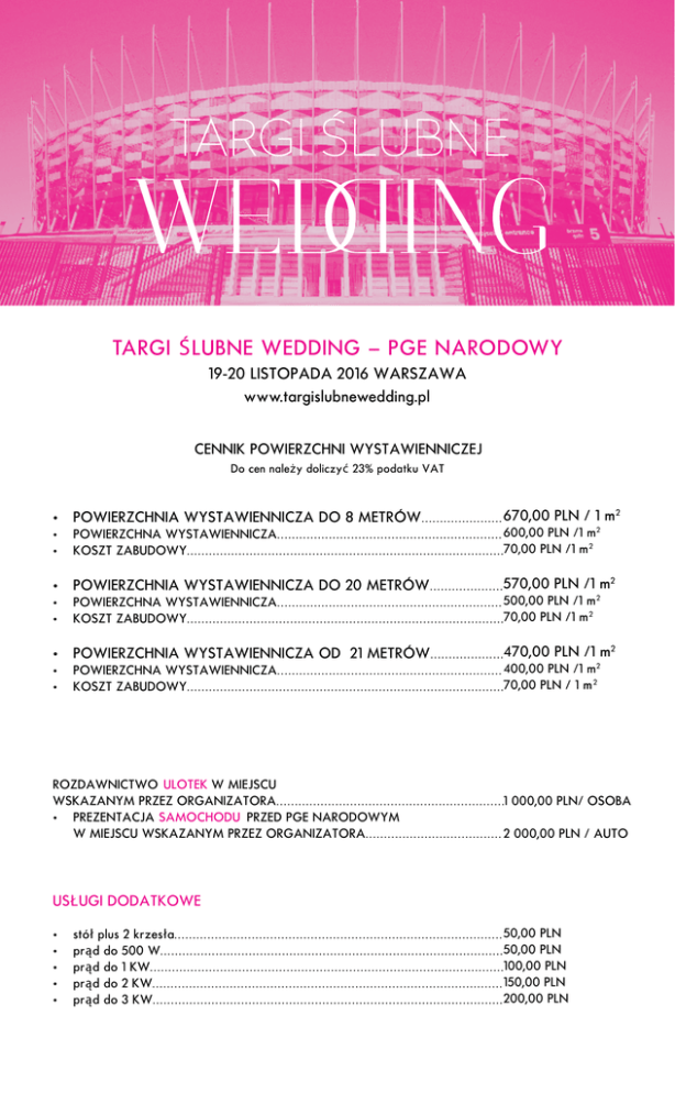 TARGI ŚLUBNE WEDDI NG – PGE NARODOW Y 19-20 LISTOPADA 2016 WARSZAWA www.targislubnewedding.pl CENNIK POWIERZCHNI WYSTAWIENNICZEJ Do cen należy doliczyć 23% podatku VAT font: Big Caslon Medium + Kings Caslon Typo Italic C: 0 M:100 Y: 0 B: 0 • PANTONE DS Process Magenta C POWIERZCHNIA WYSTAWIENNICZA DO 8 METRÓW . . . . . . . . . . . . . . . . . . . . . . 670,00 PLN / 1 m 2 • • POWIERZCHNA WYSTAWIENNICZA . . . . . . . . . . . . . . . . . . . . . . . . . . . . . . . . . . . . . . . . . . . . . . . . . . . . . . . . . . . . . 600,00 PLN /1 m 2 KOSZT ZABUDOWY . . . . . . . . . . . . . . . . . . . . . . . . . . . . . . . . . . . . . . . . . . . . . . . . . . . . . . . . . . . . . . . . . . . . . . . . . . . . . . . . . . . . . . 70,00 PLN /1 m 2 • POWIERZCHNIA WYSTAWIENNICZA DO 20 METRÓW . . . . . . . . . . . . . . . . . . . . 570,00 PLN /1 m 2 • • POWIERZCHNA WYSTAWIENNICZA . . . . . . . . . . . . . . . . . . . . . . . . . . . . . . . . . . . . . . . . . . . . . . . . . . . . . . . . . . . . . 500,00 PLN /1 m 2 KOSZT ZABUDOWY . . . . . . . . . . . . . . . . . . . . . . . . . . . . . . . . . . . . . . . . . . . . . . . . . . . . . . . . . . . . . . . . . . . . . . . . . . . . . . . . . . . . . . 70,00 PLN /1 m 2 • POWIERZCHNIA WYSTAWIENNICZA OD 21 METRÓW . . . . . . . . . . . . . . . . . . . . 470,00 PLN /1 m 2 • • POWIERZCHNA WYSTAWIENNICZA . . . . . . . . . . . . . . . . . . . . . . . . . . . . . . . . . . . . . . . . . . . . . . . . . . . . . . . . . . . . . 400,00 PLN /1 m 2 KOSZT ZABUDOWY . . . . . . . . . . . . . . . . . . . . . . . . . . . . . . . . . . . . . . . . . . . . . . . . . . . . . . . . . . . . . . . . . . . . . . . . . . . . . . . . . . . . . . 70,00 PLN / 1 m 2 ROZDAWNICTWO ULOTEK W MIEJSCU WSKAZANYM PRZEZ ORGANIZATORA . . . . . . . . . . . . . . . . . . . . . . . . . . . . . . . . . . . . . . . . . . . . . . . . . . . . . . . . . . . . . .1 000,00 PLN/ OSOBA • PREZENTACJA SAMOCHODU PRZED PGE NARODOWYM W MIEJSCU WSKAZANYM PRZEZ ORGANIZATORA . . . . . . . . . . . . . . . . . . . . . . . . . . . . . . . . . . . . . 2 000,00 PLN / AUTO USŁUGI DODATKOWE • • • • • stół plus 2 krzesła . . . . . . . . . . . . . . . . . . . . . . . . . . . . . . . . . . . . . . . . . . . . . . . . . . . . . . . . . . . . . . . . . . . . . . . . . . . . . . . . . . . . . . . . . 50,00 PLN prąd do 500 W . . . . . . . . . . . . . . . . . . . . . . . . . . . . . . . . . . . . . . . . . . . . . . . . . . . . . . . . . . . . . . . . . . . . . . . . . . . . . . . . . . . . . . . . . . . . . 50,00 PLN prąd do 1 KW . . . . . . . . . . . . . . . . . . . . . . . . . . . . . . . . . . . . . . . . . . . . . . . . . . . . . . . . . . . . . . . . . . . . . . . . . . . . . . . . . . . . . . . . . . . . . . . . 100,00 PLN prąd do 2 KW . . . . . . . . . . . . . . . . . . . . . . . . . . . . . . . . . . . . . . . . . . . . . . . . . . . . . . . . . . . . . . . . . . . . . . . . . . . . . . . . . . . . . . . . . . . . . . . 150,00 PLN prąd do 3 KW . . . . . . . . . . . . . . . . . . . . . . . . . . . . . . . . . . . . . . . . . . . . . . . . . . . . . . . . . . . . . . . . . . . . . . . . . . . . . . . . . . . . . . . . . . . . . . . 200,00 PLN