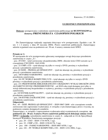 Katowice, 27.10.2009 r. UCZESTNICY POSTĘPOWANIA Dotyczy: postępowania o udzielenie zamówienia publicznego nr RU/DWM/62/09 na dostawę: PRENUMERATA CZASOPISM POLSKICH Do Zamawiającego wpłynęły zapytania dotyczące w/w postępowania. Zgodnie z art. 38 ust. 1 i 2 ustawy z dnia 29 stycznia 2004r. Prawo zamówień publicznych, Zamawiający udziela wyjaśnień oraz na podstawie art. 38 ust. 4 ustawy zmienia treść SIWZ. Pytanie nr 1: W nawiązaniu do w/w postępowania zgłaszamy następujące uwagi dotyczące przedmiotu zamówienia w części „A”: - poz. 29 CEO – tytuł zawieszony od października 2009r. obecnie treści CEO zawarte są w czasopiśmie CXO ISSN: 1642-8188, - poz. 32 CHIP z CD – tytuł ukazuje się tylko w wersji z DVD, prosimy o wykreślenie pozycji z przedmiotu zamówienia, - poz. 65 DZIŚ – PRZEGLĄD SPOŁECZNY - tytuł nie ukazuje się, prosimy o wykreślenie pozycji z przedmiotu zamówienia, - poz. 180 PARKI NARODOWE – tytuł nie ukazuje się, prosimy o wykreślenie pozycji z przedmiotu zamówienia, - poz. 181 PC WORLD KOMPUTER Z CD – tytuł ukazuje się tylko w wersji z DVD prosimy o wykreślenie pozycji z przedmiotu zamówienia, - poz. 231 PRZEWODNIK BIBLIOGRAFICZNY URZĘDOWY WYKAZ DRUKÓW ZIND. ALFABETYCZNYM I PRZEDMIOTOWYM - od 2010 roku tytuł dostępny jest tylko w wersji elektronicznej bezpośrednio u wydawcy, prosimy o wykreślenie pozycji z przedmiotu zamówienia, - po. 245 RYNEK KAPITAŁOWY – tytuł nie ukazuje się, prosimy o wykreślenie pozycji z przedmiotu zamówienia, - poz. 246 RYNKI ZAGRANICZNE – tytuł nie ukazuje się, prosimy o wykreślenie pozycji z przedmiotu zamówienia. Odpowiedź: Poz. 65 – DZIŚ. PRZEGLĄD SPOŁECZNY – ISSN 0867-3608 - n/w czasopismo zostało zawieszone (nie zaprzestano wydawania), w związku z tym Zamawiający prosi o wycenę, na podstawie ostatnio dostępnych cenników. Zamawiający, w związku z zaprzestaniem wydawania niżej wymienionych czasopism, na podstawie art. 38 ust. 4 ustawy Prawo zamówień publicznych dokonuje zmiany treści SIWZ i wykreśla z przedmiotu zamówienia w części A - załącznik nr 2A do Specyfikacji Istotnych Warunków Zamówienia następujące pozycje: • poz. 29 – CEO – ISSN 1734-9478, 1 egz. • poz. 32 - CHIP z CD – ISSN 1230-817X, 3 egz. • poz. 180 – PARKI NARODOWE – ISSN 0867-6550, 1 egz. • poz. 181 – PC WORLD KOMPUTER z CD – ISSN 1232-3004, 2 egz., 1z3 • • • poz. 231 – PRZEWODNIK BIBLIOGRAFICZNY. URZĘDOWY WYKAZ DRUKÓW Z IND. ALFAB. I PRZED. – ISSN 0033-2518, 1 egz. poz. 245 – RYNEK KAPITAŁOWY – ISSN 1508-9711, 1 egz., poz. 246 – RYNKI ZAGRANICZNE – ISSN 0036-052X, 1 egz. Pytanie nr 2: Prosimy o wyjaśnienie odnośnie następujących pozycji: - poz. 32 mies. Komp. CHIP CD tytuł ten ukazuje się tylko w wersji DVD, - poz. 64 Dziennik Gazeta Prawna + EGP. W związku z różnymi stawkami VAT prosimy o umieszczenie ww pakietu w dwóch pozycjach, - poz. 116 Kwartalnik Historii Żydów. Błędnie podany ISNN 006-4033 – prawidłowy to 1899-3044, - poz. 165 Orzecznictwo Sądu Najwyższego – Izba Pracy, Ubezpieczeń Społecznych i Spraw Publicznych. Błędnie podany ISNN 1772-2367 – prawidłowy to 1232-390x, - poz, 181 PC Word Komputer CD. Tytuł ten ukazuje się tylko w wersji DVD, - poz. 231 Przewodnik Bibliograficzny – Urzędowy wykaz druków z indeksami alfabetycznym i przedmiotowym. Informujemy, iż Wydawca od 2010 r. zawiesił wydawanie wersji papierowej. Tytuł będzie dostępny tylko w wersji internetowej do kupienia bezpośrednio u wydawcy, bez udziału pośredników. W związku z tym prosimy o wykreślenie ww tytułu z przedmiotu zamówienia, - poz. 246 Rynki Zagraniczne Wydawca zawiesił wydawanie tygodnika od 30.06.2009r. Odpowiedź: - Poz. 32, - patrz odpowiedź na pytanie nr 1 - Poz. 64 - Zamawiający dla poz. 64: DZIENNIK GAZETA PRAWNA + EGP proponuje rozbicie przez Wykonawców w/w czasopisma na dwie pozycje (jako 64a i 64b), zgodnie ze stawką VAT. - Poz. 116 i poz. 165 –część A - załącznik nr 2A do Specyfikacji Istotnych Warunków Zamówienia Zamawiający podaje prawidłowe ISSN-y: • poz. 116 – KWARTALNIK HISTORII ŻYDÓW – ISSN 1899-3044, • poz. 165 – ORZECZNICTWO SĄDU NAJWYŻSZEGO – IZBA PRACY, UBEZPIECZEŃ SPOŁECZNYCH… - ISSN 1732-2367 - Poz. 181, poz. 231 oraz poz. 246 – patrz odpowiedź na pytania nr 1. Pytanie nr 3: W nawiązaniu do w/w postępowania informuję, że tytuł Dziennik Urzędowy Komisji Nadzoru Finansowego (poz.49 załącznika nr 2A) ukazuje się wyłącznie w wersji elektronicznej dostępnej na stronie Komisji Nadzoru Finansowego. Prosimy zatem o wykreślenie tej pozycji z przedmiotu zamówienia. Odpowiedź: Zamawiający otrzymał od Komisji Nadzoru Finansowego (wydawcą n/w periodyku) informację, iż: • poz. 49 – DZIENNIK URZĘDOWY KOMISJI NADZORU FINANSOWEGO: do dnia dzisiejszego nie została podjęta decyzja czy w/w periodyk nie będzie się ukazywał w 2010r. w wersji drukowanej. W zaistniałej sytuacji Zamawiający prosi o wycenę na podstawie ostatnio dostępnych cenników. 2z3 W związku z powyższym na podstawie art. 12a ust.1 oraz art. 38 ust. 6 ustawy z dnia 29 stycznia 2004 r. Prawo zamówień publicznych. Zamawiający przedłuża termin składania ofert. Termin składania ofert: 05.11.2009 r. do godziny 09:30. Termin otwarcia ofert: 05.11.2009 r. godzina 11:00. W związku z powyższym, Wykonawcy związani będą złożoną ofertą przez okres 30 dni od daty zakończenia terminu składania ofert, tj. do dnia 04.12.2009r. włącznie. Uwaga!: WYJAŚNIENIAORAZ ZMIANY WPROWADZONE NINIEJSZYM PISMEM SĄ DLA WYKONAWCÓW WIĄŻĄCE. Sporządził: Specjalista: Przewodniczący Komisji Przetargowej: Krystyna Solak mgr Monika Klein 3z3