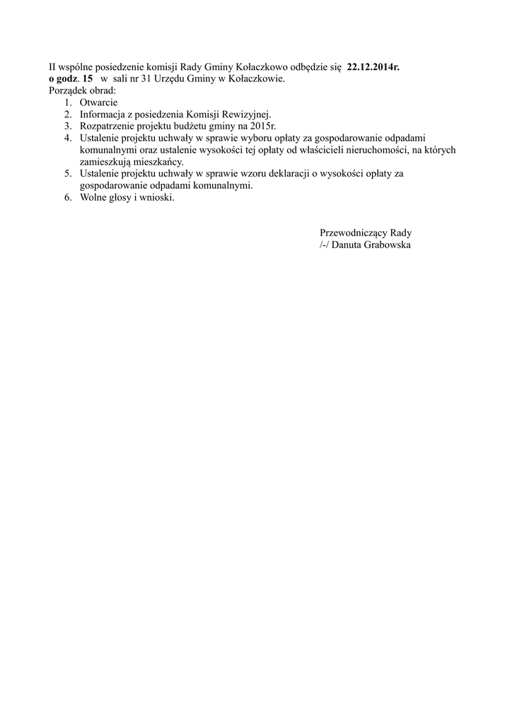 II wspólne posiedzenie komisji Rady Gminy Kołaczkowo odbędzie się 22.12.2014r. o godz. 15 w sali nr 31 Urzędu Gminy w Kołaczkowie. Porządek obrad: 1. Otwarcie 2. Informacja z posiedzenia Komisji Rewizyjnej. 3. Rozpatrzenie projektu budżetu gminy na 2015r. 4. Ustalenie projektu uchwały w sprawie wyboru opłaty za gospodarowanie odpadami komunalnymi oraz ustalenie wysokości tej opłaty od właścicieli nieruchomości, na których zamieszkują mieszkańcy. 5. Ustalenie projektu uchwały w sprawie wzoru deklaracji o wysokości opłaty za gospodarowanie odpadami komunalnymi. 6. Wolne głosy i wnioski. Przewodniczący Rady /-/ Danuta Grabowska