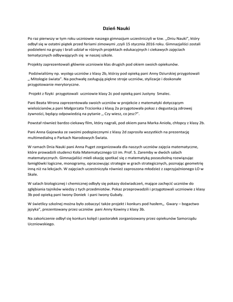 Dzień Nauki Po raz pierwszy w tym roku uczniowie naszego gimnazjum uczestniczyli w tzw. ,,Dniu Nauki”, który odbył się w ostatni piątek przed feriami zimowymi ,czyli 15 stycznia 2016 roku. Gimnazjaliści zostali podzieleni na grupy i brali udział w różnych projektach edukacyjnych i ciekawych zajęciach tematycznych odbywających się w naszej szkole. Projekty zaprezentowali głównie uczniowie klas drugich pod okiem swoich opiekunów. Podziwialiśmy np. występ uczniów z klasy 2b, którzy pod opieką pani Anny Dziurskiej przygotowali ,, Mitologie świata”. Na pochwałę zasługują piękne stroje uczniów, stylizacje i doskonałe przygotowanie merytoryczne. Projekt z fizyki przygotowali uczniowie klasy 2c pod opieką pani Justyny Smalec. Pani Beata Wrona zaprezentowała swoich uczniów w projekcie z matematyki dotyczącym wielościanów,a pani Małgorzata Trzcionka z klasą 2a przygotowała pokaz z degustacją zdrowej żywności, będący odpowiedzią na pytanie ,, Czy wiesz, co jesz?”. Powstał również bardzo ciekawy film, który nagrali, pod okiem pana Marka Anioła, chłopcy z klasy 2b. Pani Anna Gajewska ze swoimi podopiecznymi z klasy 2d zaprosiła wszystkich na prezentację multimedialną o Parkach Narodowych Świata. W ramach Dnia Nauki pani Anna Puget zorganizowała dla naszych uczniów zajęcia matematyczne, które prowadzili studenci Koła Matematycznego UJ im. Prof. S. Zaremby w dwóch salach matematycznych. Gimnazjaliści mieli okazję spotkać się z matematyką pozaszkolną rozwiązując łamigłówki logiczne, monogramy, opracowując strategie w grach strategicznych, poznając geometrię inną niż na lekcjach. W zajęciach uczestniczyła również zaproszona młodzież z zaprzyjaźnionego LO w Skale. W salach biologicznej i chemicznej odbyły się pokazy doświadczeń, mające zachęcić uczniów do zgłębiania tajników wiedzy z tych przedmiotów. Pokaz przeprowadzili i przygotowali uczniowie z klasy 3b pod opieką pani Iwony Doniek i pani Iwony Gubały. W świetlicy szkolnej można było zobaczyć także projekt i konkurs pod hasłem,, Gwary – bogactwo języka”, prezentowany przez uczniów pani Anny Kowiny z klasy 3b. Na zakończenie odbył się konkurs kolęd i pastorałek zorganizowany przez opiekunów Samorządu Uczniowskiego.