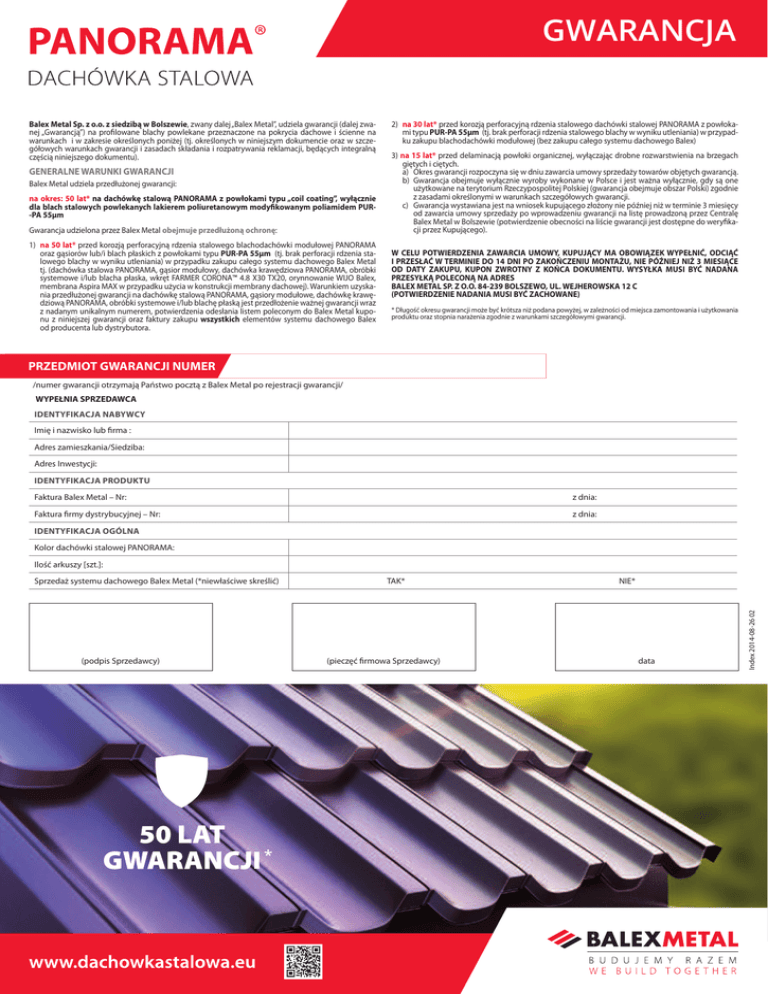 GWARANCJA Balex Metal Sp. z o.o. z siedzibą w Bolszewie, zwany dalej „Balex Metal”, udziela gwarancji (dalej zwanej „Gwarancją”) na profilowane blachy powlekane przeznaczone na pokrycia dachowe i ścienne na warunkach i w zakresie określonych poniżej (tj. określonych w niniejszym dokumencie oraz w szczegółowych warunkach gwarancji i zasadach składania i rozpatrywania reklamacji, będących integralną częścią niniejszego dokumentu). GENERALNE WARUNKI GWARANCJI Balex Metal udziela przedłużonej gwarancji: na okres: 50 lat* na dachówkę stalową PANORAMA z powłokami typu „coil coating”, wyłącznie dla blach stalowych powlekanych lakierem poliuretanowym modyfikowanym poliamidem PUR-PA 55µm Gwarancja udzielona przez Balex Metal obejmuje przedłużoną ochronę: 1) na 50 lat* przed korozją perforacyjną rdzenia stalowego blachodachówki modułowej PANORAMA oraz gąsiorów lub/i blach płaskich z powłokami typu PUR-PA 55µm (tj. brak perforacji rdzenia stalowego blachy w wyniku utleniania) w przypadku zakupu całego systemu dachowego Balex Metal tj. (dachówka stalowa PANORAMA, gąsior modułowy, dachówka krawędziowa PANORAMA, obróbki systemowe i/lub blacha płaska, wkręt FARMER CORONA™ 4.8 X30 TX20, orynnowanie WIJO Balex, membrana Aspira MAX w przypadku użycia w konstrukcji membrany dachowej). Warunkiem uzyskania przedłużonej gwarancji na dachówkę stalową PANORAMA, gąsiory modułowe, dachówkę krawędziową PANORAMA, obróbki systemowe i/lub blachę płaską jest przedłożenie ważnej gwarancji wraz z nadanym unikalnym numerem, potwierdzenia odesłania listem poleconym do Balex Metal kuponu z niniejszej gwarancji oraz faktury zakupu wszystkich elementów systemu dachowego Balex od producenta lub dystrybutora. 2) na 30 lat* przed korozją perforacyjną rdzenia stalowego dachówki stalowej PANORAMA z powłokami typu PUR-PA 55µm (tj. brak perforacji rdzenia stalowego blachy w wyniku utleniania) w przypadku zakupu blachodachówki modułowej (bez zakupu całego systemu dachowego Balex) 3) na 15 lat* przed delaminacją powłoki organicznej, wyłączając drobne rozwarstwienia na brzegach giętych i ciętych. a) Okres gwarancji rozpoczyna się w dniu zawarcia umowy sprzedaży towarów objętych gwarancją. b) Gwarancja obejmuje wyłącznie wyroby wykonane w Polsce i jest ważna wyłącznie, gdy są one użytkowane na terytorium Rzeczypospolitej Polskiej (gwarancja obejmuje obszar Polski) zgodnie z zasadami określonymi w warunkach szczegółowych gwarancji. c) Gwarancja wystawiana jest na wniosek kupującego złożony nie później niż w terminie 3 miesięcy od zawarcia umowy sprzedaży po wprowadzeniu gwarancji na listę prowadzoną przez Centralę Balex Metal w Bolszewie (potwierdzenie obecności na liście gwarancji jest dostępne do weryfikacji przez Kupującego). W CELU POTWIERDZENIA ZAWARCIA UMOWY, KUPUJĄCY MA OBOWIĄZEK WYPEŁNIĆ, ODCIĄĆ I PRZESŁAĆ W TERMINIE DO 14 DNI PO ZAKOŃCZENIU MONTAŻU, NIE PÓŹNIEJ NIŻ 3 MIESIĄCE OD DATY ZAKUPU, KUPON ZWROTNY Z KOŃCA DOKUMENTU. WYSYŁKA MUSI BYĆ NADANA PRZESYŁKĄ POLECONĄ NA ADRES BALEX METAL SP. Z O.O. 84-239 BOLSZEWO, UL. WEJHEROWSKA 12 C (POTWIERDZENIE NADANIA MUSI BYĆ ZACHOWANE) * Długość okresu gwarancji może być krótsza niż podana powyżej, w zależności od miejsca zamontowania i użytkowania produktu oraz stopnia narażenia zgodnie z warunkami szczegółowymi gwarancji. PRZEDMIOT GWARANCJI NUMER /numer gwarancji otrzymają Państwo pocztą z Balex Metal po rejestracji gwarancji/ WYPEŁNIA SPRZEDAWCA IDENTYFIKACJA NABYWCY Imię i nazwisko lub firma : Adres zamieszkania/Siedziba: Adres Inwestycji: IDENTYFIKACJA PRODUKTU Faktura Balex Metal – Nr: z dnia: Faktura firmy dystrybucyjnej – Nr: z dnia: IDENTYFIKACJA OGÓLNA Kolor dachówki stalowej PANORAMA: Ilość arkuszy [szt.]: (podpis Sprzedawcy) TAK*NIE* (pieczęć firmowa Sprzedawcy) * data Index 2014-08-26 02 Sprzedaż systemu dachowego Balex Metal (*niewłaściwe skreślić) WARUNKI SZCZEGÓŁOWE 1.Gwarancja dotyczy wyłącznie blach powlekanych określonych w Generalnych warunkach gwarancji nabytych przez klienta (zwanego dalej również „kupującym”), stosowanych na zewnątrz w środowisku typowym dla klimatu umiarkowanego z kategorią korozyjności do C5 ( wg PN-EN ISO 12944-2:2001 Farby i lakiery). Ochrona przed korozją konstrukcji stalowych za pomocą ochronnych systemów malarskich. Część 2: Klasyfikacja środowisk oraz blach stosowanych do wewnątrz z kategorią korozyjności C1 do C5 (A1 do A5) 2. Okres długości ochrony gwarancyjnej uzależniony jest od miejsca zamontowania i użytkowania produktu, a co za tym idzie od stopnia narażenia tego produktu na środowisko korozyjne, zgodnie z zasadami wyszczególnionymi poniżej: a) Balex Metal określa ilość lat przedłużonej gwarancji na korozję perforacyjną rdzenia z punktu 1 Generalnych warunków gwarancji dla następujących rodzajów środowisk: C2 – 50 lat, C3 – 40 lat, C4 – 30 lat, C5 – 10 lat b) Balex Metal określa ilość lat gwarancji na korozję perforacyjną rdzenia z punktu 2 Generalnych warunków gwarancji dla następujących rodzajów środowisk: C2 – 30 lat, C3 – 20 lat, C4 – 15 lat, C5 – 5 latBalex Metal określa ilość lat gwarancji na delaminację powłoki organicznej z punktu 3 Generalnych warunków gwarancji dla następujących rodzajów środowisk: C2 – 15 lat, C3 – 10 lat, C4 – 5 lat, C5 – 3 lata c) Obszar miejski o intensywnym zanieczyszczeniu (C5) nie podlega gwarancji. Klasyfikacja środowiska korozyjności jest oparta o założenia, że nie występują narażenia szczególne, które mogłyby powodować znaczące zwiększenie korozji, w szczególności takie jak: a) narażenia chemiczne – pochodzące z funkcjonowania instalacji – kwasy, alkalia lub sole, rozpuszczalniki organiczne, agresywne gazy i cząstki kurzu, b) narażenia mechaniczne – ścieranie ( erozja) przez porwane przez wiatr cząstki