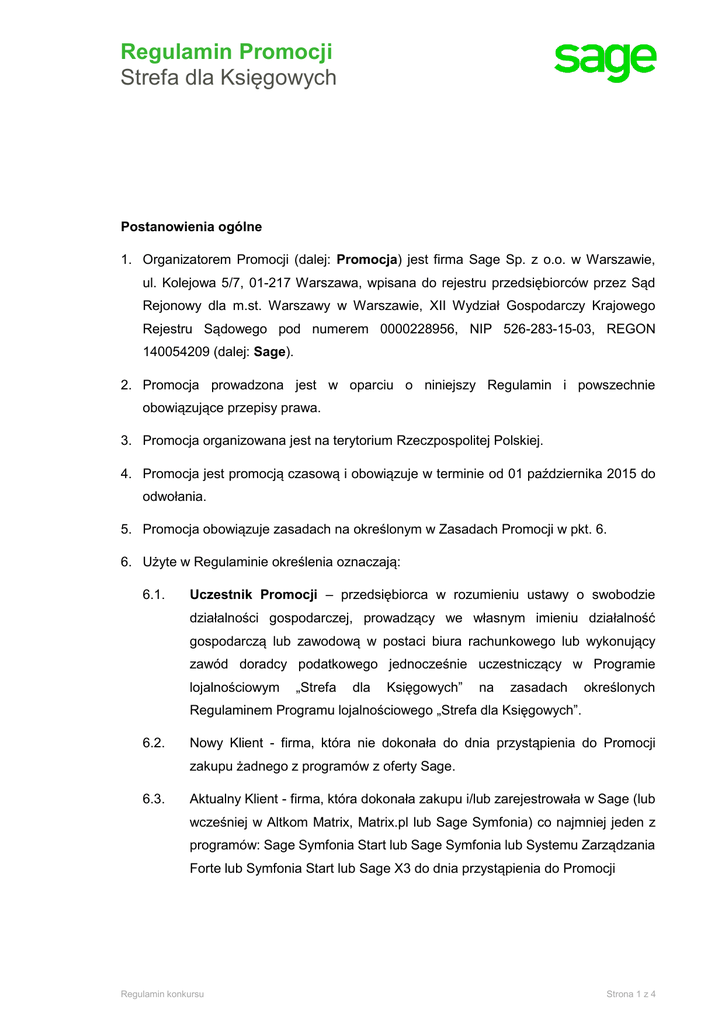 Regulamin Promocji Strefa dla Księgowych Postanowienia ogólne 1. Organizatorem Promocji (dalej: Promocja) jest firma Sage Sp. z o.o. w Warszawie, ul. Kolejowa 5/7, 01-217 Warszawa, wpisana do rejestru przedsiębiorców przez Sąd Rejonowy dla m.st. Warszawy w Warszawie, XII Wydział Gospodarczy Krajowego Rejestru Sądowego pod numerem 0000228956, NIP 526-283-15-03, REGON 140054209 (dalej: Sage). 2. Promocja prowadzona jest w oparciu o niniejszy Regulamin i powszechnie obowiązujące przepisy prawa. 3. Promocja organizowana jest na terytorium Rzeczpospolitej Polskiej. 4. Promocja jest promocją czasową i obowiązuje w terminie od 01 października 2015 do odwołania. 5. Promocja obowiązuje zasadach na określonym w Zasadach Promocji w pkt. 6. 6. Użyte w Regulaminie określenia oznaczają: 6.1. Uczestnik Promocji – przedsiębiorca w rozumieniu ustawy o swobodzie działalności gospodarczej, prowadzący we własnym imieniu działalność gospodarczą lub zawodową w postaci biura rachunkowego lub wykonujący zawód doradcy podatkowego jednocześnie uczestniczący w Programie lojalnościowym „Strefa dla Księgowych” na zasadach określonych Regulaminem Programu lojalnościowego „Strefa dla Księgowych”. 6.2. Nowy Klient - firma, która nie dokonała do dnia przystąpienia do Promocji zakupu żadnego z programów z oferty Sage. 6.3. Aktualny Klient - firma, która dokonała zakupu i/lub zarejestrowała w Sage (lub wcześniej w Altkom Matrix, Matrix.pl lub Sage Symfonia) co najmniej jeden z programów: Sage Symfonia Start lub Sage Symfonia lub Systemu Zarządzania Forte lub Symfonia Start lub Sage X3 do dnia przystąpienia do Promocji Regulamin konkursu Strona 1 z 4 6.4. Aktualna cena - cena netto programu lub usługi obowiązująca poza Promocją, wynikająca z cenników produktów i usług Sage zamieszczonych na stronach internetowych Sage. 6.5. Program lojalnościowy – program lojalnościowy prowadzony przez Organizatora pod nazwą „Strefa dla Księgowych”, którego zasady określa właściwy regulamin. 6.6. Pakiet – Pakiet programów dla Biur Rachunkowych znajdujących się w ofercie Sage i dostępnej na stronie http://www.sage.com.pl/rozwiazania-dla-firm/biurarachunkowe 6.7. Programy/Program – oprogramowanie komputerowe stanowiące część systemów Sage Symfonia Start, Sage Symfonia lub Sage Symfonia ERP, 6.8. Rozszerzenie - moduł rozszerzający funkcjonalność Programu lub Programów, niedostępne bez odpowiedniego Programu lub Programów, 6.9. Rabat – zniżka na zakup produktów Sage z aktualnej oferty dla biur rachunkowych zamieszczonej na stronie http://www.sage.com.pl/rozwiazaniadla-firm/biura-rachunkowe 6.10. Regulamin – niniejszy dokument zawierający zasady i warunki skorzystania z Rabatu. 6.11. Formularz – elektroniczny formularz rejestracyjny, za pośrednictwem którego Biuro Rachunkowe może zgłaszać chęć zakupu Pakietu z Rabatem zamieszczony na stronie www.sage.com.pl/formularze/strefa-dla-ksiegowych lub www.sage.com.pl/strefa-dla-ksiegowych/nowe-rabaty Zasady Promocji 7. Promocja polega na udzieleniu oferty specjalnej na zakup oprogramowania Sage w okresie trwania Promocji tj: 7.1. dla Nowych Klientów: 7.1.1. jednorazowy rabat w wysokości 20% (słownie dwadzieścia procent) od aktualnej ceny na zakup nowych licencji programów Sage Symfonia Start i Sage Symfonia wraz z usługą Sage Gwarancja z oferty dla biur rachunkowych – ważny przez 6 miesięcy od momentu dołączenia do Programu lojalnościowego; Regulamin konkursu Strona 2 z 4 7.1.2. jednorazowy rabat w wysokości 10% (słownie dziesięć procent) od aktualnej ceny na zakup nowych licencji programów wraz z usługą Sage Gwarancja w ramach Pakietów dla biur rachunkowych oraz Sage Symfonia ERP – ważny przez 6 miesięcy od momentu dołączenia do Programu lojalnościowego; 7.2. dla Aktualnych Klientów : 7.2.1. rabat w wysokości 5% (słownie pięć procent) na zakup aktualizacji i/lub Rozszerzenia oprogramowania z aktualnej oferty Sage; Uczestnik Promocji może skorzystać tylko z jednego rodzaju rabatu wymienionego w punktach 7.1.1, 7.1.2 oraz 7.2.1 w ramach jednego zamówienia. 8. Uczestnik Promocji może zgłosić chęć zakupu w Promocji przez akceptację Regulaminu oraz wypełnienie Formularza. 9. Oferty promocyjna nie łączy się z innymi promocjami i rabatami. Postanowienia końcowe 10. Uczestnik który przystąpił do Promocji do dnia 30 września 2015 (włącznie) i na zasadach określonych przez wejściem niemniejszego Regulaminu, zachowuje prawo do korzystania z rabatu zgodnie z warunkami Promocji obowiązującymi do dnia 30 września 2015 (włącznie).Archiwalny regulamin promocji dostępny jest w Sage i udostępniany uczestnikowi Promocji na prośbę Uczestnika. 11. 11. Z Promocji mogą skorzystać Klienci, którzy w Okresie promocyjnym złożą w Sage lub sieci Partnerów Sage (lista Partnerów Sage opublikowana jest na stronie internetowej http://www.sage.com.pl/gdzie-kupic) zamówienie na zasadach objętych Promocją. 12. Organizator zastrzega możliwość wprowadzenia zmian lub uzupełnień niniejszego Regulaminu w każdym czasie bez podania przyczyny z poszanowaniem praw uprzednio nabytych przez uprawnionych. 13. W przypadku zmiany lub uzupełnienia Regulaminu Sage zamieści treść zmian i uzupełnień na stronie internetowej www.sage.com.pl/strefa-dla-ksiegowych najpóźniej na 7 dni przed chwilą wejścia ich w życie oraz roześle informację mailową o zmianie Regulaminu na adres podany przez Biuro Rachunkowe przy rejestracji w Programie. 14. Z Promocji mogą skorzystać Klienci, którzy w Okresie promocyjnym złożą u Organizatora lub sieci Partnerów Sage (lista Partnerów Sage opublikowana jest na Regulamin konkursu Strona 3 z 4 stronie internetowej http://www.sage.com.pl/gdzie-kupic) zamówienie na zasadach objętych Promocją. 15. Sage zastrzega sobie prawo wykluczenia Uczestnika z Promocji ze skutkiem natychmiastowym, w przypadku stwierdzenia n