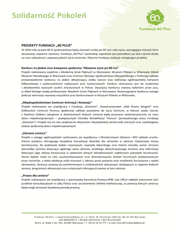 PROJEKTY FUNDACJI „60 PLUS” W 2020 roku prawie 60 % społeczeństwa będą stanowić osoby po 60-tym roku życia, wymagające różnych form aktywizacji, wsparcia i pomocy. Fundacja „60 Plus” wychodząc naprzeciw tym potrzebom już dziś czynnie działa na rzecz aktywizacji i poprawy jakości życia seniorów. Obecnie Fundacja realizuje następujące projekty: Konkurs na plakat oraz kampania społeczna “Aktywne życie po 60-tce” Projekt realizowany wspólnie z Akademią Sztuk Pięknych w Warszawie, Muzeum Plakatu w Wilanowie Odział Muzeum Narodowego w Warszawie oraz Centrum Rozwoju Społeczeństwa Obywatelskiego z Freiburga zakłada przeprowadzenie konkursu na plakat aktywizujący osoby starsze oraz realizację ogólnopolskiej kampanii billboardowej z wykorzystaniem najlepszych prac konkursowych. Konkurs skierowany jest do studentów i absolwentów wyższych uczelni artystycznych w Polsce. Zwycięzcy konkursu zostaną wyłonieni przez jury, w skład którego wejdą profesorowie Akademii Sztuk Pięknych w Warszawie. Rozstrzygnięcie konkursu nastąpi podczas wernisażu wystawy wszystkich prac konkursowych w Muzeum Plakatu w Wilanowie. „Międzypokoleniowe Centrum Animacji i Rozwoju” Projekt realizowany we współpracy z Fundacją „Dzieciom”, Stowarzyszeniem „Mali Bracia Ubogich” oraz Żoliborskim Centrum Pomocy Społecznej zakłada powołanie do życia Centrum, w którym osoby starsze z Dzielnicy Żoliborz (skupione w dzielnicowych klubach seniora) będą pracować wolontarystycznie na rzecz dzieci niepełnosprawnych – podopiecznych Ośrodka Rehabilitacji “Amicus” (prowadzonego przez Fundację „Dzieciom”). Projekt ma na celu zwiększenie aktywności obywatelskiej wśród osób starszych oraz zapobieganie izolacji społecznej dzieci niepełnosprawnych. „Zdrowie seniora” Projekt o zasięgu ogólnopolskim realizowany we współpracy z Ministerstwem Zdrowia i NFZ zakłada uruchomienie autokaru oferującego bezpłatne konsultacje lekarskie dla seniorów w zakresie Całościowej Oceny Geriatrycznej. Na podstawie badań rutynowych, wywiadu lekarskiego oraz historii choroby senior otrzyma komunikat zwrotny dotyczący ogólnego stanu zdrowia, przebiegu dotychczasowego leczenia oraz informacje dotyczące jego dalszej kontynuacji (z podaniem danych teleadresowych najbliższych placówek leczniczych). Ocena będzie miała na celu usystematyzowanie oraz skoordynowanie działań leczniczych podejmowanych przez seniorów, a także edukację osób starszych z zakresu praw pacjenta oraz możliwości korzystania z opieki zdrowotnej. Seniorzy zostaną też poinformowani o możliwościach aktywizacji: działających w regionie klubach seniora, programach aktywizacji oraz instytucjach oferujących pomoc w tym zakresie. „Prawo dla seniora” Projekt realizowany we współpracy z warszawską Kancelarią Prawną KPRF Law Office zakłada stworzenie sieci punktów konsultacyjnych w całej Polsce oraz uruchomienie infolinii telefonicznej, za pomocą których seniorzy będą mogli otrzymać bezpłatną poradę prawną.