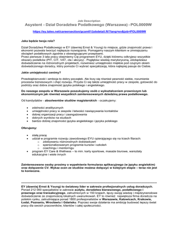 Job Description Asystent - Dział Doradztwa Podatkowego (Warszawa) - POL0009W https://ey.taleo.net/careersection/gcam01/jobdetail.ftl?lang=en&job=POL0009W Jaka będzie twoja rola? Dział Doradztwa Podatkowego w EY (dawniej Ernst & Young) to miejsce, gdzie znajomość prawa i ekonomii pozwala tworzyć najlepsze rozwiązania. Pomagamy naszym klientom w zmniejszaniu obciążeń podatkowych zgodnie z obowiązującymi przepisami. Przez pierwsze 3 lata pracy obejmiemy Cię programem EYU, dzięki któremu odkryjesz wszystkie obszary podatków (PIT, CIT, VAT, cła i akcyzy) . Pogłębisz wiedzę merytoryczną, zdobędziesz doświadczenie na różnorodnych projektach, rozwiniesz umiejętności miękkie pod czujnym okiem doświadczonego doradcy, który pomoże Ci wybrać specjalizację, która najlepiej pasuje do Ciebie. Jakie umiejętności cenimy? Przedsiębiorczość i ambicja to dobry początek. Ale liczy się również pewność siebie, rozumienie procesów biznesowych i chęć rozwoju. Przyda Ci się także umiejętność pracy w zespole, gotowość do podróży oraz dobra znajomość języka polskiego i angielskiego. Do naszego zespołu w Warszawie poszukujemy osób z wykształceniem prawniczym lub ekonomicznym jak również wszystkich zainteresowanych dziedziną prawa podatkowego. Od kandydatów - absolwentów studiów magisterskich - oczekujemy: zdolności analitycznych umiejętności pracy w zespole i łatwości nawiązywania kontaktów dobrej organizacji pracy i zaangażowania dobrych wyników na studiach bardzo dobrej znajomości języka angielskiego i języka polskiego Oferujemy: stałą pracę udział w programie rozwoju zawodowego EYU opierającego się na trzech filarach: o zdobywaniu różnorodnych doświadczeń o spersonalizowanym programie kursów i szkoleń o coachingu i mentoringu program EY Care & Wellness – to min. karty sportowe, masaże biurowe, warsztaty edukacyjne i wiele innych Zainteresowane osoby prosimy o wypełnienie formularza aplikacyjnego (w języku angielskim) oraz dołączenie CV. Wykaz ocen ze studiów możesz dołączyć w kolejnym etapie – teraz nie jest to konieczne. ******************************************************************************************************************** EY (dawniej Ernst & Young) to światowy lider w zakresie profesjonalnych usług doradczych. Ponad 212 000 specjalistów w zakresie audytu, doradztwa biznesowego, podatkowego i prawnego oraz transakcyjnego, zatrudnionych w 150 krajach, łączy swoją wiedzę i międzynarodowe doświadczenie ze znajomością lokalnych uwarunkowań. EY to również największa firma doradcza na polskim rynku, zatrudniająca ponad 1800 profesjonalistów w Warszawie, Katowicach, Krakowie, Łodzi, Poznaniu, Wrocławiu i Gdańsku. Poprzez swoje działania ma ambicję budować lepszy świat pracy dla swoich pracowników, klientów i całej społeczności.