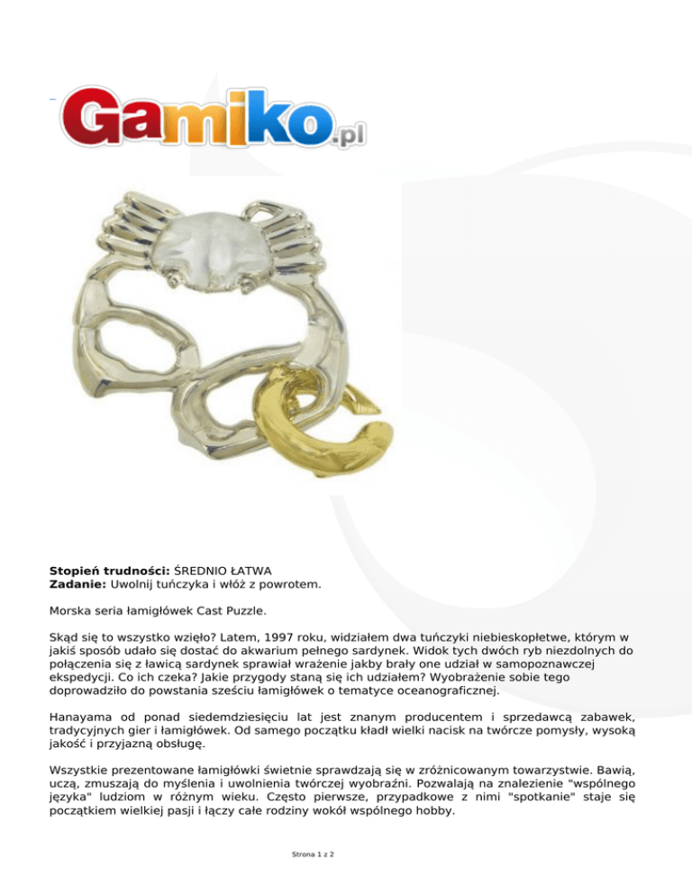 Stopień trudności: ŚREDNIO ŁATWA Zadanie: Uwolnij tuńczyka i włóż z powrotem. Morska seria łamigłówek Cast Puzzle. Skąd się to wszystko wzięło? Latem, 1997 roku, widziałem dwa tuńczyki niebieskopłetwe, którym w jakiś sposób udało się dostać do akwarium pełnego sardynek. Widok tych dwóch ryb niezdolnych do połączenia się z ławicą sardynek sprawiał wrażenie jakby brały one udział w samopoznawczej ekspedycji. Co ich czeka? Jakie przygody staną się ich udziałem? Wyobrażenie sobie tego doprowadziło do powstania sześciu łamigłówek o tematyce oceanograficznej. Hanayama od ponad siedemdziesięciu lat jest znanym producentem i sprzedawcą zabawek, tradycyjnych gier i łamigłówek. Od samego początku kładł wielki nacisk na twórcze pomysły, wysoką jakość i przyjazną obsługę. Wszystkie prezentowane łamigłówki świetnie sprawdzają się w zróżnicowanym towarzystwie. Bawią, uczą, zmuszają do myślenia i uwolnienia twórczej wyobraźni. Pozwalają na znalezienie "wspólnego języka" ludziom w różnym wieku. Często pierwsze, przypadkowe z nimi "spotkanie" staje się początkiem wielkiej pasji i łączy całe rodziny wokół wspólnego hobby. Strona 1 z 2 Proponujemy zapoznanie się z szalenie pomysłowymi i bardzo dobrze wykonanymi łamigłówkami, których rozwiązanie zapewni godziny fantastycznej zabawy. Uwaga! Wszystkie łamigłówki można rozwiązać BEZ UŻYCIA SIŁY. Zawartość pudełka: 1 szt. łamigłówki Wiek 8+ Liczba graczy 1 Czas gry 60 - 120 minut Instrukcja polska Wydanie angielskie Producent Hanayama Strona 2 z 2
