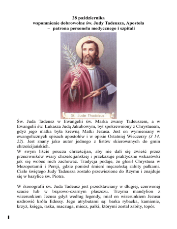 28 października wspomnienie dobrowolne św. Judy Tadeusza, Apostoła patrona personelu medycznego i szpitali Św. Juda Tadeusz w Ewangelii św. Marka zwany Tadeuszem, a w Ewangelii św. Łukasza Judą Jakubowym, był spokrewniony z Chrystusem, gdyż jego matka była krewną Matki Jezusa. Jest on wymieniany w ewangelicznych spisach apostołów i w opisie Ostatniej Wieczerzy (J 14, 22). Jest znany jako autor jednego z listów skierowanych do gmin chrześcijańskich. W swym liście poucza chrześcijan, aby nie dali się zwieść przez przeciwników wiary chrześcijańskiej i przekazuje praktyczne wskazówki jak się wobec nich zachować. Tradycja podaje, że głosił Chrystusa w Mezopotamii i Persji, gdzie poniósł śmierć męczeńską zabity pałkami. Ciało świętego Judy Tadeusza zostało przewiezione do Rzymu i znajduje się w bazylice św. Piotra. W ikonografii św. Juda Tadeusz jest przedstawiany w długiej, czerwonej szacie lub w brązowo-czarnym płaszczu. Trzyma mandylion z wizerunkiem Jezusa gdyż według legendy, miał on wizerunkiem Jezusa uzdrowić króla Edessy. Jego atrybutami są: barka rybacka, kamienie, krzyż, księga, łaska, maczuga, miecz, pałki, którymi został zabity, topór. 1 Modlitwy do św. Judy Tadeusza: Święty Judo Tadeuszu, patronie w sprawach szczególnie trudnych i beznadziejnych, módl się za nami, którzy się do Ciebie uciekamy. Święty Judo Tadeuszu, potężny mój Obrońco i opiekunie, w trosce i opuszczeniu oddaję się Twej cudownej opiece. Wdzięczny Ci jestem za wszystkie łaski, jakie dla mnie już wyjednałeś, a proszę Cię i nadal wspieraj mnie w pracy, pocieszaj w smutku, strzeż przed pokusą. Bądź moją mocą w trudnościach, osłoną w niebezpieczeństwach. Spraw, abym z Bogiem się budził i z Bogiem szedł na spoczynek. Dzień po dniu prowadź mnie coraz bliżej Serca Jezusowego, abym spoczął w Nim po trudach i walkach życia, a zamiast miłości własnej, pychy i zniechęcenia, niech w mym sercu zapanuje miłość, ofiarność i pokora. Amen. O święty Judo Tadeuszu, krewny Chrystusa Pana, wielki Apostole i Męczenniku, sławny cnotami i cudami, Ty jesteś potężnym Orędownikiem w przykrych położeniach i sprawach rozpaczliwych. Przychodzę do Ciebie z pokorą i ufnością i z głębi duszy wzywam Twojej przed Bogiem pomocy. O święty mój Patronie, któremu Bóg dał przywilej ratowania w wypadkach, gdzie już nie ma nadziei pomocy, spojrzyj na mnie łaskawie. Oto życie moje pełne cierpień i boleści; dzień za dniem upływa w ucisku, a serce moje wezbrało goryczą. Drogi mojego życia gęstym pokryły się cierpieniem i ledwie dzień mija bez troski i łez. Umysł mój otoczony ciemnością; niepokój, zniechęcenie i rozpacz nawet wdzierają się do duszy tak, iż niemal zapominam o Boskiej Opatrzności. O święty mój Orędowniku, ty mnie nie możesz opuścić w tym moim smutnym położeniu. Nie odejdę od stóp Twoich, dopóki mnie nie wysłuchasz. Pospiesz ku ratunkowi mojemu, a wdzięczność moją okazywać Ci będę przez całe życie, szerząc cześć Twoją. Amen. Najsłodszy Panie Jezu Chryste, w zjednoczeniu z niepojętą niebiańską chwałą, która z Trójcy Przenajświętszej spływa na ludzkość całą, na Pannę Najświętszą, na wszystkich aniołów i świętych, sławię, uwielbiam i składam Ci dzięki za łaski i dary, którymi obdarzyłeś Twego wybranego Apostoła, co miał szczęście do Twojej rodziny się zaliczać. Błagam Cię, racz mi udzielić Twej łaski dla jego zasług i wspieraj mnie za jego przyczyną we wszelkich potrzebach. Amen. 2 Litania do świętego Judy Tadeusza Kyrie eleison, Chryste eleison, Kyrie eleison. Chryste, usłysz nas. Chryste, wysłuchaj nas. Ojcze z nieba, Boże, zmiłuj się nad nami. Synu Odkupicielu świata, Boże, zmiłuj się nad nami. Duchu Święty, Boże, zmiłuj się nad nami. Święta Trójco, jedyny Boże, zmiłuj się nad nami. Święta Maryjo, módl się za nami Święta Boża Rodzicielko, módl się za nami Królowo Apostołów, módl się za nami Święty Judo Tadeuszu, módl się za nami Święty Judo, chwalebny Apostole, módl się za nami Święty Judo, gorliwy wyznawco, módl się za nami Święty Judo, przyjacielu Chrystusa, módl się za nami Święty Judo, wierny sługo Boży, módl się za nami Święty Judo, powołany do głoszenia Ewangelii, módl się za nami Święty Judo, głosicielu Słowa Bożego, módl się za nami Święty Judo rozniecający miłość bożą w ludzkich duszach, módl się za nami Święty Judo, występujący mężnie w obronie wiary świętej, módl się za nami Święty Judo, który jesteś dla nas przykładem życia chrześcijańskiego, módl się za nami Święty Judo, który cierpiałeś prześladowania dla wiary, módl się za nami Święty Judo, potwierdzający własną krwią wiarę w Chrystusa, módl się za nami Święty Judo, Patronie w sprawach szczególnie trudnych i beznadziejnych módl się za nami Abyśmy z naszych grzechów powstali, módl się za nami Abyśmy szczerze pokutowali, módl się za nami Abyśmy gorliwymi byli w służbie Bożej, módl się za nami Abyśmy w dobrym robili postępy, módl się za nami Abyśmy w zgodzie i jedności żyli, módl się za nami Abyśmy wiarę zawsze zachowali, módl się za nami Abyśmy nigdy nie ulegli zwątpieniu, módl się za nami 3 Abyśmy nigdy nie wpadli w rozpacz, módl się za nami Abyśmy błądzącym zawsze mogli dopomóc, módl się za nami. Abyśmy od wszystkich niebezpieczeństw duszy i ciała uwolnieni byli, módl się za nami. Abyśmy po naszym życiu na ziemi z Tobą się połączyli, módl się za nami. Baranku Boży, który gładzisz grzechy świata, przepuść nam Panie. Baranku Boży, który gładzisz grzechy świata, wysłuchaj nas Panie. Baranku Boży, który gładzisz grzechy świata, zmiłuj się nad nami. Módlmy się: Boże, który nas przez Świętego Judę Tadeusza raczyłeś doprowadzić do poznania Swojego Imienia, spraw p