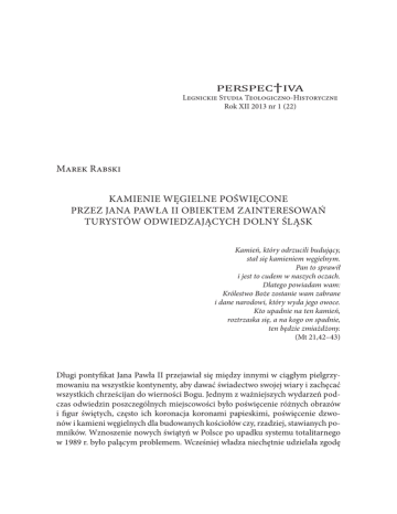 Kamienie węgielne poświęcone przez Jana Pawła II 131 PERSPEC†IVA Legnickie Studia Teologiczno-Historyczne Rok XII 2013 nr 1 (22) Marek Rabski KAMIENIE WĘGIELNE POŚWIĘCONE PRZEZ JANA PAWŁA II OBIEKTEM ZAINTERESOWAŃ TURYSTÓW ODWIEDZAJĄCYCH DOLNY ŚLĄSK Kamień, który odrzucili budujący, stał się kamieniem węgielnym. Pan to sprawił i jest to cudem w naszych oczach. Dlatego powiadam wam: Królestwo Boże zostanie wam zabrane i dane narodowi, który wyda jego owoce. Kto upadnie na ten kamień, roztrzaska się, a na kogo on spadnie, ten będzie zmiażdżony. (Mt 21,42–43) Długi pontyfikat Jana Pawła II przejawiał się między innymi w ciągłym pielgrzymowaniu na wszystkie kontynenty, aby dawać świadectwo swojej wiary i zachęcać wszystkich chrześcijan do wierności Bogu. Jednym z ważniejszych wydarzeń podczas odwiedzin poszczególnych miejscowości było poświęcenie różnych obrazów i figur świętych, często ich koronacja koronami papieskimi, poświęcenie dzwonów i kamieni węgielnych dla budowanych kościołów czy, rzadziej, stawianych pomników. Wznoszenie nowych świątyń w Polsce po upadku systemu totalitarnego w 1989 r. było palącym problemem. Wcześniej władza niechętnie udzielała zgodę 132 Marek Rabski na ich budowę. Ks. Karol Wojtyła, będąc jeszcze biskupem czy kardynałem, dostrzegał wagę budowy świątyń, szczególnie w nowo powstających osiedlach robotniczych. Wymowna jest tu walka o kościół w Nowej Hucie, dzielnicy Krakowa. Dostrzegając istotę i konieczność budowy nowych świątyń, Ojciec Święty chętnie święcił kamienie węgielne dla nowo powstających kościołów. Współcześnie informacje o poświęceniu kamienia węgielnego dla świątyni znajdują poczesne miejsce w obiekcie sakralnym, tak aby wierni i goście wiedzieli o tym doniosłym wydarzeniu. Fakt ten nadaje takiemu obiektowi jakby dodatkowej rangi i podkreśla jego związek z osobą naszego rodaka. Jest to także zachęta, aby akie miejsce „papieskie” odwiedzić, co w naturalny sposób łączy się z turystyką krajoznawczą. 1. Znaczenie terminu „kamień węgielny” w Piśmie Świętym i słowniku języka polskiego „Zbliżcie się do Niego, bo jest żywym kamieniem, który ludzie odrzucili, ale dla Boga jest wybrany i drogocenny! Również i wy, jako żywe kamienie, służycie do budowy duchowego domu, aby stać się świętym kapłaństwem i składać duchowe ofiary, miłe Bogu dzięki Jezusowi Chrystusowi. Napisane jest bowiem w Piśmie: Oto kładę na Syjonie kamień, kamień węgielny i drogocenny. Kto wierzy w Niego, nie będzie zawiedziony. Chwała wam, którzy wierzycie! Dla niewierzących zaś właśnie ten kamień, który odrzucili budujący, stał się kamieniem węgielnym, kamieniem, o który ludzie się potykają, i skałą, przez którą upadają!” (1 P 2,4-8). Kamieniem węgielnym jest Chrystus. Na nim trzeba się oprzeć jak na skale. Skała jest solidnym fundamentem dla budowli, której nie przemogą żadne kataklizmy – burze i wichry. Słownik współczesnego języka polskiego definiuje „kamień węgielny” w trzech znaczeniach: „1. duży kamień kładziony jako fundament pod narożnik budynku (dawniej zwłaszcza w budownictwie drewnianym); 2. akt erekcyjny umieszczony w miejscu przeznaczonym pod budowę; pierwsza cegła użyta do budowy; 3. początek jakiejś działalności, podstawa jej rozpoczęcia, najistotniejsza rzecz: wynalazek braci Lumiere był kamieniem węgielnym dla rozwoju kinematografii”1. Chyba najpełniej na temat istoty poświęcania i wmurowywania kamieni węgielnych wypowiedział się Ojciec Święty podczas trzeciej wizyty duszpasterskiej w Polsce. Oto podczas wmurowania kamienia węgielnego pod budowę seminarium duchownego dla diecezji szczecińsko-kamieńskiej w katedrze św. Jakuba w Szczecinie dnia 11 czerwca 1987 r. powiedział: „Chrystus jest kamieniem węgielnym tej budowy. Przestrzeń Ducha Świętego, Ducha Prawdy, Parakleta, otwarła się w sercach ludzkich, otwarła się w dziejach człowieka – przez jego krzyż i zmartwychwstanie. 1 Słownik współczesnego języka polskiego. Warszawa: Przegląd Reader’s Digest 1998. Kamienie węgielne poświęcone przez Jana Pawła II 133 Właśnie przez to, że ten «kamień węgielny» został odrzucony przez ludzi. Właśnie przez to, iż – w tym odrzuceniu – stał się pierwszym «żywym kamieniem: drogocennym, wybranym u Boga» [...]. Wmurowaliśmy przeto ten kamień węgielny, aby był symbolicznym wiązaniem dla wszystkich kamieni, jakie wchodzą w budynek Waszego seminarium. Ta zaś budowa z martwych kamieni ma przyjąć w siebie wspólnotę «żywych kamieni». Ma być w przyszłości codziennym, nieodzownym świadkiem systematycznego procesu, poprzez który przygotowuje się wewnętrzna przestrzeń dla działania Ducha Świętego w młodych ludzkich duszach, przestrzeń dojrzewania powołań kapłańskich”2. 2. Historia poświęcenia kamieni węgielnych przez Jana Pawła II na Dolnym Śląsku Kamienie węgielne, będące przedmiotem niniejszego opracowania, z reguły wykonane zostały w formie prostokątnej płyty granitowej, która wmurowana została w ścianę, najczęściej wewnątrz świątyni. Rzadko towarzyszą temu dodatkowe elementy, tj. tuba z aktem erekcyjnym zawierającym materiały na temat budowanego kościoła czy samym kamieniem wmurowanym w fundament lub ścianę świątyni. Tak więc w tym przypadku kamień węgielny to w zdecydowanej większości tablica przybierająca różne formy zewnętrze widzialne dla wiernych i gości. Chronologicznie kamienie dla kościołów święcone były przede wszystkim podczas kolejnych pielgrzymek papieża w dwóch miejscowościach Dolnego Śląska: w 1983 r. we Wrocławiu i 1997 r. we Wrocławiu i w Legnicy. Wyjątkowo możemy także zauważyć tablice poświęcone w innych miejscach i w innym czasie, bądź to w Polsce czy w Watykanie. Przykładowo w kościele pw. Matki Bo