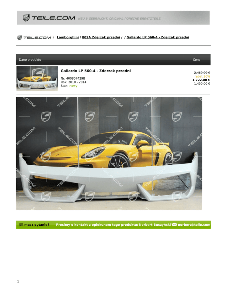 Lamborghini / 802A Zderzak przedni / / Gallardo LP 560-4 - Zderzak przedni Dane produktu Cena Gallardo LP 560-4 - Zderzak przedni Nr: 400807429B Rok: 2010 - 2014 Stan: nowy masz pytanie? 1 Prosimy o kontakt z opiekunem tego produktu: Norbert Buczyński 2.460,00 € rabat 30% 1.722,00 € 1.400,00 € [email protected] 2