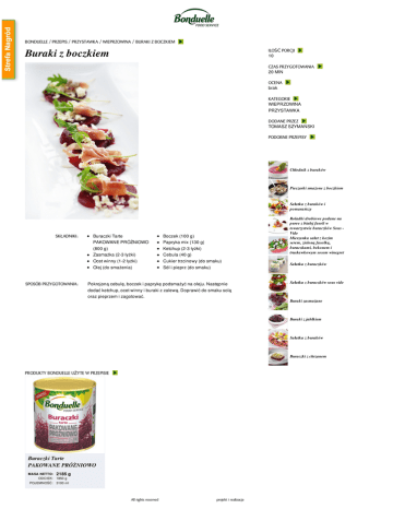 BONDUELLE / PRZEPIS / PRZYSTAWKA / WIEPRZOWINA / BURAKI Z BOCZKIEM Buraki z boczkiem ILOŚĆ PORCJI 10 CZAS PRZYGOTOWANIA 20 MIN OCENA brak KATEGORIE WIEPRZOWINA PRZYSTAWKA DODANE PRZEZ TOMASZ SZYMAŃSKI PODOBNE PRZEPISY Chłodnik z buraków Pieczarki smażone z boczkiem Sałatka z buraków i pomarańczy SKŁADNIKI: SPOSÓB PRZYGOTOWANIA: Buraczki Tarte PAKOWANE PRÓŻNIOWO (800 g) Zasmażka (2-3 łyżki) Ocet winny (1-2 łyżki) Olej (do smażenia) Boczek (100 g) Papryka mix (130 g) Ketchup (2-3 łyżki) Cebula (40 g) Cukier trzcinowy (do smaku) Sól i pieprz (do smaku) Pokrojoną cebulę, boczek i paprykę podsmażyć na oleju. Następnie dodać ketchup, ocet winny i buraki z zalewą. Doprawić do smaku solą oraz pieprzem i zagotować. Roladki drobiowe podane na puree z białej fasoli w towarzystwie buraczków Sous Vide Mieszanka sałat z kozim serem, zieloną fasolką, buraczkami, bekonem i truskawkowym sosem winegret Sałatka z buraczków Sałatka z buraczków sous vide Buraki zasmażane Buraki z jabłkiem Sałatka z buraków Buraczki z chrzanem PRODUKTY BONDUELLE UŻYTE W PRZEPISIE Buraczki Tarte PAKOWANE PRÓŻNIOWO MASA NETTO: 2185 g ODCIEK: 1850 g POJEMNOŚĆ: 3100 ml All rights reserved projekt i realizacja Copyright © 2012-2015 Bonduelle Agencja Reklamowa 4 ALL