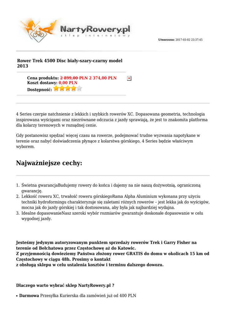 Utworzono: 2017-03-02 23:37:45 Rower Trek 4500 Disc biały-szary-czarny model 2013 Cena produktu: 2 899,00 PLN 2 374,00 PLN Koszt dostawy: 0,00 PLN Dostępność: 4 Series czerpie natchnienie z lekkich i szybkich rowerów XC. Dopasowana geometria, technologia inspirowana wyścigami oraz niezrównane odczucia z jazdy sprawiają, że jest to znakomita platforma dla kolarzy terenowych w rozsądnej cenie. Gdy postanowisz spędzać więcej czasu na rowerze, podejmować trudne wyzwania napotykane w terenie oraz nabyć doświadczenia płynące z kolarstwa górskiego, 4 Series będzie właściwym wyborem. Najważniejsze cechy: 1. Świetna gwarancjaBudujemy rowery do końca i dajemy na nie naszą dożywotnią, ograniczoną gwarancję. 2. Lekkość roweru XC, trwałość roweru górskiegoRama Alpha Aluminium wykonana przy użyciu techniki hydroformingu charakteryzuje się zaletami różnych rowerów – jest lekka jak do wyścigów, mocna jak do jazdy górskiej i tak dostosowana, aby była jak najbardziej wydajna. 3. Idealne dopasowanieNasz szeroki wybór rozmiarów gwarantuje doskonałe dopasowanie w celu wygodnej jazdy. Jesteśmy jedynym autoryzowanym punktem sprzedaży rowerów Trek i Garry Fisher na terenie od Bełchatowa przez Częstochowę aż do Katowic. Z przyjemnością dowieziemy Państwa złożony rower GRATIS do domu w okolicach 15 km od Częstochowy w ciągu 48h. Prosimy o kontakt z obsługą sklepu w celu ustalenia kosztów i terminu dalszego dowozu. Dlaczego warto wybrać sklep NartyRowery.pl ? ● Darmowa Przesyłka Kurierska dla zamówień już od 400 PLN ● ● ● ● ● ● ● ● ● ● ● ● Szybka dostawa w 24h Możliwość zwrotu lub wymiany towaru w ciągu 10 dni od zakupu W naszym sklepie internetowym są tylko aktualnie dostępne produkty (zredukowaliśmy do minimum ryzyko braku dostępności zamówionego towaru) Możliwość negocjacji cen Częste promocje i rabaty ( obniżki cen, rabat na akcesoria, gratisy do rowerów) Fachowe doradztwo Pozytywne opinie w niezależnych serwisach m.in. Opineo, Allegro i porównywarkach cen Możliwość zakupu na raty - obsługujemy systemy Żagiel i Cetelem Sprzedajemy rowery wyregulowane i przesmarowane Do każdego zamówienia otrzymasz paragon lub fakturę stanowiący podstawę gwarancji Szczegółowe informacje o statusie zamówienia i wysyłce na adres e-mail podany w zamówieniu Obsługujemy płatności internetowe i Paypal Dołożono wszelkich starań, aby opisy i zdjęcia produktów były dokładne i aktualne. Specyfikacje i ceny mogą ulec zmianie bez uprzedzenia Płeć Przeznaczenie Manetki Widelec/ amortyzator Męski Górski / MTB Shimano Alivio, 9-biegowe SR Suntour XCT z goleniami 30 mm, sprężyną stalową, regulacją napreżenia wstępnego, skokiem 100mm Przerzutka przód Shimano Acera Przerzutka tył Shimano Deore Kaseta/ wolnobieg Shimano HG20 11-34, 9-biegowa Korbowód Pedały Hamulce Shimano Alivio, 44/32/22 Platforma nylonowa Wellgo Hydrauliczne hamulce tarczowe Shimano M395 Piasta przód Przednia piasta ze stopu Formula DC20 LW; tylna piasta ze stopu Formula DC22 LW z dwusciennymi obręczami z 32 otworami Bontrager AT-650 Piasta tył Przednia piasta ze stopu Formula DC20 LW; tylna piasta ze stopu Formula DC22 LW z dwusciennymi obręczami z 32 otworami Bontrager AT-650 Obręcze Przednia piasta ze stopu Formula DC20 LW; tylna piasta ze stopu Formula DC22 LW z dwusciennymi obręczami z 32 otworami Bontrager AT-650 Szprychy Przednia piasta ze stopu Formula DC20 LW; tylna piasta ze stopu Formula DC22 LW z dwusciennymi obręczami z 32 otworami Bontrager AT-650 Kolekcja 2013 Opony Bontrager XR2, 26x2,2" Stery Częściowo maszynowe, zintegrowane, bezgwintowe łożyska 1–1/8" Mostek Bontrager SSR, 31,8 mm, 10 st. Kierownica Bontrager Low Riser, 31,8 mm, wznios 15 mm, odchylenie 9 st. Chwyty Bontrager Race Siodło Bontrager Evoke 1 Sztyca Bontrager SSR, 31,6mm, wysunięcie 20mm Waga b.d. Rama Rama Alpha Gold Aluminum z częściowo zintegrowaną główką ramy, wewnętrznie cieniowanymi i wykonanymi metodą hydroformingu rurami, wewnętrznym prowadzeniem linek przedniej przerzutki, mocowaniami bagażnika oraz błotnika, wymiennym hakiem przerzutki Hamulce Tarczowe hydrauliczne Damper brak Pegi brak Łańcuch Gwarancja Ilość biegów Adres: http://nartyrowery.pl/ b.d dożywotnia na ramę i 2 lata na osprzęt 27 Telefon: 34 365 66 09, 793 61 04 29 Email: [email protected] Gadu-Gadu: Skype: