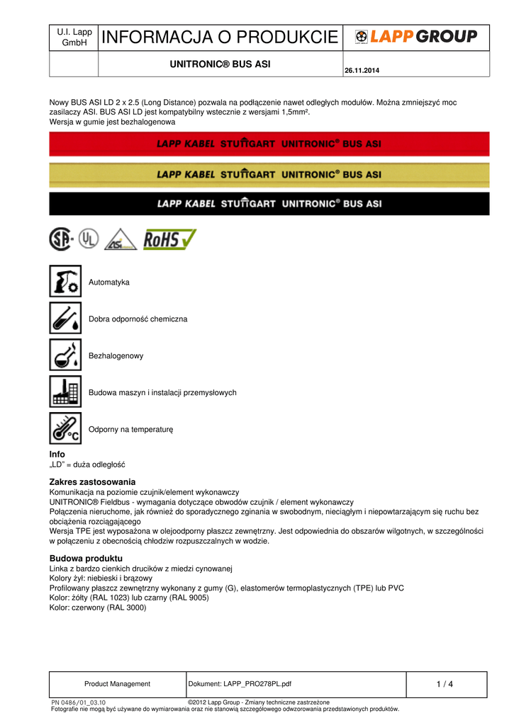 U.I. Lapp GmbH INFORMACJA O PRODUKCIE UNITRONIC® BUS ASI 26.11.2014 Nowy BUS ASI LD 2 x 2.5 (Long Distance) pozwala na podłączenie nawet odległych modułów. Można zmniejszyć moc zasilaczy ASI. BUS ASI LD jest kompatybilny wstecznie z wersjami 1,5mm². Wersja w gumie jest bezhalogenowa Automatyka Dobra odporność chemiczna Bezhalogenowy Budowa maszyn i instalacji przemysłowych Odporny na temperaturę Info „LD” = duża odległość Zakres zastosowania Komunikacja na poziomie czujnik/element wykonawczy UNITRONIC® Fieldbus - wymagania dotyczące obwodów czujnik / element wykonawczy Połączenia nieruchome, jak również do sporadycznego zginania w swobodnym, nieciągłym i niepowtarzającym się ruchu bez obciążenia rozciągającego Wersja TPE jest wyposażona w olejoodporny płaszcz zewnętrzny. Jest odpowiednia do obszarów wilgotnych, w szczególności w połączeniu z obecnością chłodziw rozpuszczalnych w wodzie. Budowa produktu Linka z bardzo cienkich drucików z miedzi cynowanej Kolory żył: niebieski i brązowy Profilowany płaszcz zewnętrzny wykonany z gumy (G), elastomerów termoplastycznych (TPE) lub PVC Kolor: żółty (RAL 1023) lub czarny (RAL 9005) Kolor: czerwony (RAL 3000) Product Management Dokument: LAPP_PRO278PL.pdf ©2012 Lapp Group - Zmiany techniczne zastrzeżone PN 0486/01_03.10 Fotografie nie mogą być używane do wymiarowania oraz nie stanowią szczegółowego odwzorowania przedstawionych produktów. 1/4 U.I. Lapp GmbH INFORMACJA O PRODUKCIE UNITRONIC® BUS ASI 26.11.2014 Normy i aprobaty ASI standard europejski wg EN 50295 oraz standard międzynarodowy wg IEC 62026-2, Wersja z PVC z aprobatą UL/CSA (CMG) wersja UL/CSA: CMGc(UL)us lub (UL)CL2 oraz aprobaty AWM 300V FT4 Cechy produktu Zarówno dane, jak i zasilanie są przesyłane za pośrednictwem nieekranowanego, geometrycznie kodowanego, dwużyłowego kabla płaskiego (ochrona przed zmianą polaryzacji). W modułach ASI żyły są podłączane przy pomocy technologii automatycznego przekłuwania izolacji. Podłączenie czujników do modułu ASI (moduł połączeniowy) przeprowadza się za pomocą przewodów okrągłych (kable połączeniowe). Wskazówka Wszystkie podane wartości dotyczące produktów są wartościami nominalnymi (o ile nie wskazano inaczej). Inne wartości, takie jak np. tolerancje mogą być przedstawione na zamówienie (jeżeli są dostępne i przeznaczone do publikacji). Standardowe odcinki proszę sprawdzić na: www.lapppolska.pl LAPPKABEL jest członkiem organizacji użytkowników AS-International Association Fotografie nie mogą być używane do wymiarowania oraz nie stanowią szczegółowego odwzorowania przedstawionych produktów. Dane techniczne Szczytowe napięcie robocze: Żółty: 300 V (nie do zastosowań silnoprądowych) Czarny: 300 V (nie do zastosowań silnoprądowych) Czerwony: 300 V Rezystancja żyły: 1,5 mm²: maks. 13,7 Ω/km 2,5 mm²: maks. 8,21 Ω/km Minimalny promień gięcia: Połączenia nieruchome: 12 mm Do połączeń ruchomych 24 mm Napięcie próbne: Żyła/Żyła: 2000 V Zakres temperatury: W zależności od materiału płaszcza zewnętrznego: PVC: -30°C do +90°C Inne materiały: -40°C do +85°C Podczas montażu: PVC -20°C do +90°C Inne materiały: -30°C do +85°C Product Management Dokument: LAPP_PRO278PL.pdf ©2012 Lapp Group - Zmiany techniczne zastrzeżone PN 0486/01_03.10 Fotografie nie mogą być używane do wymiarowania oraz nie stanowią szczegółowego odwzorowania przedstawionych produktów. 2/4 Powered by TCPDF (www.tcpdf.org) Materiał płaszcza Kolor płaszcza Aplikacja Liczba żył i przekrój [mm²] Indeks miedzi [kg/km] Waga [kg/km] U.I. Lapp GmbH Oznaczenie wyrobu Dla połączeń nieruchomych i giętkich (wiązka 19-drutowa) UNITRONIC® BUS ASI (G) EPDM (guma) żółty Transmisja danych i zasilanie 2 x 1,5 29.0 85 2170229 UNITRONIC® BUS ASI (G) EPDM (guma) czarny Zasilanie pomocnicze 2 x 1,5 30V DC 29.0 85 2170371 UNITRONIC® BUS ASI LD (G) EPDM (guma) żółty Transmisja danych i zasilanie 2 x 2,5 48.0 85 2170372 UNITRONIC® BUS ASI LD (G) EPDM (guma) czarny Zasilanie pomocnicze 2 x 2,5 30V DC 48.0 85 2170230 UNITRONIC® BUS ASI (TPE) TPE żółty Transmisja danych i zasilanie 2 x 1,5 29.0 64 2170231 UNITRONIC® BUS ASI (TPE) TPE czarny Zasilanie pomocnicze 2 x 1,5 30V DC 29.0 64 2170232 UNITRONIC® BUS ASI (TPE) TPE czerwony Zasilanie pomocnicze 2 x 1,5 230 V AC 29.0 64 2170842 UNITRONIC® BUS ASI (PVC) A PVC UL/CSA (CMG) żółty Transmisja danych i zasilanie 2 x 1,5 29.0 70 2170843 UNITRONIC® BUS ASI (PVC) A PVC UL/CSA (CMG) czarny Zasilanie pomocnicze 2 x 1,5 30V DC 29.0 70 2170844 UNITRONIC® BUS ASI (PVC) A PVC UL/CSA (CMG) czerwony Zasilanie pomocnicze 2 x 1,5 230 V AC 29.0 70 UNITRONIC® BUS ASI Dokument: LAPP_PRO278PL.pdf 2170228 INFORMACJA O PRODUKCIE Product Management 26.11.2014 ©2012 Lapp Group - Zmiany techniczne zastrzeżone PN 0486/01_03.10 Fotografie nie mogą być używane do wymiarowania oraz nie stanowią szczegółowego odwzorowania przedstawionych produktów. Numer artykułu 3/4 Powered by TCPDF (www.tcpdf.org) U.I. Lapp GmbH INFORMACJA O PRODUKCIE UNITRONIC® BUS ASI Product Management 26.11.2014 Dokument: LAPP_PRO278PL.pdf ©2012 Lapp Group - Zmiany techniczne zastrzeżone PN 0486/01_03.10 Fotografie nie mogą być używane do wymiarowania oraz nie stanowią szczegółowego odwzorowania przedstawionych produktów. 4/4