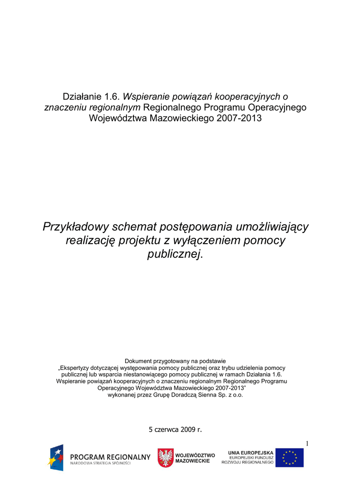 Działanie 1.6. Wspieranie powiązań kooperacyjnych o znaczeniu regionalnym Regionalnego Programu Operacyjnego Województwa Mazowieckiego 2007-2013 Przykładowy schemat postępowania umożliwiający realizację projektu z wyłączeniem pomocy publicznej. Dokument przygotowany na podstawie „Ekspertyzy dotyczącej występowania pomocy publicznej oraz trybu udzielenia pomocy publicznej lub wsparcia niestanowiącego pomocy publicznej w ramach Działania 1.6. Wspieranie powiązań kooperacyjnych o znaczeniu regionalnym Regionalnego Programu Operacyjnego Województwa Mazowieckiego 2007-2013” wykonanej przez Grupę Doradczą Sienna Sp. z o.o. 5 czerwca 2009 r. 1 Spis treści CZĘŚĆ OGÓLNA ................................................................................ 3 Przesłanki występowania pomocy publicznej ........................................... 3 Analiza spełniania przesłanek z art. 87 ust. 1 Traktatu WE .......................... 4 Beneficjent pomocy publicznej ............................................................ 8 CZĘŚĆ SZCZEGÓŁOWA ...................................................................... 11 Identyfikacja występowania pomocy publicznej w ramach Działania 1.6 na „poziomie pierwszym” (w odniesieniu do dofinansowania projektu ze środków RPO WM) ...................................................................................... 11 Identyfikacja występowania pomocy publicznej w ramach Działania 1.6 na „poziomie drugim” (w odniesieniu do działań podejmowanych przez beneficjentów pomocy) .................................................................... 13 Zasady udzielania pomocy publicznej „na poziomie pierwszym” ................. 15 Przykładowy schemat postępowania umożliwiający realizację projektu z wyłączeniem pomocy publicznej „na poziomie pierwszym” ....................... 15 Zasady udzielania pomocy publicznej „na poziomie drugim” ...................... 18 2 CZĘŚĆ OGÓLNA Przesłanki występowania pomocy publicznej Kryteria kwalifikacji wsparcia jako pomocy publicznej zawarte są w art. 87 ust. 1 Traktatu ustanawiającego Wspólnotę Europejską (dalej Traktatu WE). Zgodnie z ww. przepisem, z zastrzeżeniem wyjątków przewidzianych w Traktacie, każda pomoc udzielana przez państwo członkowskie lub ze źródeł państwowych, w jakiejkolwiek formie, która narusza lub grozi naruszeniem konkurencji przez uprzywilejowanie niektórych przedsiębiorstw lub produkcji niektórych towarów, jest niezgodna z zasadami wspólnego rynku w zakresie, w jakim wpływa negatywnie na wymianę handlową pomiędzy państwami członkowskimi. Oznacza to, iż wsparcie dla przedsiębiorstwa (podmiotu prowadzącego działalność gospodarczą) podlega przepisom dotyczącym pomocy publicznej, o ile jednocześnie spełnione są następujące przesłanki: a) udzielane jest ono przez Państwo lub ze środków państwowych, b) przedsiębiorstwo uzyskuje przysporzenie na warunkach korzystniejszych od oferowanych na rynku, c) ma charakter selektywny (uprzywilejowuje określone przedsiębiorstwo lub grupę przedsiębiorstw albo produkcję określonych towarów), d) grozi zakłóceniem lub zakłóca konkurencję, w zakresie w jakim wpływa na wymianę handlową między państwami członkowskimi Unii Europejskiej. W celu rozstrzygnięcia, czy dane wsparcie finansowe będzie stanowić pomoc publiczną w rozumieniu art. 87 ust. 1 Traktatu WE, należy ocenić, czy są spełnione w konkretnym przypadku planowanego wsparcia wszystkie wymienione powyżej przesłanki. Ekspertyza dotyczy oceny występowania pomocy publicznej w ramach regionalnego programu operacyjnego, a wiec aktu prawnego o charakterze ogólnym określającym zasady udzielania dofinansowania projektów. Przeprowadzana analiza występowania pomocy publicznej w odniesieniu do działania programu operacyjnego pozwoli określić typy projektów lub sytuacje, w których będzie istniała konieczność zastosowania w stosunku do udzielanego dofinansowania przepisów o pomocy publicznej. W każdym jednak przypadku ocena ta będzie przeprowadzana w świetle ww. przesłanek pojęcia pomocy publicznej. Należy również zwrócić uwagę na możliwość występowania pomocy publicznej na etapie dysponowania uzyskanymi przez beneficjenta środkami pochodzącymi z uzyskanego dofinansowania. W tym przypadku ocena wystąpienia pomocy publicznej polega również oczywiście na zbadaniu, czy w konkretnym przypadku zachodzą równocześnie wszystkie przesłanki pomocy publicznej (przysporzenie na warunkach korzystniejszych niż rynkowe, selektywność, zakłócenie konkurencji oraz wpływ na wymianę gospodarczą między państwami członkowskimi UE). W ramach analizowanego działania programu operacyjnego ze względu na jego cele istnieje duże prawdopodobieństwo wystąpienia pomocy publicznej w ramach działań wykonywanych przez beneficjenta dysponującego środkami uzyskanymi w ramach dofinansowania. 3 Poniżej przedstawione zostało rozumienie poszczególnych przesłanek wypracowane przez praktykę stosowania art. 87 ust. 1 Traktatu WE oraz ewentualnie przepisy prawa wspólnotowego, które będzie służyć ocenie występowania pomocy publicznej na pierwszym (w odniesieniu do dofinansowania) i ewentualnie drugim poziomie (dysponowania dofinansowaniem przez beneficjenta). Analiza spełniania przesłanek z art. 87 ust. 1 Traktatu WE Ad. a). Aby można zakwalifikować określone korzyści jako pochodzące z źródeł publicznych, konieczne jest, aby po pierwsze, zostały one przyznane bezpośrednio lub pośrednio z zasobów państwowych oraz po drugie, aby można je było przypisać państwu (C-303/88 – orzeczenie z dnia 21 marca 1991 r. w sprawie Włochy przeciwko Komisji Wspólnot Europejskich (Zb. Orz. ETS z 1991 r., str. I-1433) oraz C-482/99 – orzeczenie z dnia 16 maja 2002 r. w sprawie Francja przeciwko Komisji Wspólnot Europejskich (orz. ETS z 2002 r., str. I-4397).). Zgodnie 