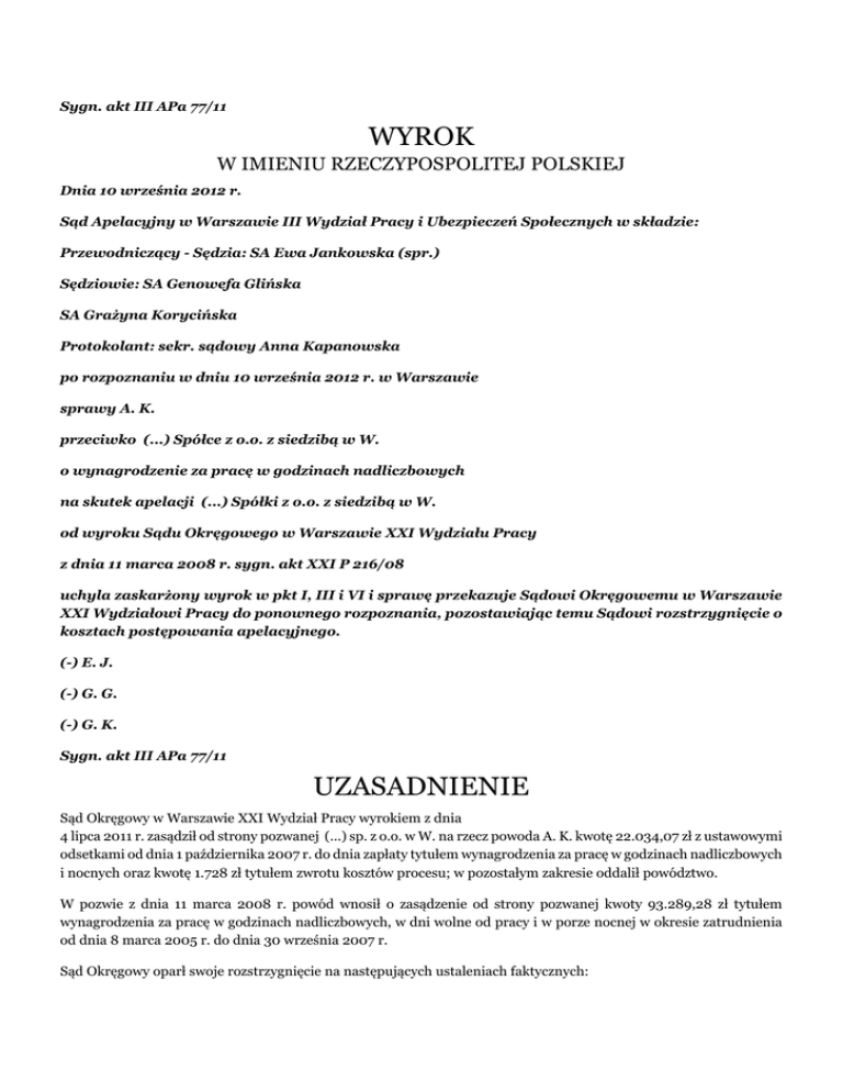 Sygn. akt III APa 77/11 WYROK W IMIENIU RZECZYPOSPOLITEJ POLSKIEJ Dnia 10 września 2012 r. Sąd Apelacyjny w Warszawie III Wydział Pracy i Ubezpieczeń Społecznych w składzie: Przewodniczący - Sędzia: SA Ewa Jankowska (spr.) Sędziowie: SA Genowefa Glińska SA Grażyna Korycińska Protokolant: sekr. sądowy Anna Kapanowska po rozpoznaniu w dniu 10 września 2012 r. w Warszawie sprawy A. K. przeciwko (...) Spółce z o.o. z siedzibą w W. o wynagrodzenie za pracę w godzinach nadliczbowych na skutek apelacji (...) Spółki z o.o. z siedzibą w W. od wyroku Sądu Okręgowego w Warszawie XXI Wydziału Pracy z dnia 11 marca 2008 r. sygn. akt XXI P 216/08 uchyla zaskarżony wyrok w pkt I, III i VI i sprawę przekazuje Sądowi Okręgowemu w Warszawie XXI Wydziałowi Pracy do ponownego rozpoznania, pozostawiając temu Sądowi rozstrzygnięcie o kosztach postępowania apelacyjnego. (-) E. J. (-) G. G. (-) G. K. Sygn. akt III APa 77/11 UZASADNIENIE Sąd Okręgowy w Warszawie XXI Wydział Pracy wyrokiem z dnia 4 lipca 2011 r. zasądził od strony pozwanej (...) sp. z o.o. w W. na rzecz powoda A. K. kwotę 22.034,07 zł z ustawowymi odsetkami od dnia 1 października 2007 r. do dnia zapłaty tytułem wynagrodzenia za pracę w godzinach nadliczbowych i nocnych oraz kwotę 1.728 zł tytułem zwrotu kosztów procesu; w pozostałym zakresie oddalił powództwo. W pozwie z dnia 11 marca 2008 r. powód wnosił o zasądzenie od strony pozwanej kwoty 93.289,28 zł tytułem wynagrodzenia za pracę w godzinach nadliczbowych, w dni wolne od pracy i w porze nocnej w okresie zatrudnienia od dnia 8 marca 2005 r. do dnia 30 września 2007 r. Sąd Okręgowy oparł swoje rozstrzygnięcie na następujących ustaleniach faktycznych: W okresie od dnia 8 marca 2005 r. do dnia 31 marca 2006 r. powód pracowała u strony pozwanej na podstawie umów na czas określony w charakterze Doradcy Klienta Biznesowego w Biurze Sprzedaży (...) Biznesowego, a następnie w tym samym charakterze w Biurze Sprzedaży Aktywnej. W dniu 1 kwietnia 2006 r. strony zawarły umowę na czas nieokreślony ustalając jako stanowisko powoda Doradcę Klienta Biznesowego w Biurze Sprzedaży (...) Biznesowego, z dniem 1 października 2006 r. powód awansował na stanowisko(...) w tym biurze. Przez cały okres zatrudnienia powód pracował w wymiarze pełnego etatu. Umowa o pracę uległa rozwiązaniu z dniem 30 września 2007 r. za wypowiedzeniem dokonanym przez powoda. Na każdym z zajmowanych stanowisk powód miał ściśle określony zakres obowiązków, które Sąd Okręgowy wskazał w uzasadnieniu wyroku w oparciu o dane z akt osobowych powoda. Powód świadczył pracę w siedzibie Spółki w G., ale także w terenie. Praca w terenie polegała na spotkaniach z klientami i wykonywaniu czynności zgodnie z zakresem obowiązków, a także wspieraniu przedstawicieli handlowych. Spotkania z klientami odbywały się w godzinach przedpołudniowych i popołudniowych do godziny 16, ale niekiedy w godzinach późniejszych. W biurze spółki powód umawiał kolejne spotkania, analizował bilingi, sporządzał projekty umów, raportował pracę wysyłając s-msy, w każdy poniedziałek w godzinach między 8 a 11 odbywały się spotkania z przełożonymi. Jako Doradca Klienta Biznesowego powód obsługiwał 500 – 600 klientów w województwie (...) w miejscowościach oddalonych od jego miejsca zamieszkania od 100 do 200 km. Na stanowisku A. Manager powód zajmował się klientami strategicznymi w liczbie 200 w rejonie na północ od centralnej Polski. Do obowiązków powoda należał także udział w szkoleniach i konferencjach, które były jedno – lub kilkudniowe. Powód obowiązkowo brał udział w imprezach, które trwały od godzin wieczornych do wczesnorannych. Głównym zadaniem powoda była realizacja planów sprzedaży. Każdy z handlowców działał pod presją wykonania planu. W pozwanej spółce obowiązywał elektroniczny system kontroli dostępu rejestrujące każde wejście i wyjście pracownika posiadającego magnetyczną kartę. Listy obecności były podpisywane raz w miesiącu, nie zawierały rejestracji godzin pracy. Zgodnie z Regulaminem Pracy dzień pracy trwał od 8 do 17 i godzinną przerwę niewliczaną do czasu pracy, przewidziany był także ruchomy czas pracy wprowadzony przez kierownika określonego działu. Rejestr systemu kontroli wskazał, iż powód w niektórych miesiącach świadczył pracę ponad normatywny czas pracy, a w niektórych miesiącach przebywał w biurze spółki poniżej obowiązującej normy czasu pracy. Z uwagi na fakt, że system kontroli dostępu rejestrował wyłącznie godziny obecności powoda w biurze spółki, a powód świadczył pracę także w terenie. Sąd Okręgowy, po przeprowadzeniu dowodu z opinii biegłego B. D. opartej na zapisach systemu kontroli dostępu, dopuścił dowód z uzupełniającej opinii przy przyjęciu założenia, że średnio na trzy godziny pracy powoda w biurze jedna godzina odbywała się w terenie. Sąd Okręgowy zważył, co następuje: Postępowanie dowodowe jednoznacznie wykazywało, że powód świadczył pracę w biurze spółki i poza biurem w terenie. Jako dokument do ustaleń przeprowadzonych przez powoda godzin w biurze Spółki Sąd Okręgowy przyjął zapisy z systemu kontroli dostępu. Okoliczność, że przełożeni powoda nie wydali mu poleceń świadczenie pracy w godzinach nadliczbowych nie eliminuje faktu, że mieli świadomość wykonywania pracy w tych godzinach przez powoda i handlowców, zwłaszcza, że D. Sprzedaży był aktywny do godziny 22. W ocenie Sądu Okręgowego nie można w sposób precyzyjny w jednoznaczny ustalić dokładnego czasu świadczenie pracy przez powoda. Konieczne jest skorzystanie z unormowania wynikającego z art. 322 k.p.c. mając na uwadze zakres obowiązków powoda poza siedzibą spółki (kontakty z klientem, konferencje, szkolenia, imprezy firmowe) Sąd Okręgowy przyjął za usprawiedliwiony wniosek powoda co do