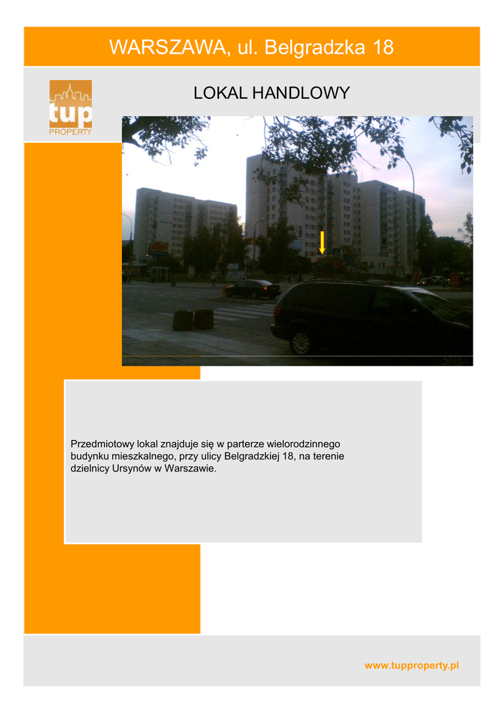 WARSZAWA, ul. Belgradzka 18 LOKAL HANDLOWY Przedmiotowy lokal znajduje się w parterze wielorodzinnego budynku mieszkalnego, przy ulicy Belgradzkiej 18, na terenie dzielnicy Ursynów w Warszawie. www.tupproperty.pl WARSZAWA, ul. Belgradzka 18 LOKALIZACJA Pawilon handlowy – własność TUP Property S.A. Rok budowy budynku: Powierzchnia całkowita: 373,64 m² Dzielnica Ursynów położona jest w południowej części Warszawy. Ulica Belgradzka biegnie prostopadle do trzech głównych osi komunikacyjnych Ursynowa, tj. alei Komisji Edukacji Narodowej, ulicy Stryjeńskich i ulicy Rosoła. Budynek, w którym położony jest Przedmiotowy lokal znajduje się w bezpośrednim sąsiedztwie al. KEN (w odległości około 100 m). Lokal jest bardzo korzystnie skomunikowany, nieopodal znajduje się stacja metra Natolin oraz liczne przystanki autobusowe. www.tupproperty.pl WARSZAWA, ul. Belgradzka 18 OPIS TECHNICZNY Lokal znajduje się w parterze wielorodzinnego budynku mieszkalnego. Lokal składa się z sali sprzedaży wraz z towarzyszącą częścią magazynową oraz biurową Powierzchnia użytkowa wynosi - 373,64 m². W jej skład wchodzi: powierzchnia biurowa - 19,54 m², handlowa - 233,71 m², magazynowa - 85,19 m² wspólna - 35,20 m². Opis techniczny lokalu: Konstrukcja: szkieletowa, słupy i stropy żelbetowe; Ściany osłonowe: murowane z cegły lub pustaka; Ścianki działowe: murowane z cegły lub wykonane z płyt kartonowo-gipsowych; Elewacja: tynk, płytki ceramiczne przy wejściu do lokalu Podłogi i posadzki: płytki ceramiczne; Wykończenie pomieszczeń: sufity podwieszane, ściany pomalowane farbą; Instalacje: - elektryczna, - wodno-kanalizacyjna, - centralne ogrzewanie, - wentylacja, - okablowanie telefoniczne. www.tupproperty.pl WARSZAWA, ul. Belgradzka 18 STAN PRAWNY Na podstawie aktu notarialnego Rep. A nr 19075/2007 z dnia 16 lipca 2007 roku oraz zawiadomienia Spółdzielni Mieszkaniowej „Przy Metrze” w Warszawie z dnia 15 listopada 2007 roku, spółdzielcze własnościowe prawo do lokalu użytkowego o powierzchni 373,64 m² usytuowanego w budynku przy ulicy Belgradzkiej 18 w Warszawie przysługuje TUP Property S.A. z siedzibą w Warszawie. Księga wieczysta Dla przedmiotowego spółdzielczego własnościowego prawa do lokalu została założona księga wieczysta WA5M/00438534/3, prowadzona przez Sąd Rejonowy dla Warszawy-Mokotowa. www.tupproperty.pl WARSZAWA, ul. Belgradzka 18 STAN PLANISTYCZNY Dla obszaru, na którym zlokalizowany jest przedmiotowy lokal nie istnieje miejscowy plan zagospodarowania przestrzennego. Zgodnie z obowiązującym Studium Uwarunkowań i Kierunków Zagospodarowania Przestrzennego m.st. Warszawy zatwierdzonym uchwałą Rady m.st. Warszawy nr LXXXII/2746/2006 z dnia 10 października 2006 roku przedmiotowa nieruchomość leży w strefie oznaczonej jako M1. Są to tereny o przewadze zabudowy mieszkaniowej wielorodzinnej. www.tupproperty.pl TUP PROPERTY Firma TUP Property zarządza portfelem wynajętych nieruchomości komercyjnych, w tym m.in. Centrum Handlowym City Point w Tychach, centrum logistycznym w Pruszkowie oraz szeregiem nieruchomości wynajętych przez firmę Jeronimo Martins Dystrybucja – właściciela największej sieci spożywczej w Polsce działającej pod szyldem „Biedronka”. TUP Property buduje i prowadzi sprzedaż mieszkań w kamienicy, przy ulicy Popularnej 38 w Warszawie. Budynek zostanie oddany do użytku w III kwartale 2013 r. Dotychczas firma zrealizowała klika projektów inwestycyjnych ( w tym m.in. Forest Hill w Katowicach) oraz jest zaangażowana kapitałowo w projekt budowy pierwszego w Polsce zrównoważonego miasta Siewierz Jeziorna. Na dzień 31 grudnia 2012 roku aktywa firmy wycenione zostały na 155,0 mln.zł. www.tupproperty.pl więcej informacji Katarzyna Kościelniakowska kom. 0 600 36 77 55 tel. (0 – 22) 250 88 35 [email protected] Biuro handlowe: TUP Property SA 05-800 Pruszków ul. Traktowa 6 Siedziba: TUP Property S.A. 00-108 Warszawa ul. Zielna 37 Tel: (4822) 250 88 35 NIP: 782-237-10-68 Tel: (4822) 250 88 20 Fax: (4822) 721 38 57 NIP: 782-237-10-68 www.tupproperty.pl